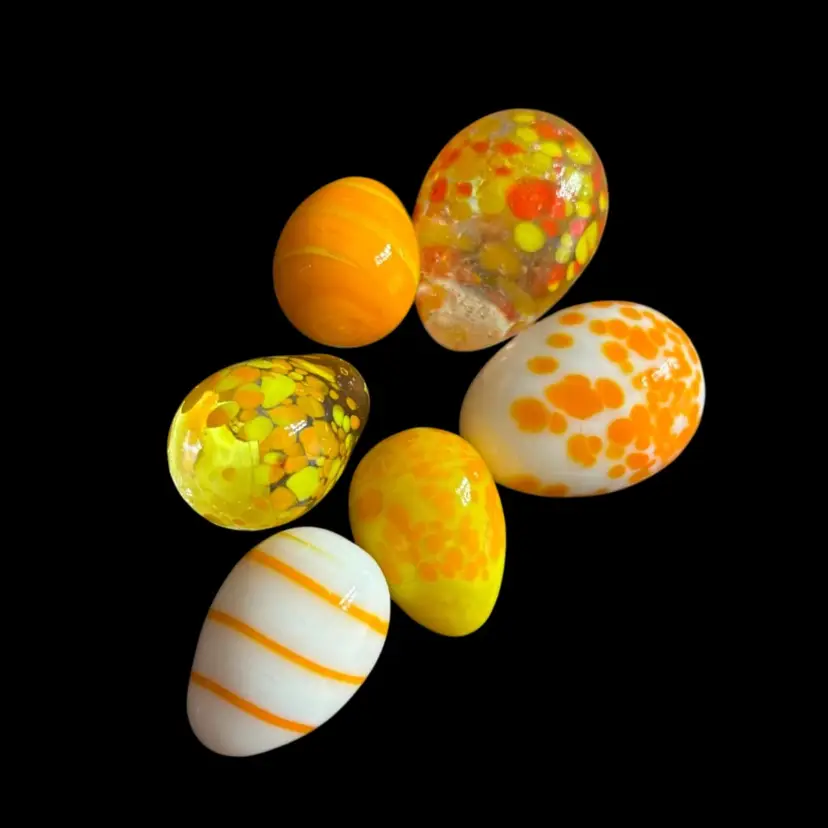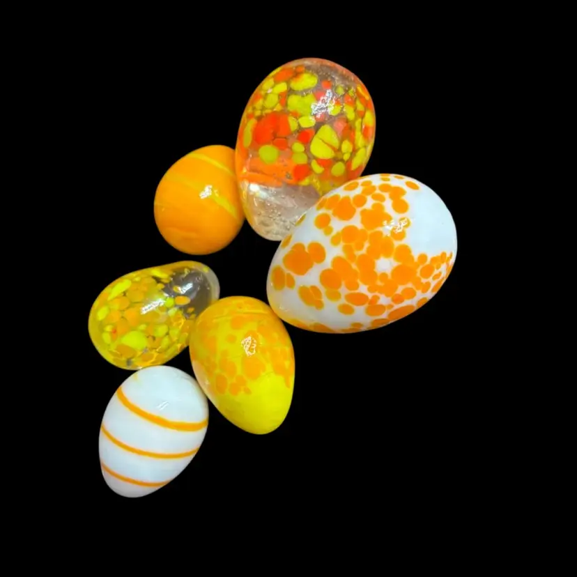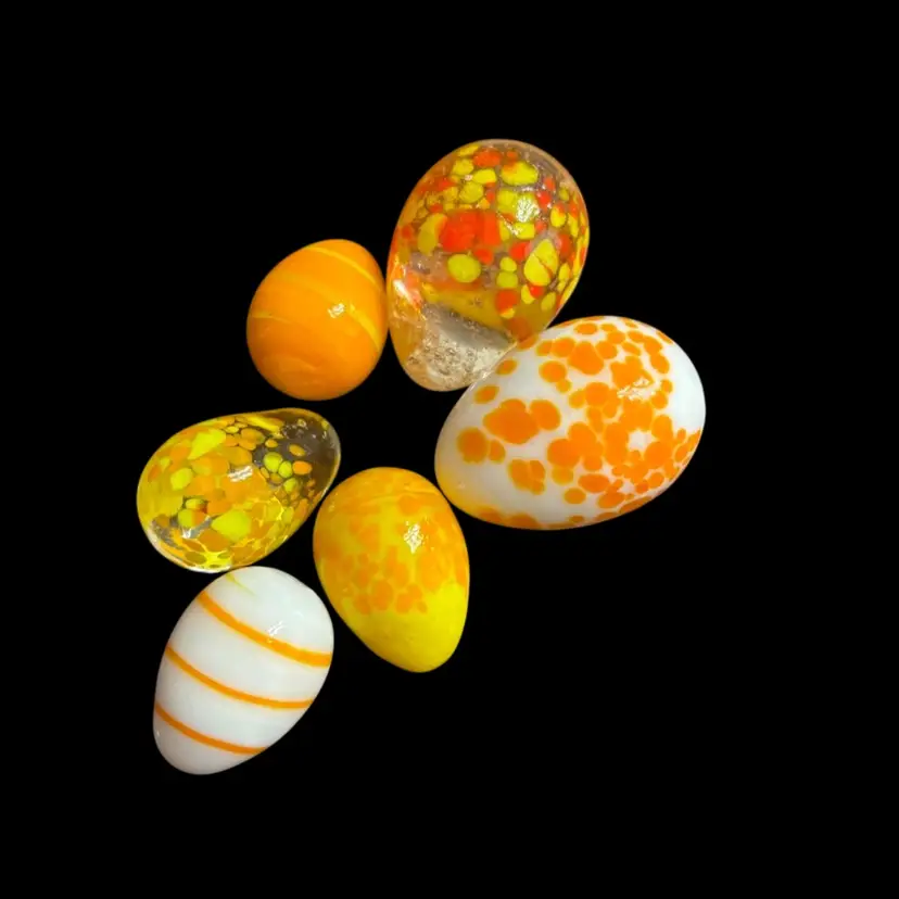 Lovely lot of glass eggs, orange, white and clear colours. 1-1.5”