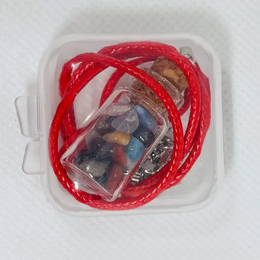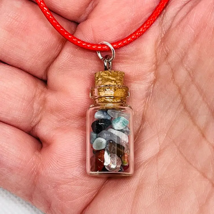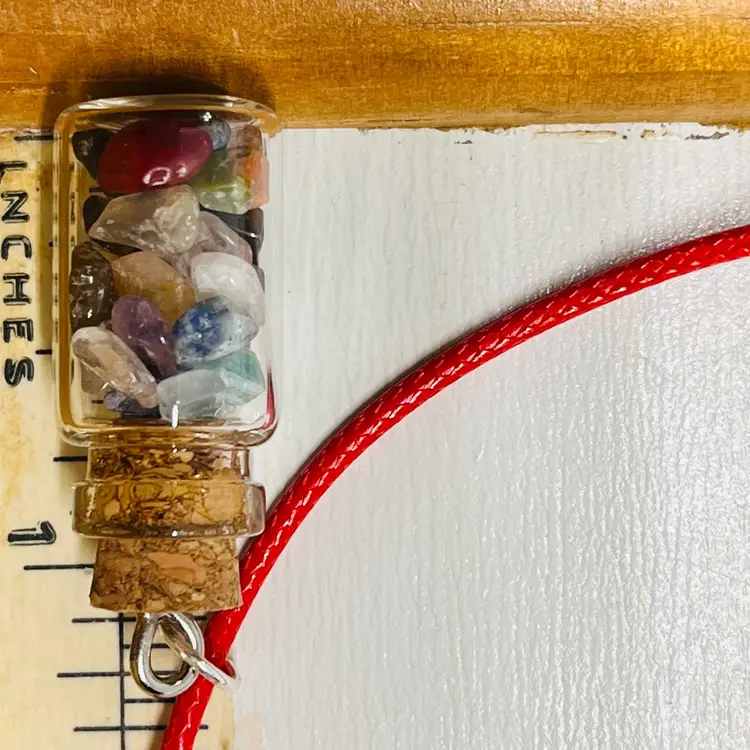Glass jar measures approx. 7/8” 18” red cord necklace with a 2” extender—I have 9 other colors available. If you’d prefer a different color cord, you MUST message me IMMEDIATELY because once I ship, it’s too late. crystals are NOT removable It will come in a clear plastic storage case. CRYSTALS INCLUDED: