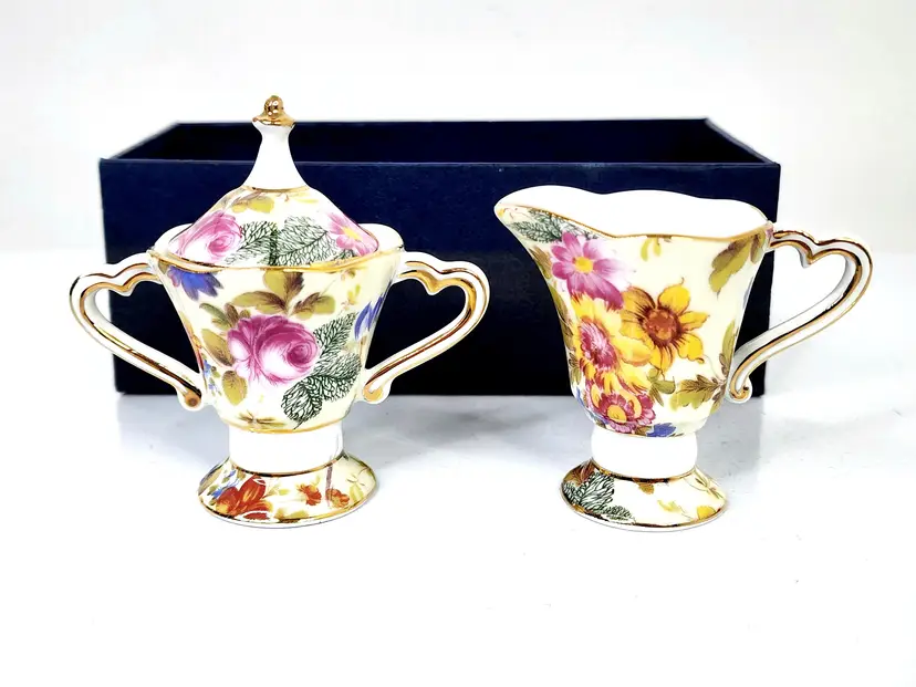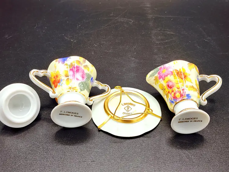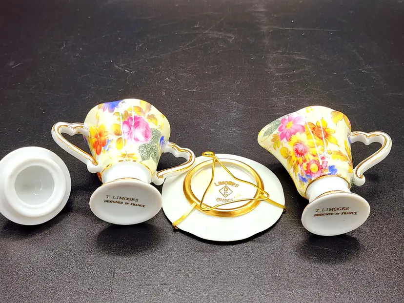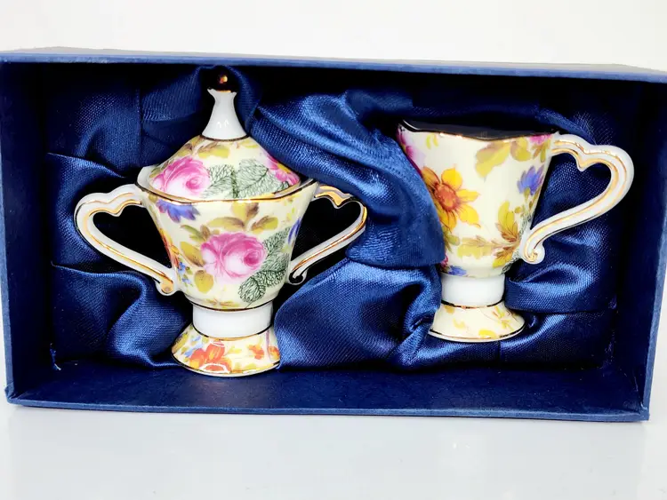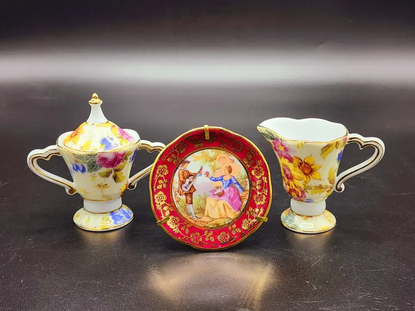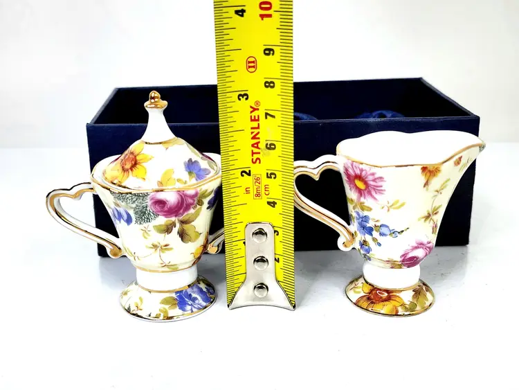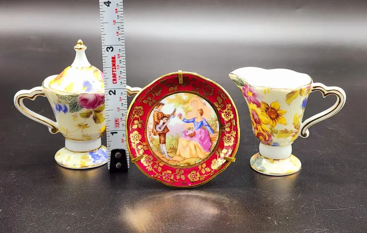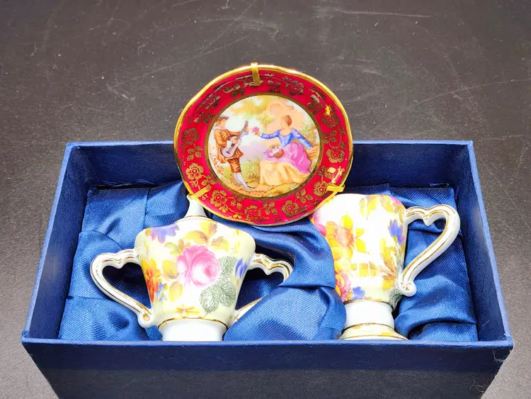 Very good condition, box missing the top part. Measurements: 3" tall. Plate is add on was not part of the set.