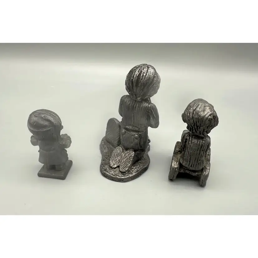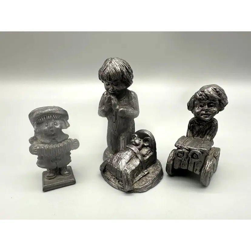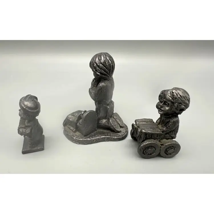 This charming trio of vintage pewter figurines captures the innocence of childhood with intricate detailing. Each figurine portrays a child in various heartwarming poses, reflecting thoughtful craftsmanship and timeless appeal. A delightful addition to any collection or as a nostalgic decorative piece.
