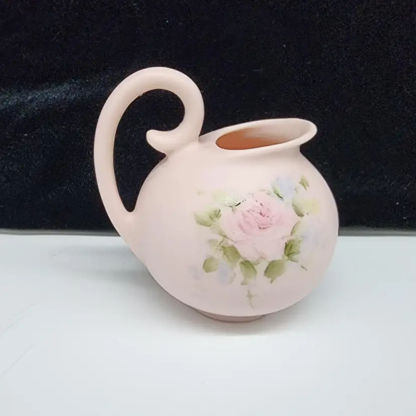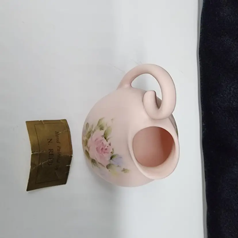 A charming Mini Pink Dresden Pitcher Creamer, embellished with delicate floral roses. This vintage mid-century modern piece is signed by Stines Dresden, adding authenticity and value. Perfect for collectors or as a unique decorative item. 2" tall • Mini Pink Dresden Pitcher Creamer • Floral roses design • Vintage mid-century modern • Signed by Stines Dresden • Ideal for collectors • Decorative and functional