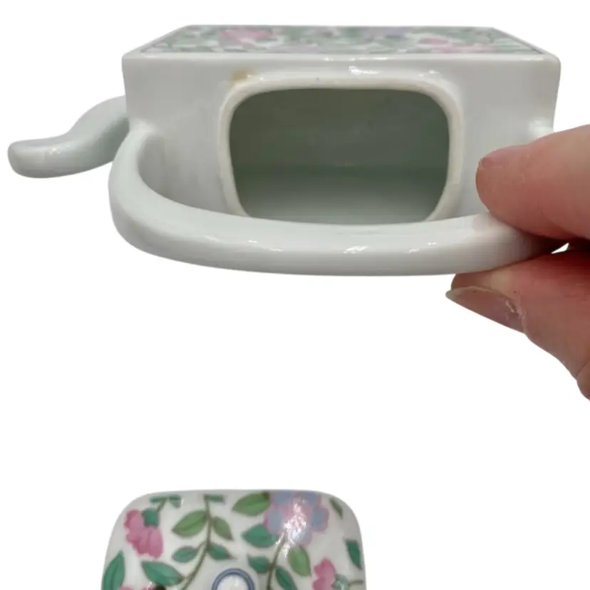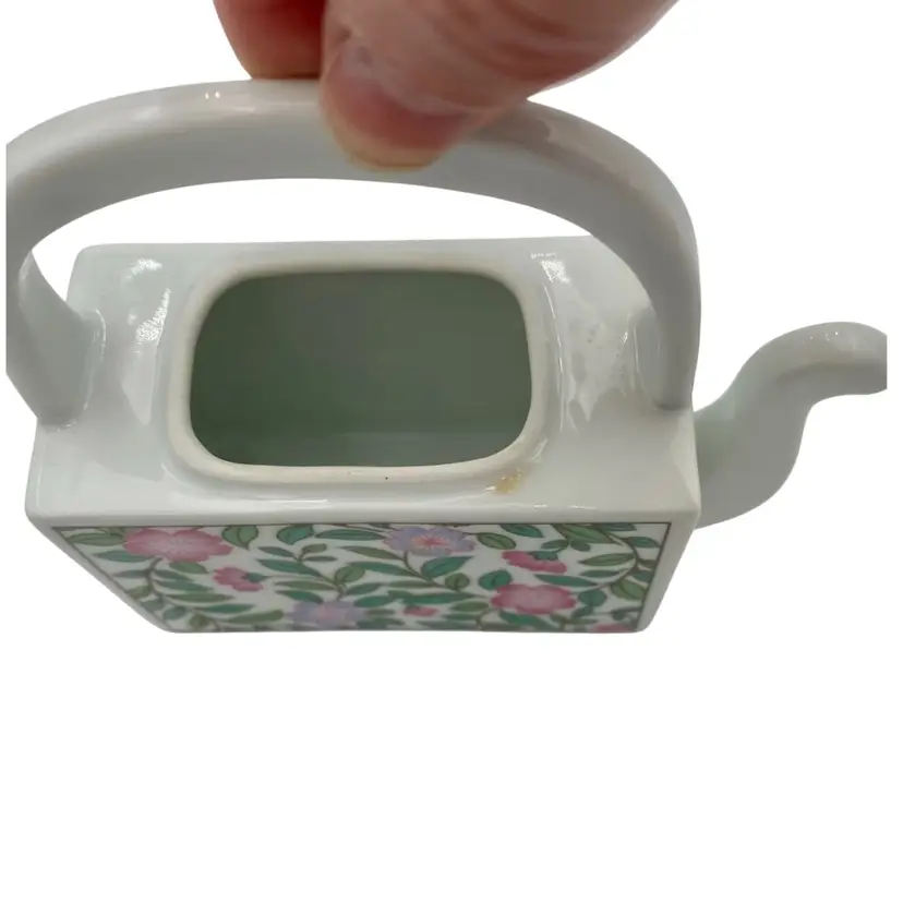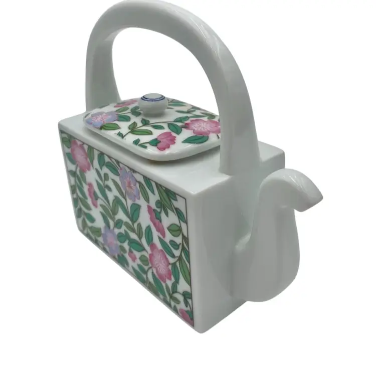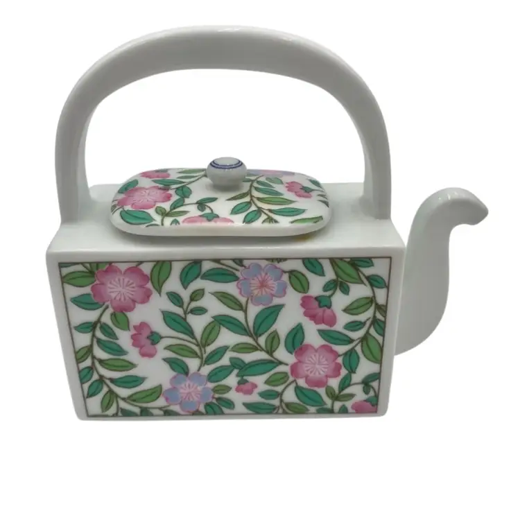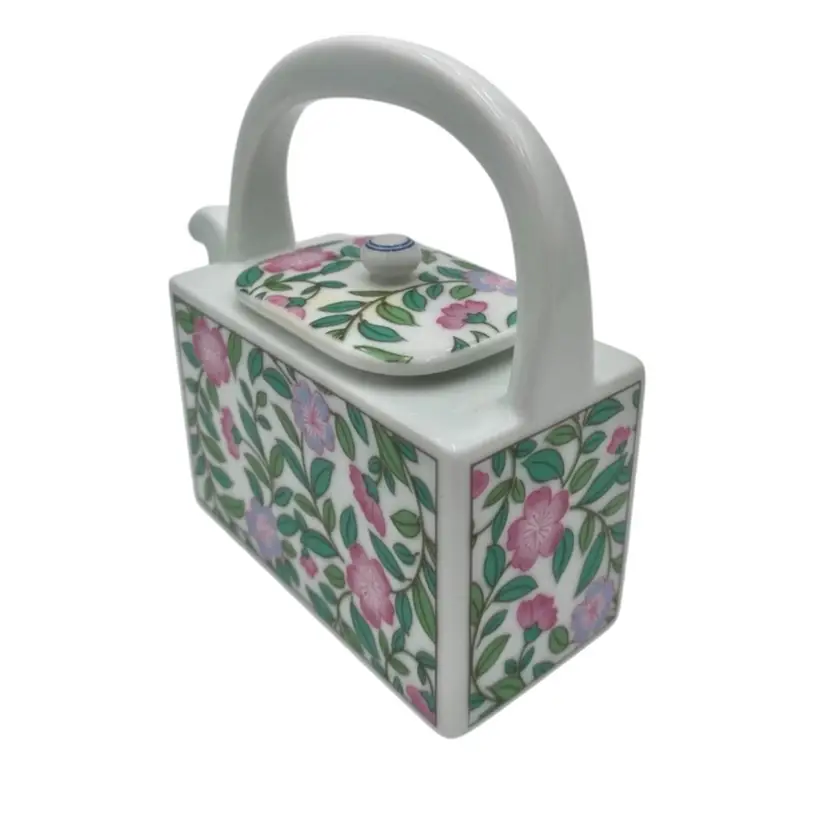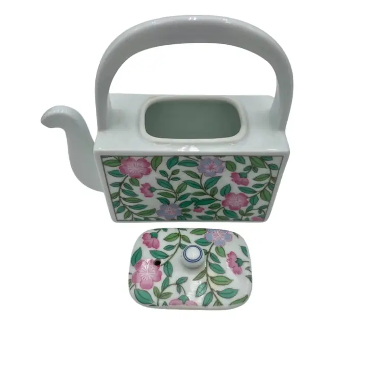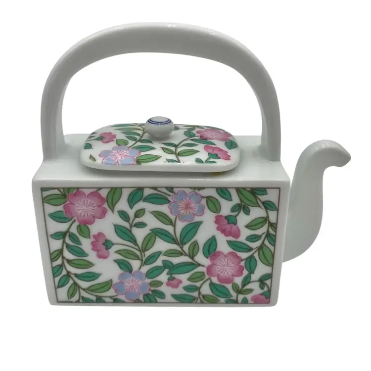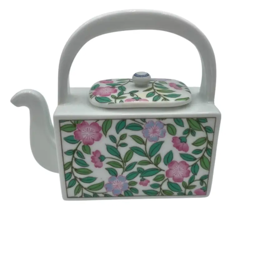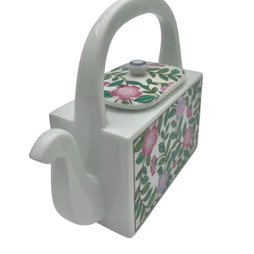 This small Porcelain Tea Pot with Lid features a charming floral pattern in pink, periwinkle, and green hues, perfect for a cottage core aesthetic. With a capacity of 6 ounces and measurements of 3.5 inches in height and 4.75 inches in length, this contemporary styled teapot is ideal for a single cup of tea. This is a decorative yet functional piece, with a vented lid with knob handle.
