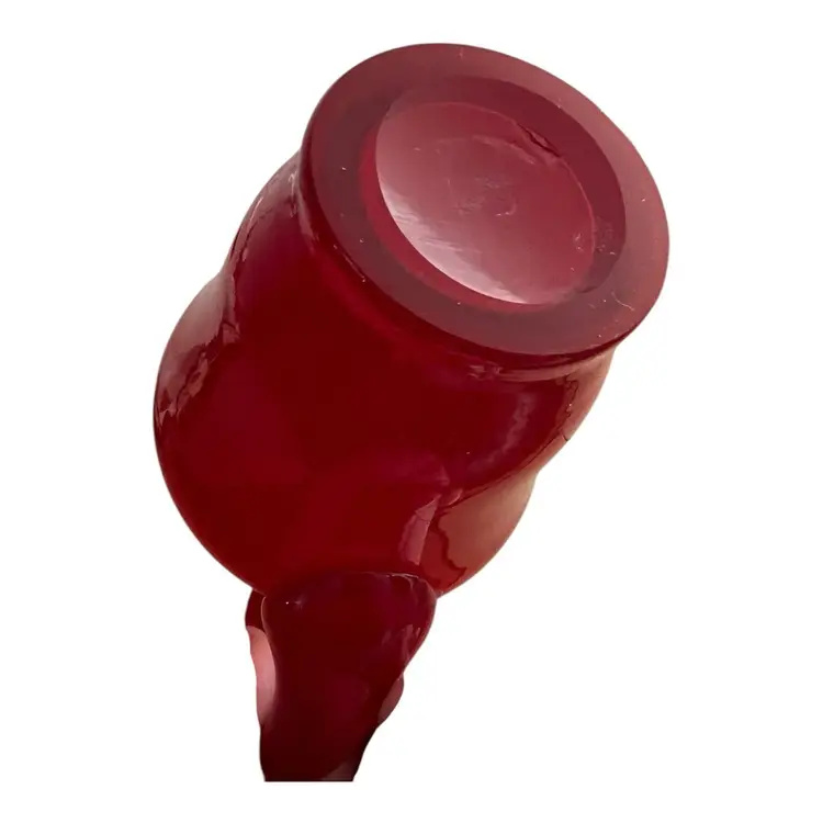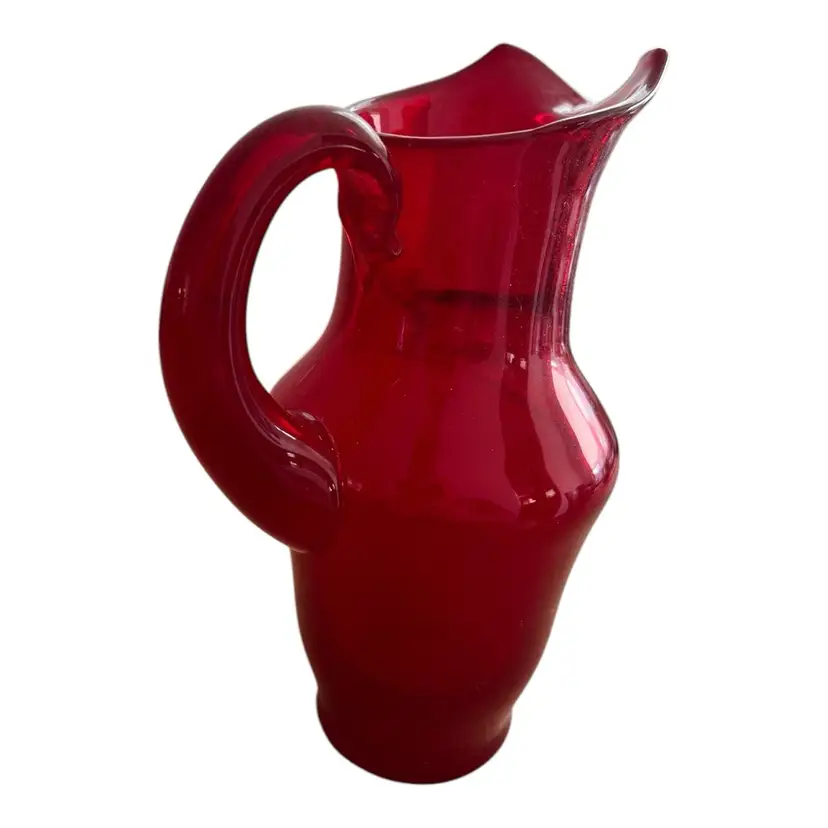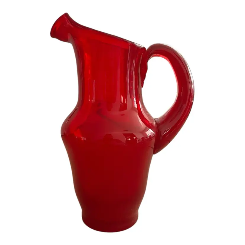 This mini red glass vintage pitcher is a unique addition to your collection. With its solid pattern and hand-blown glass production technique, it exudes art glass quality. The pitcher is unmarked, adding to its mysterious charm.