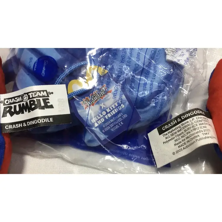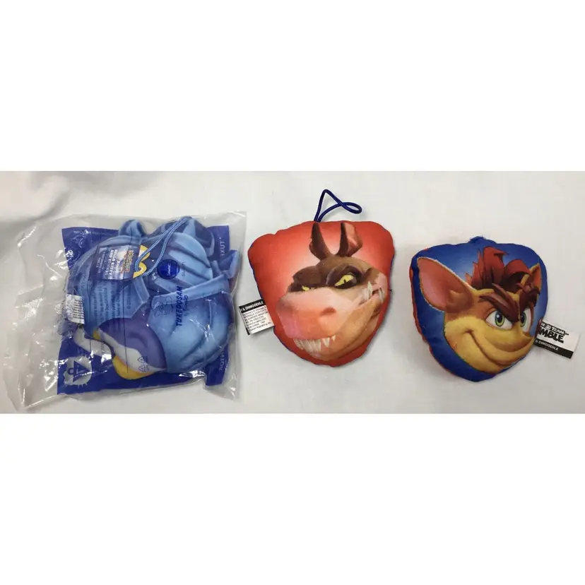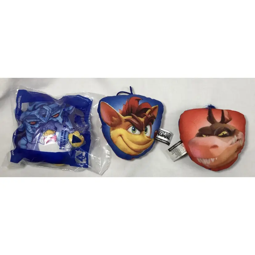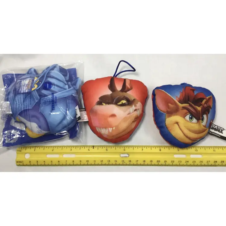 Approx, 3 inches by 4 inches, fabric, stuffed pillow figures, 2 are used, double sided, Crash Bandicoot and Dingodile. Other is Yu-gi-oh, brand new in package, front and back view of Tuxedo Sam and Obelisk the Tormentor. One of the Crash pillows is missing its cord for hanging.