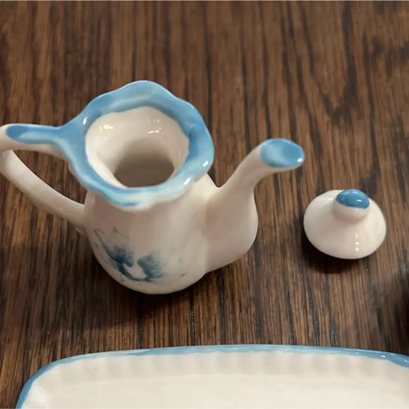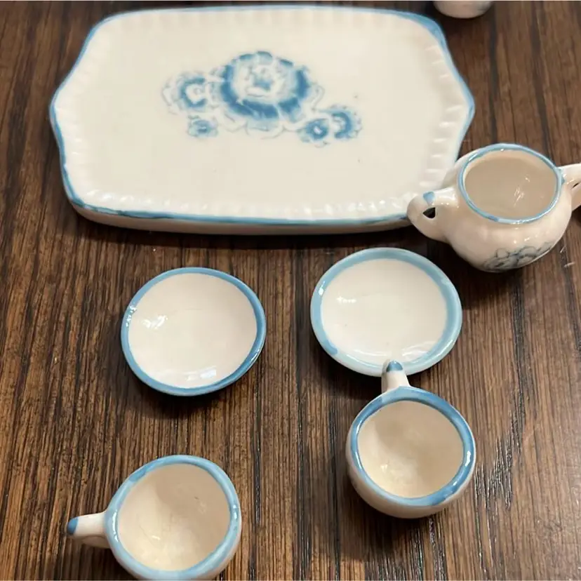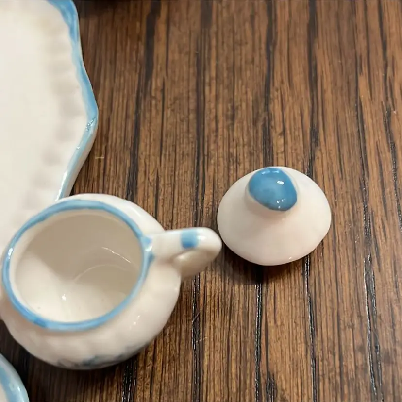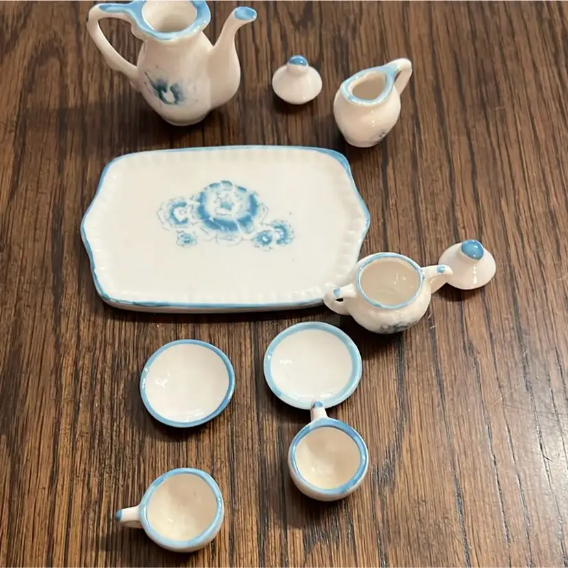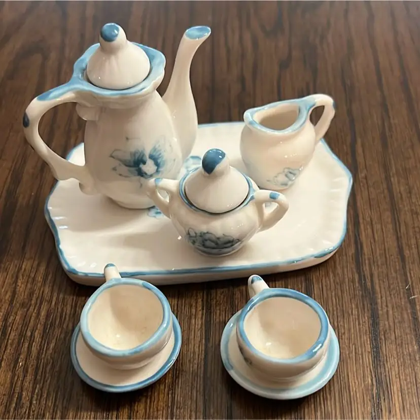 Mini porcelain tea, set picture creamer, sugar, 2 cups, saucers, white floral. Preowned.