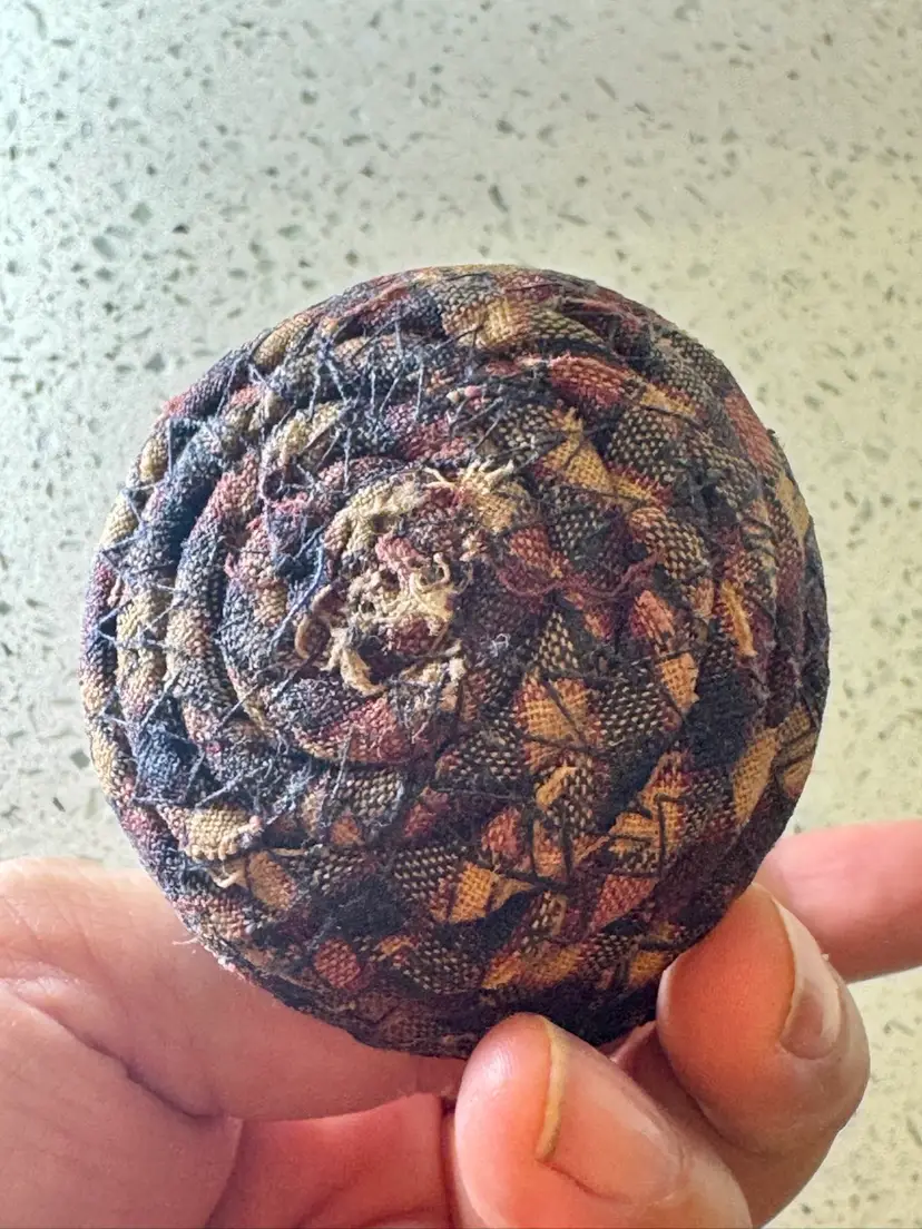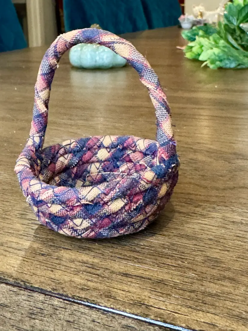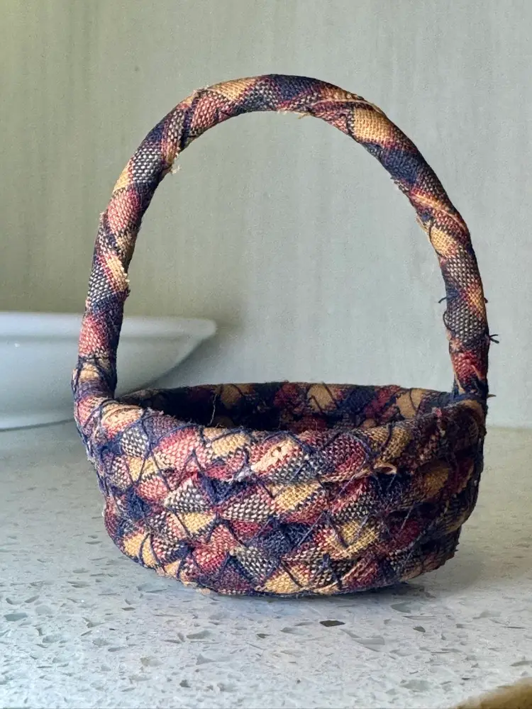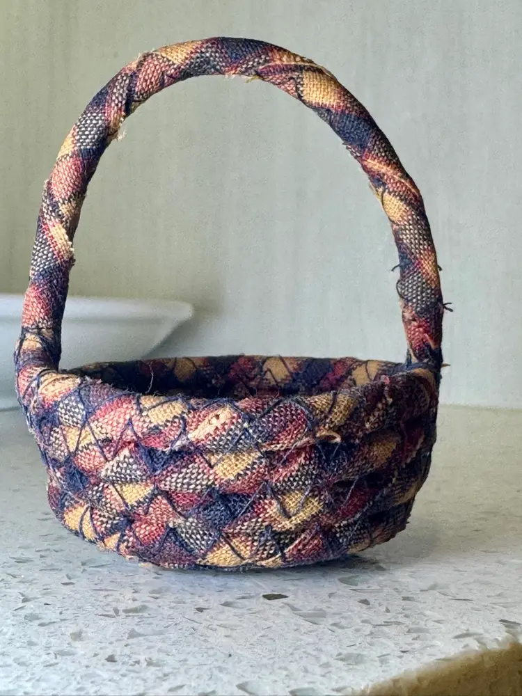 Vintage Hand Made Multicolor Coiled Fabric Mini Basket with Handle. Approx. 3" tall including handle x 2.5" in diameter. Basket is approx. 1" deep. Fabric has been starched; the basket is hard and stiff. As found condition - some loose threads from the edges of the material, but the basket is solid and ready for display!