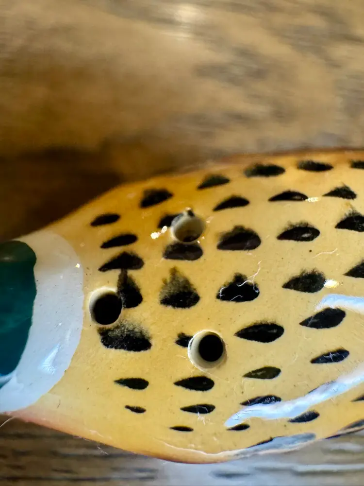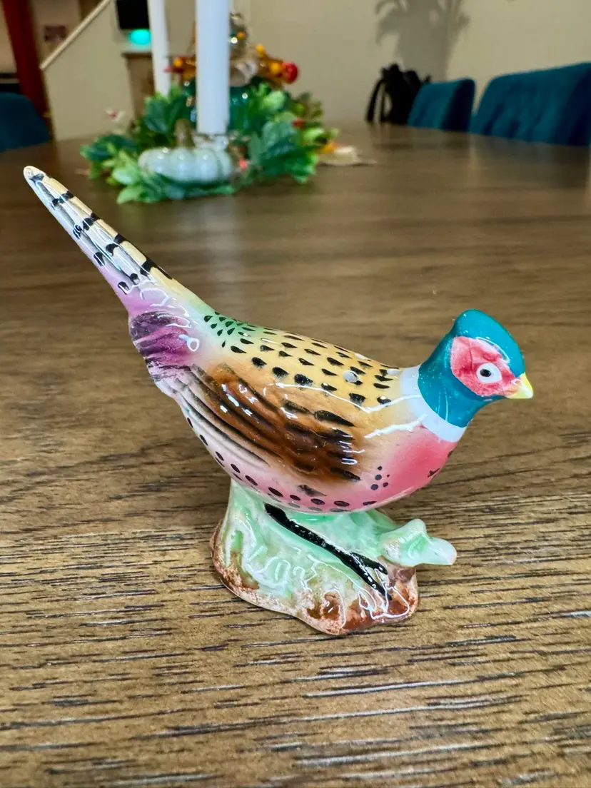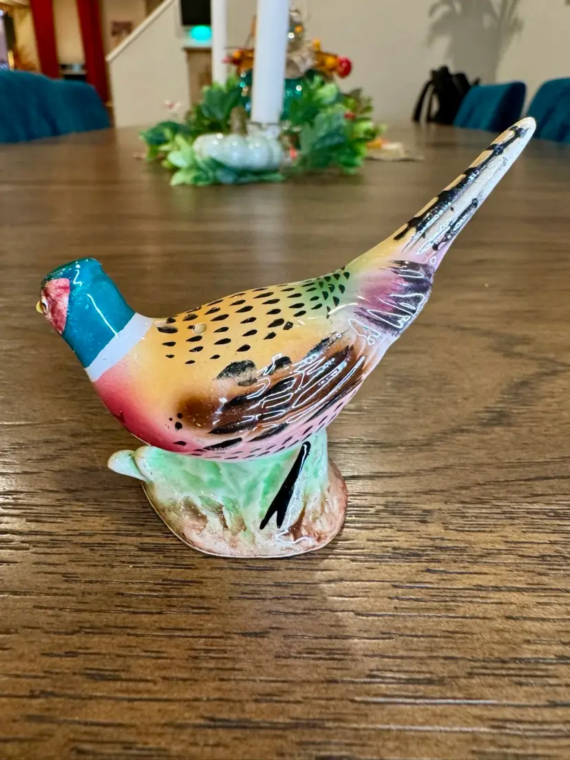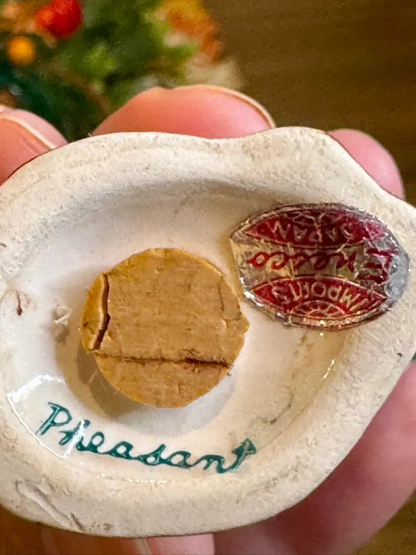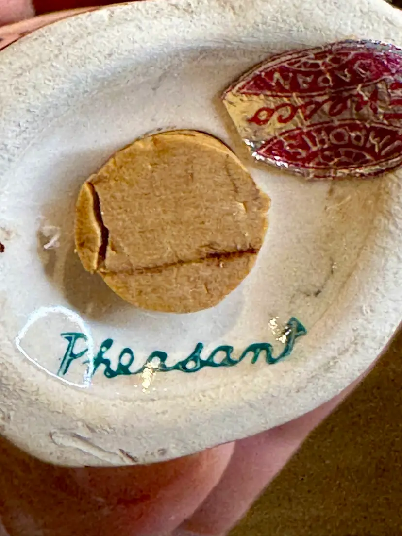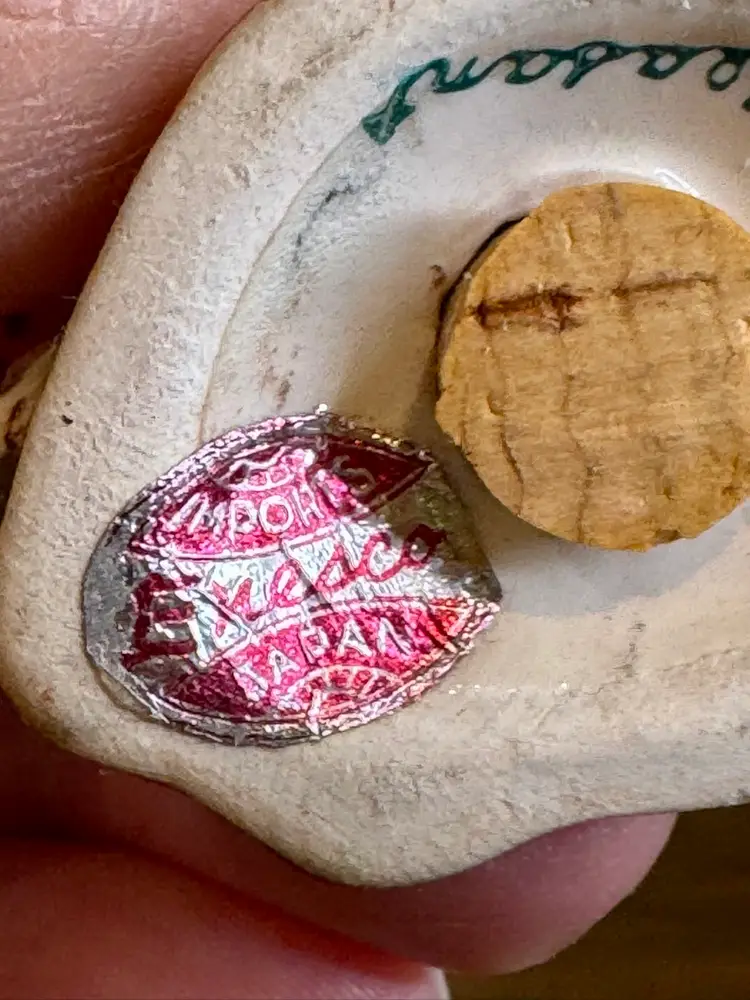 foil sticker that reads "MADE IN JAPAN" and "ENESCO." This sticker is a maker's mark often found on vintage ceramic figurines and collectibles, particularly those from the mid-20th century. 2.5 x 3 inches