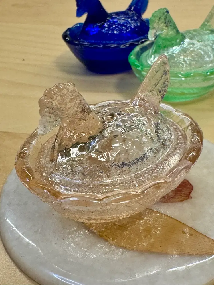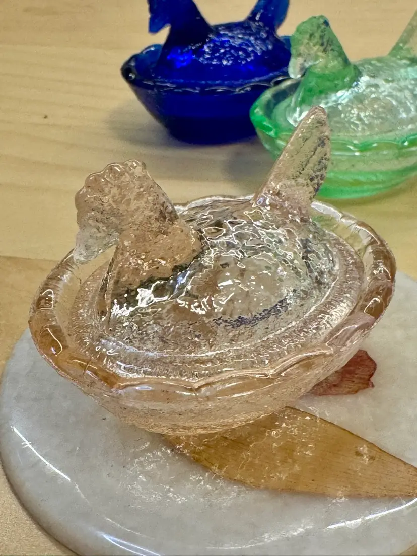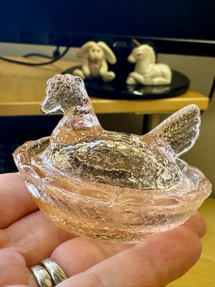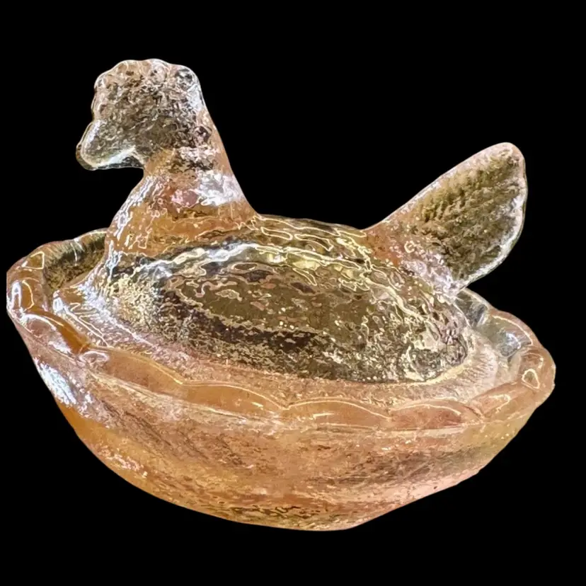 Mini Vintage Pink Glass Hen on Nest | Miniature Salt Cellar | Pinch Bowl | Depression Glass Style by L.E. Smith | Cottagecore Kitchen Collectible. 2.5 inches