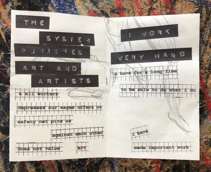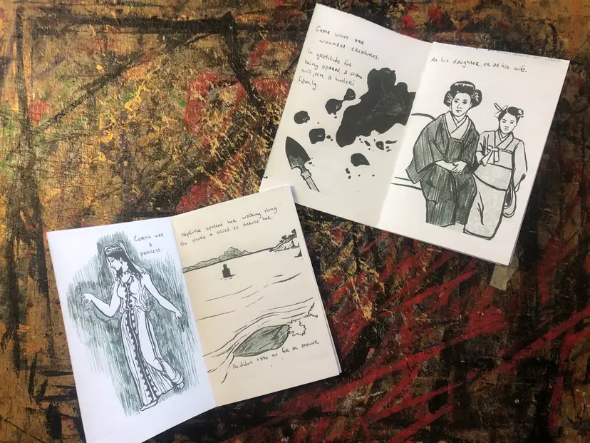 A collection of 5 folded mini-zines including: Cornix, Crane Wives, Competing Thoughts About My Artistic Practice, Never Kiss Me, and That's What I Want. These zines are various subjects like mythological shape-shifting women, found poetry, and working as an artist in late-stage capitalism. Zines are 8 pages each, approx 2.75" x 4.25", 2 are full color and 3 are black and white.