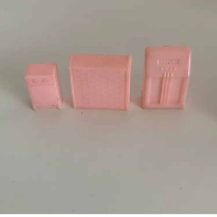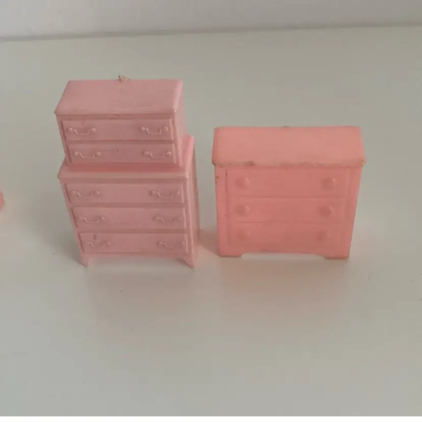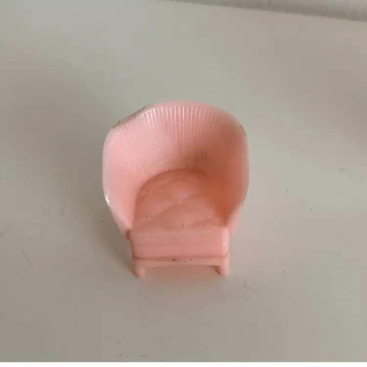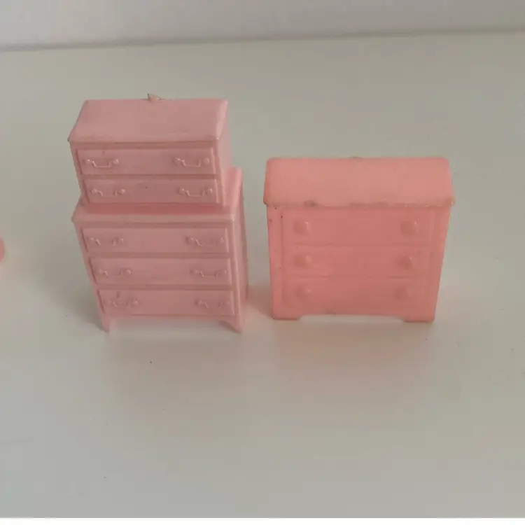 Midcentury 8 piece miniature dollhouse furniture. The set contains an old style radio, dressers and more. I am note sure of the actual scale. For reference the blue dresser measures 1 1/2” tall. Made from hard plastic. Marked Allied USA and MAR on the backs. Note the arm chair has a melted spot in last photo.