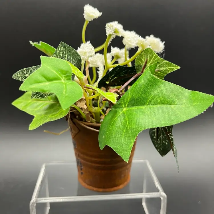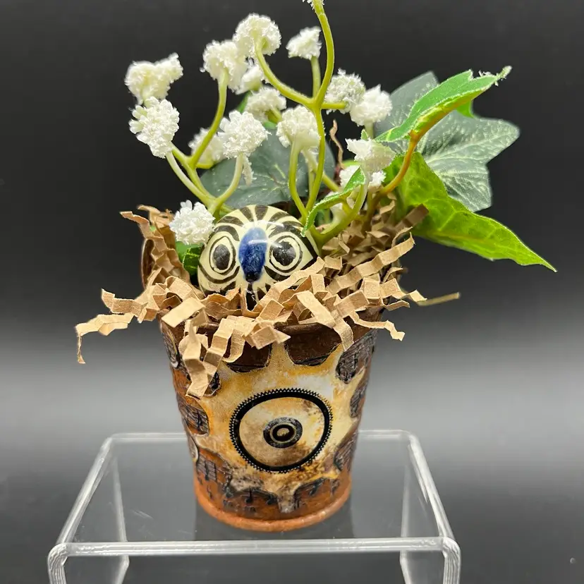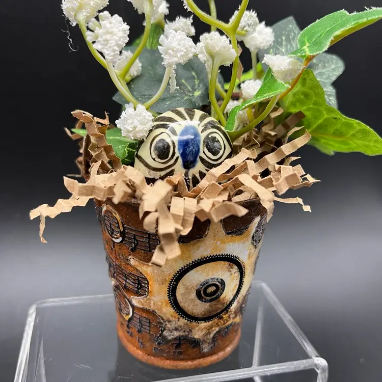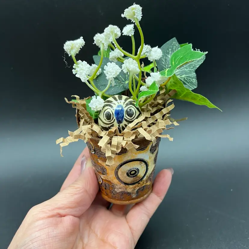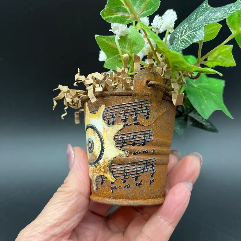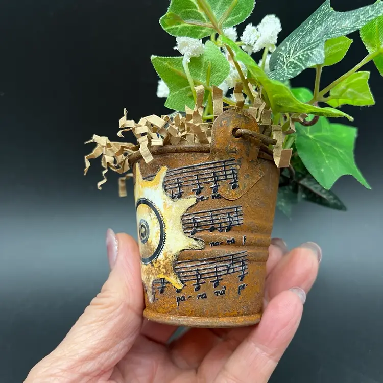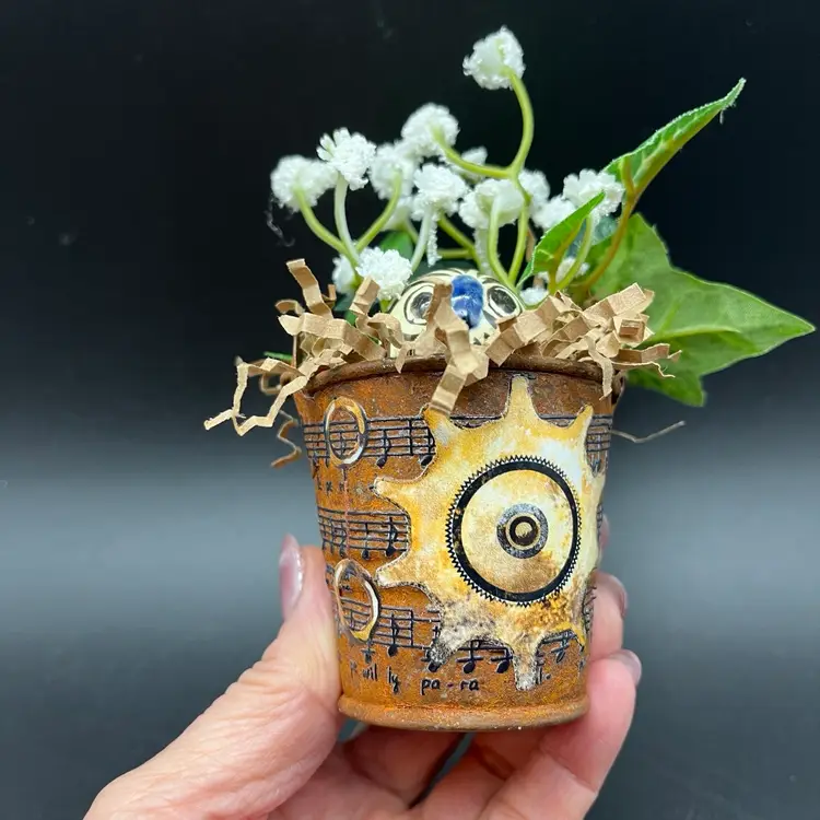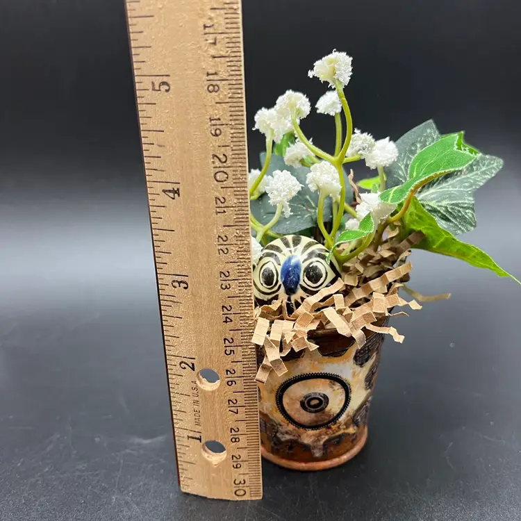 Miniature Tonala Owl was damaged, and given new life in this mini assemblage. Rusty pail embellished with transfer