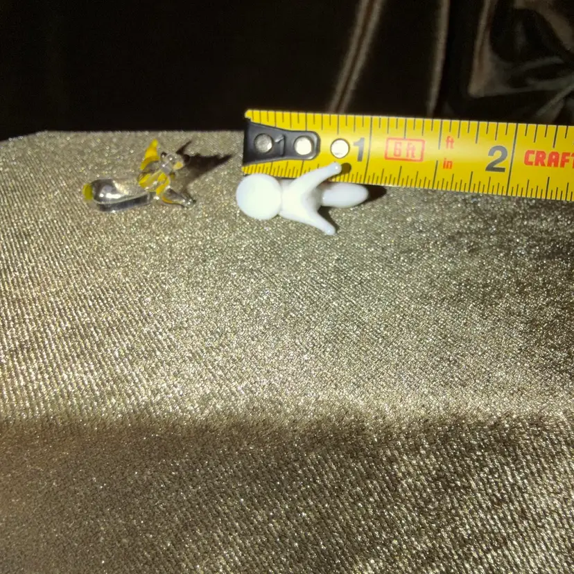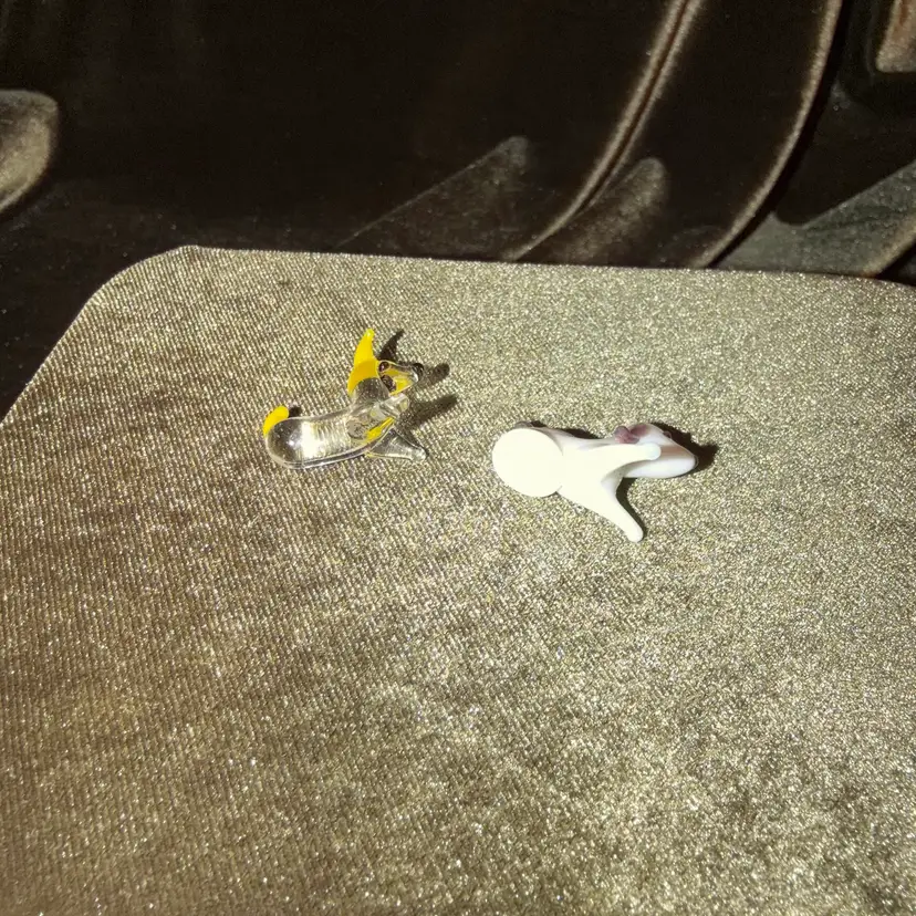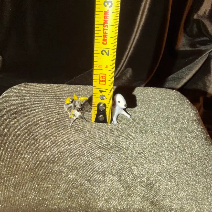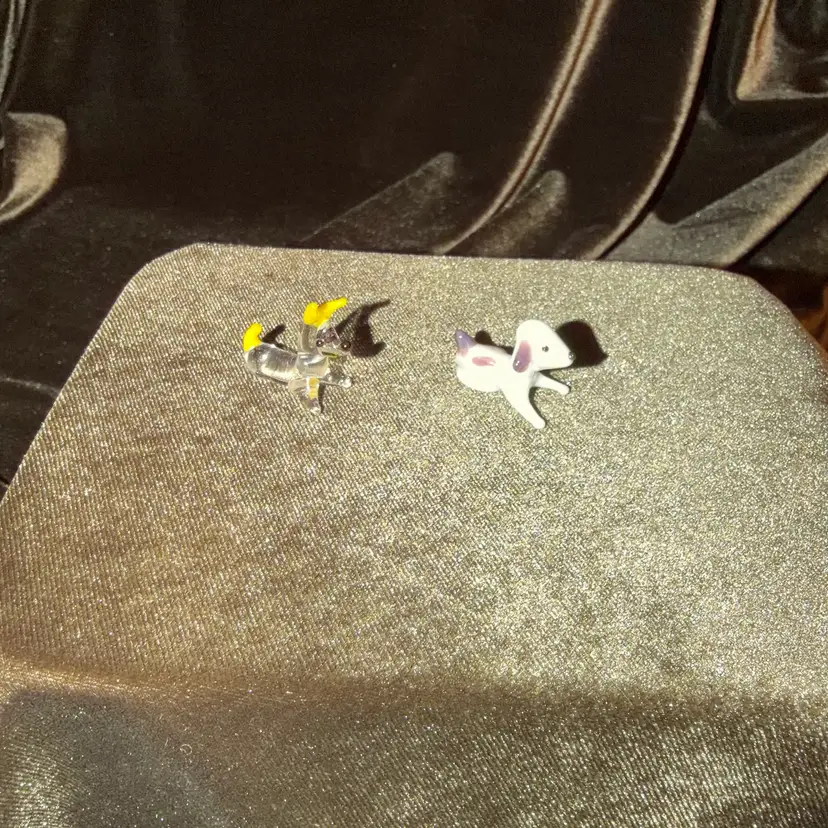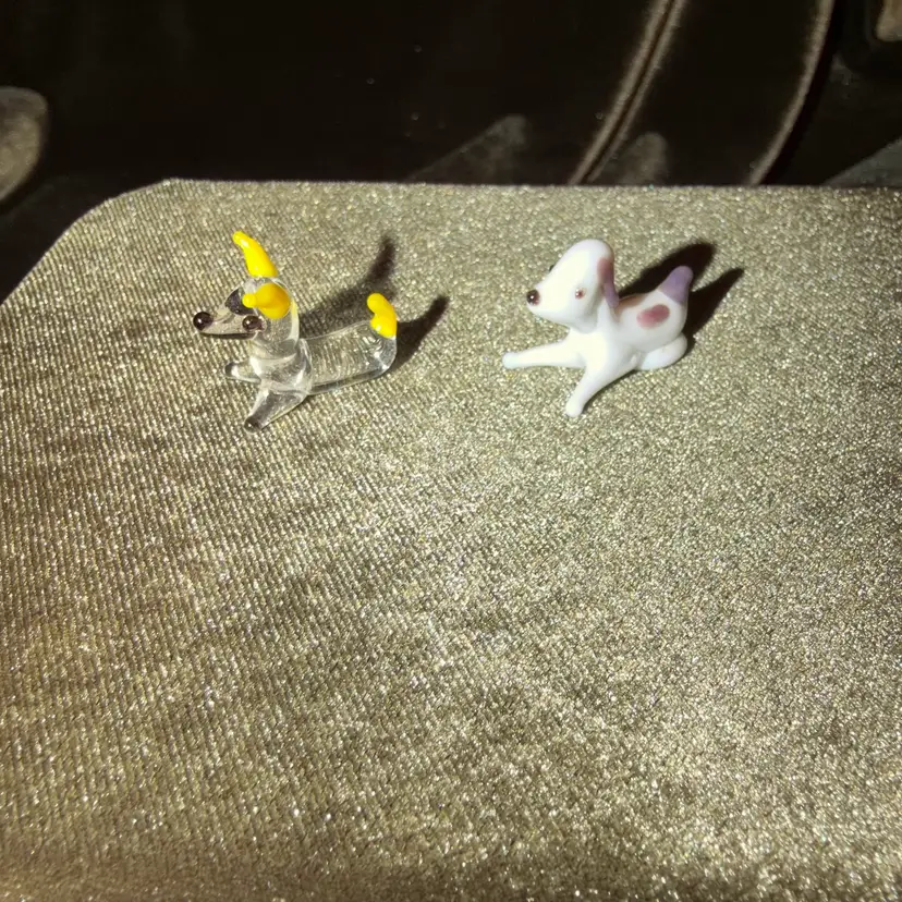A pair of miniature blown glass dog figurines, one clear with yellow accents and the other white with brown spots, typical of decorative collectibles.
