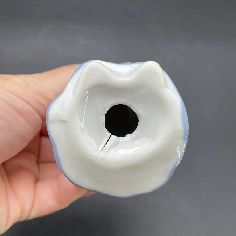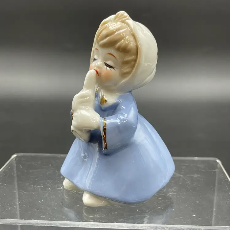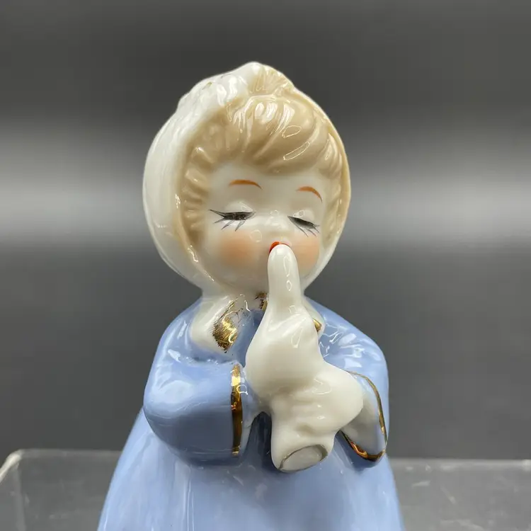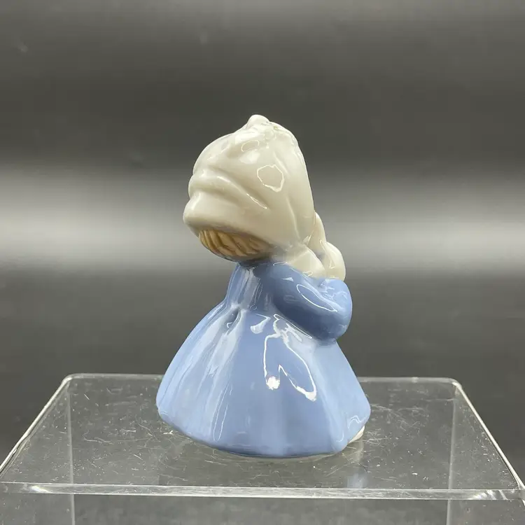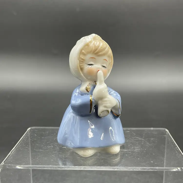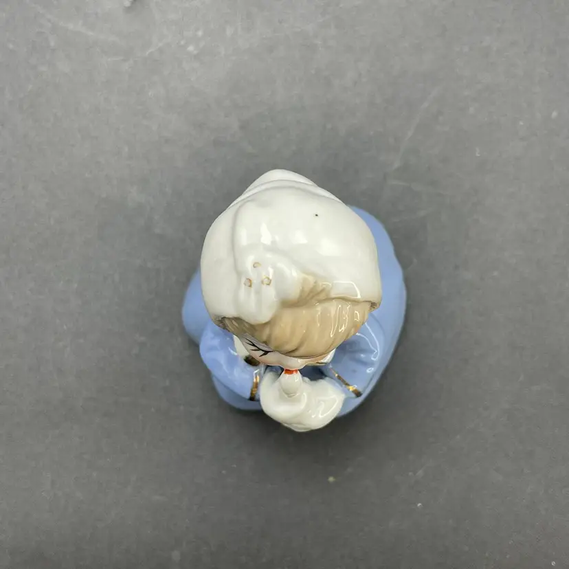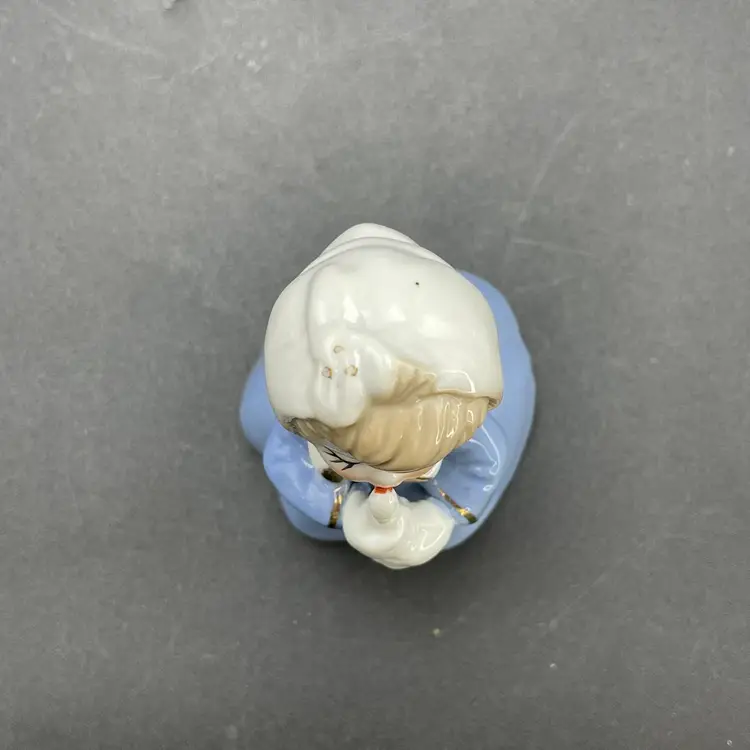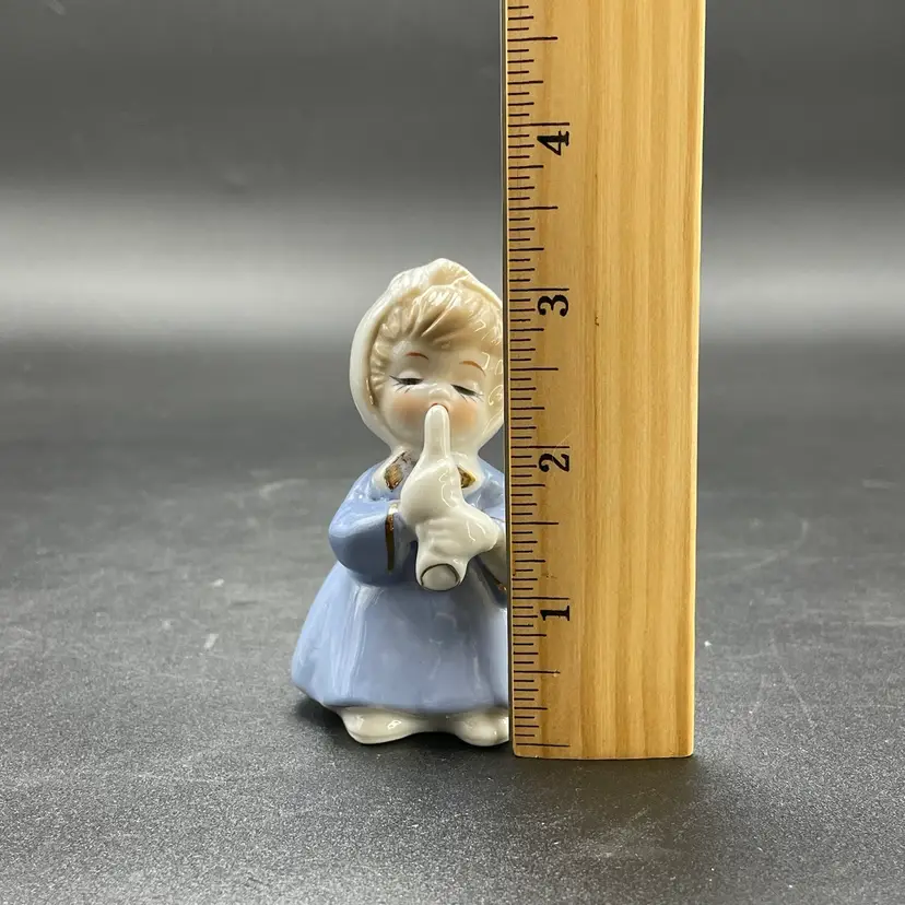 This is a vintage miniature blue porcelain girl playing an instrument figurine. Measures approximately 3.25" tall. No chips or cracks.