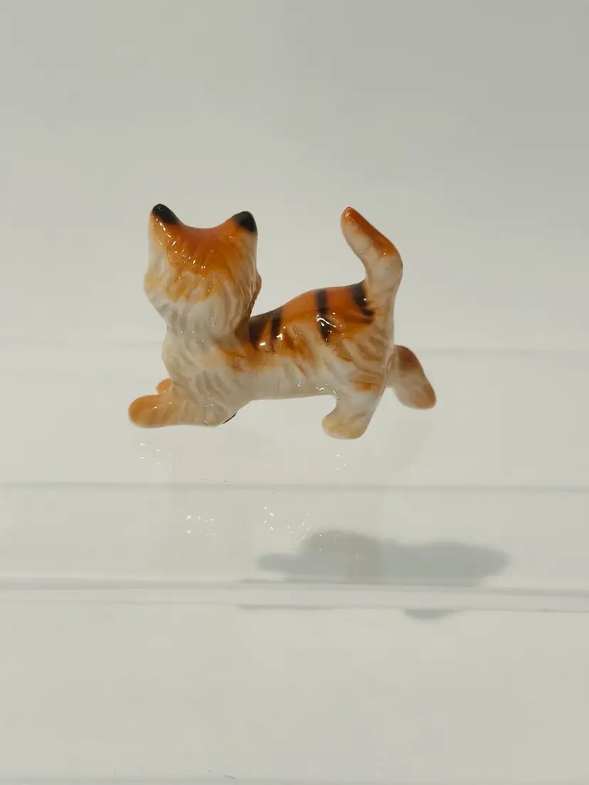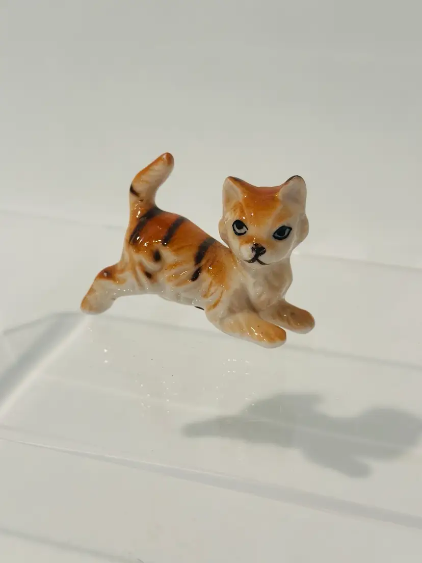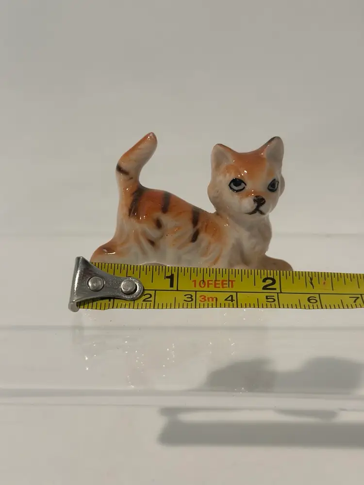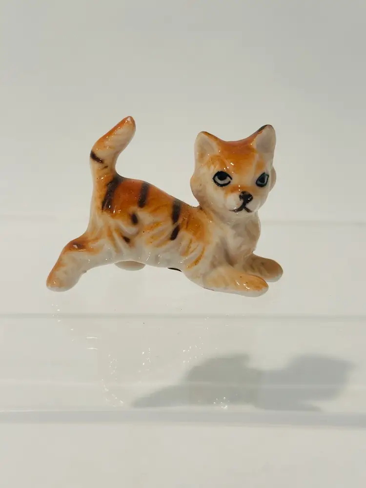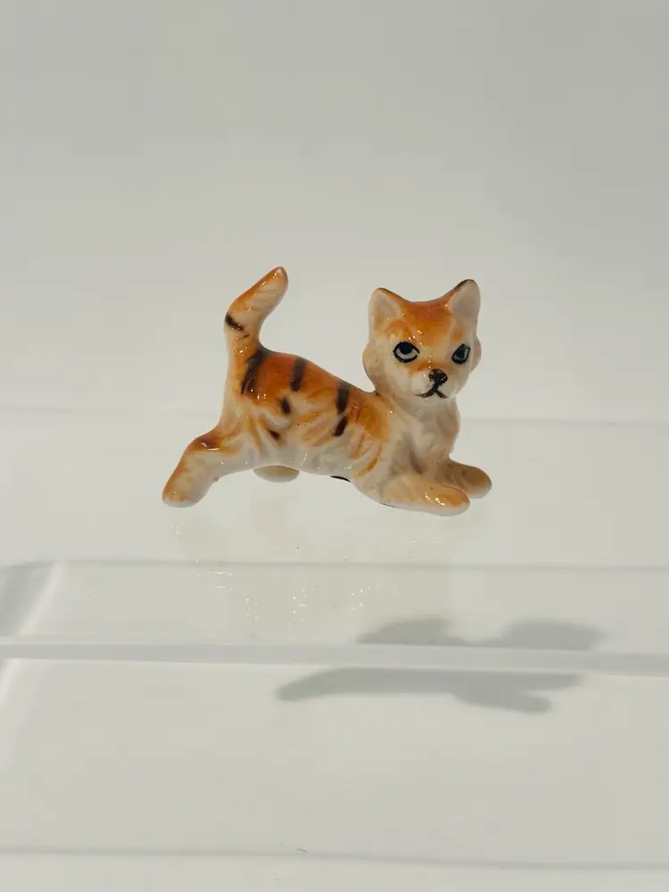This charming miniature figurine features a playful cat made from fine bone china. With a height of 1.5 inches, it is perfect for collectors or as a decorative piece. The cat is beautifully crafted with intricate details, including orange, black, and white coloring that adds to its appeal.