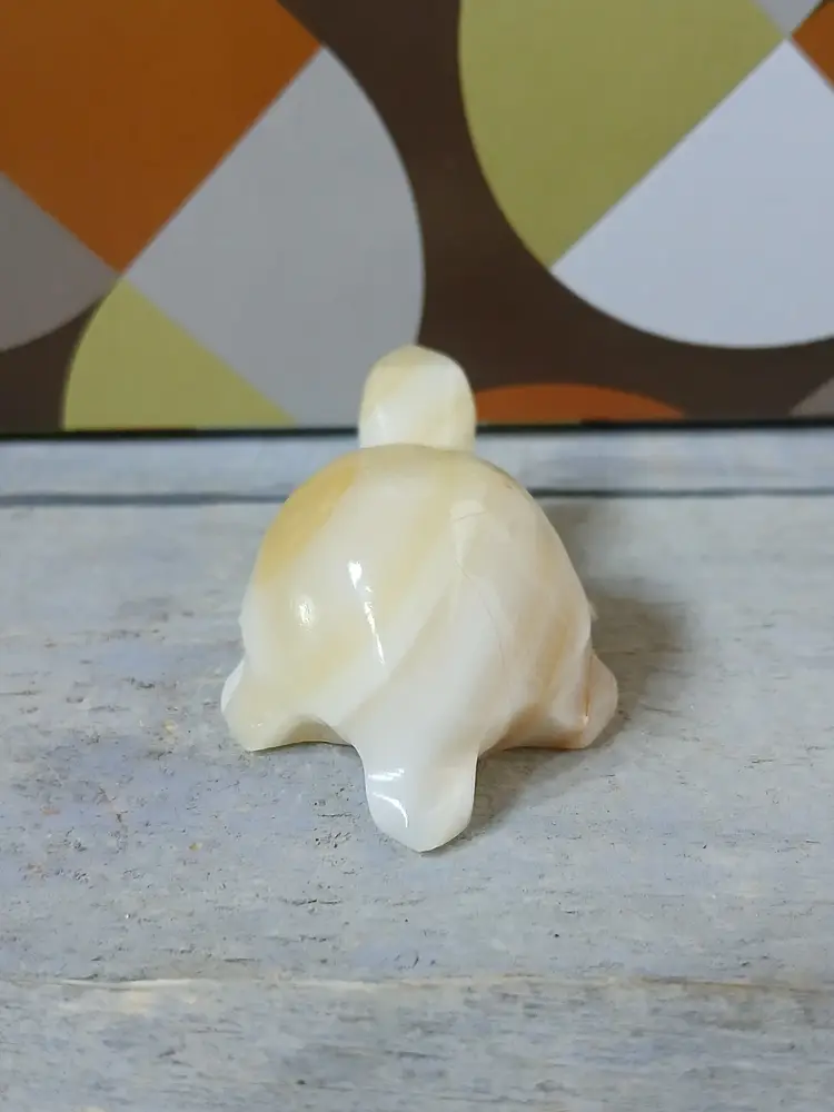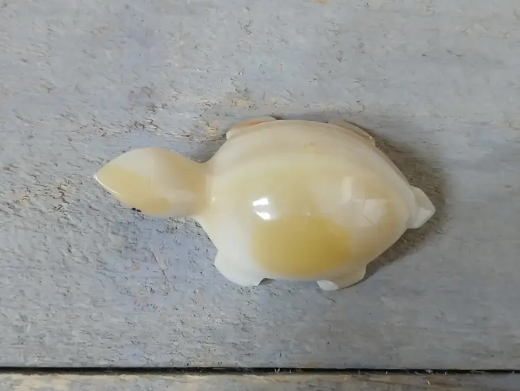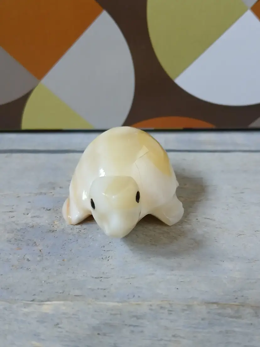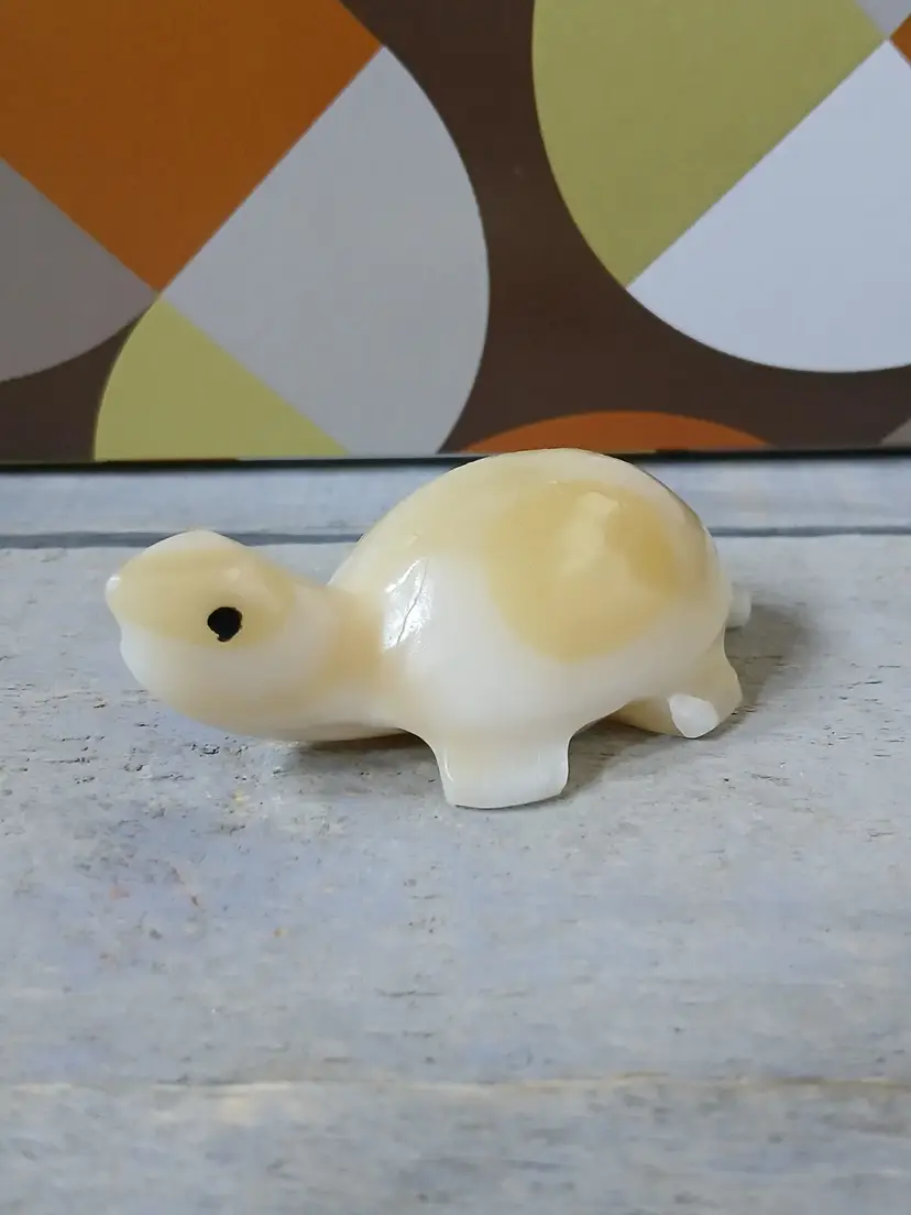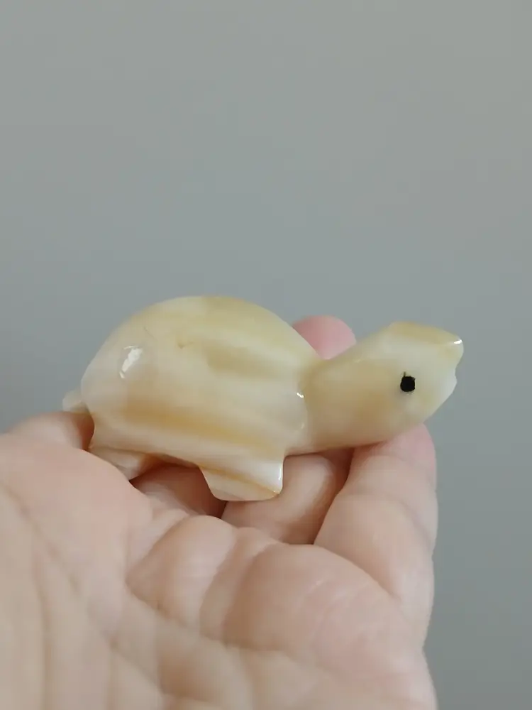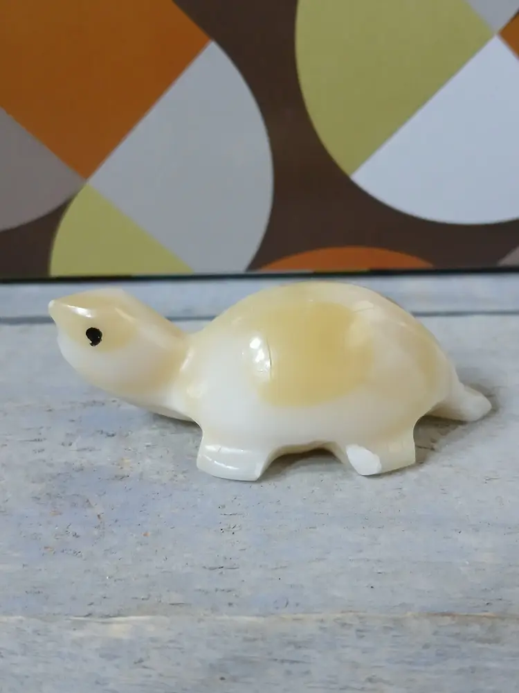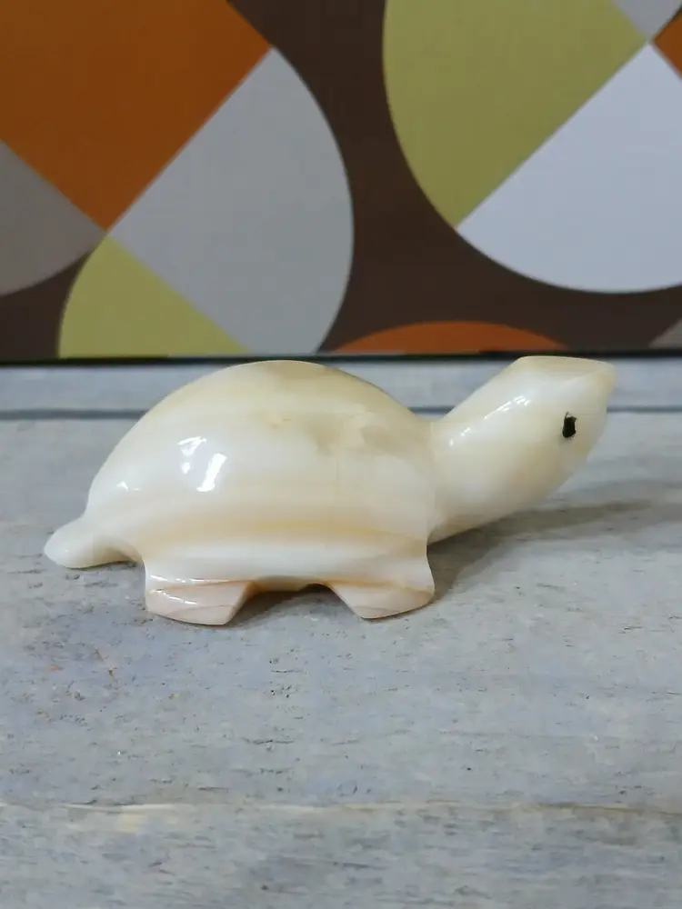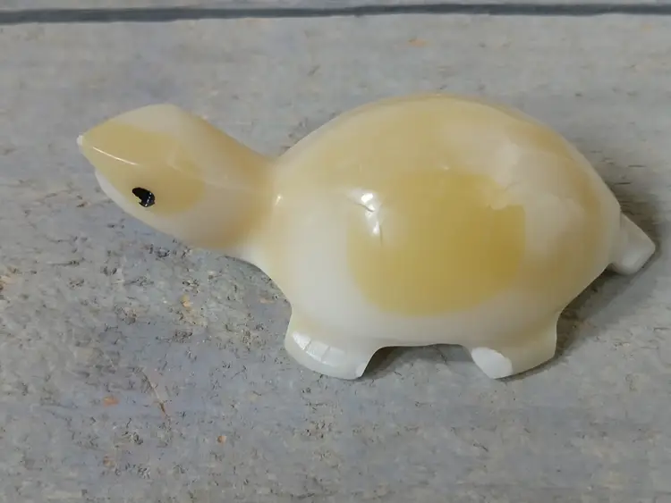 Sweet vintage miniature carved stone turtle figurine. Measures approximately 3" long. In very good pre-owned condition, with 1 small chip on a leg.