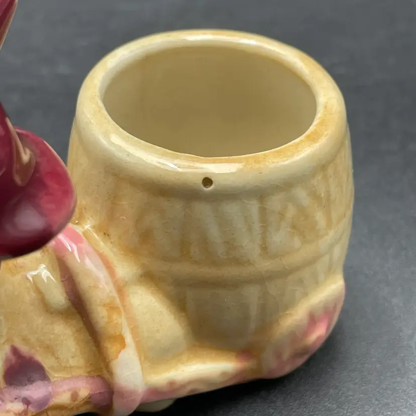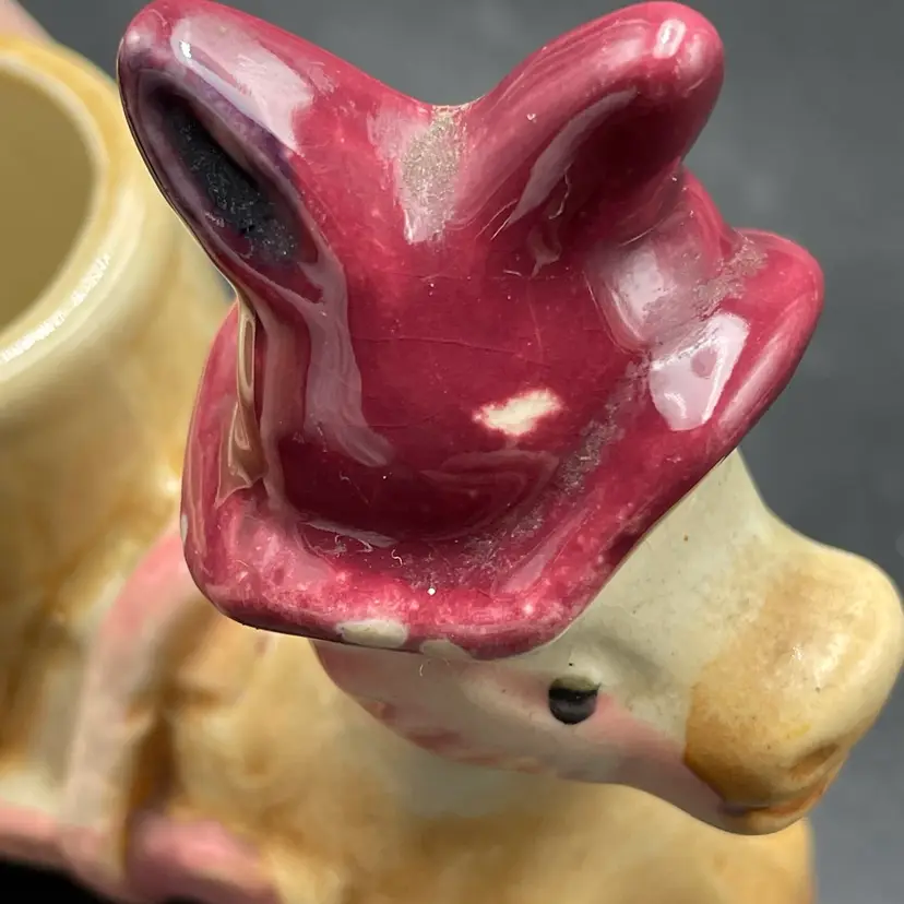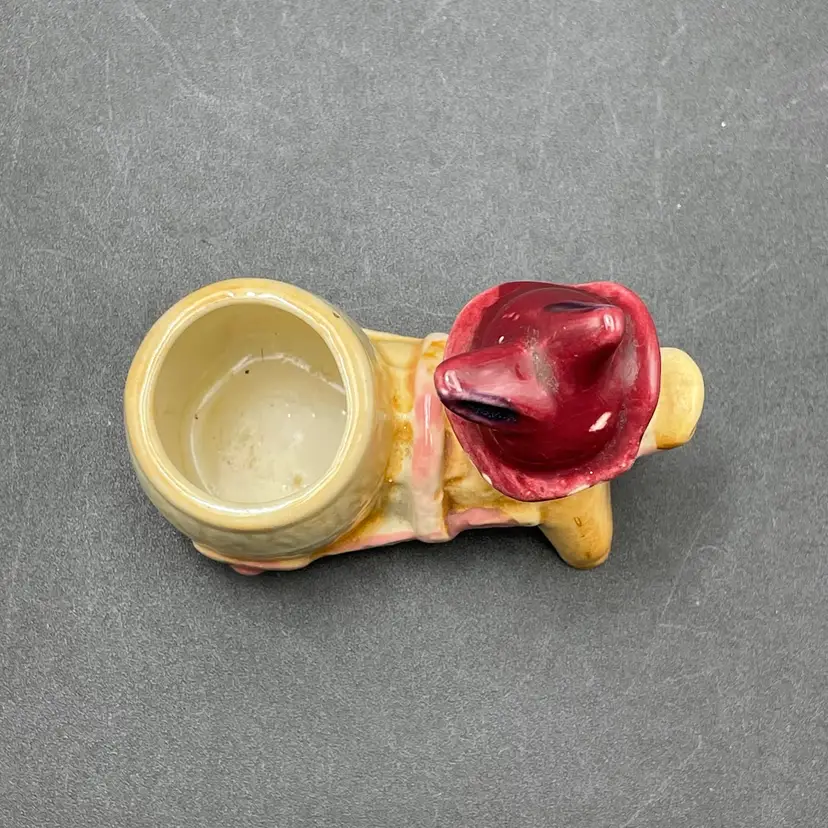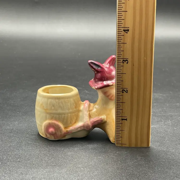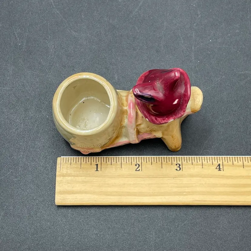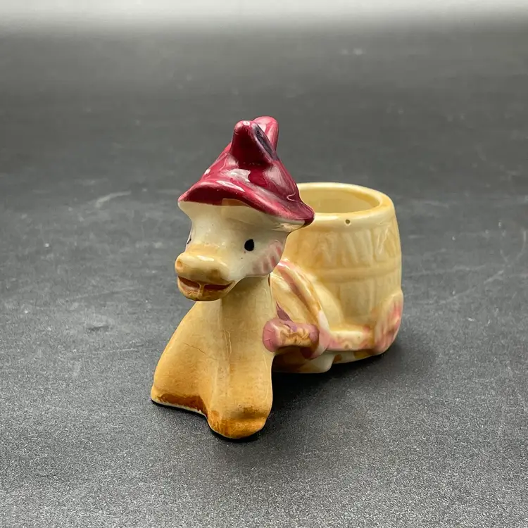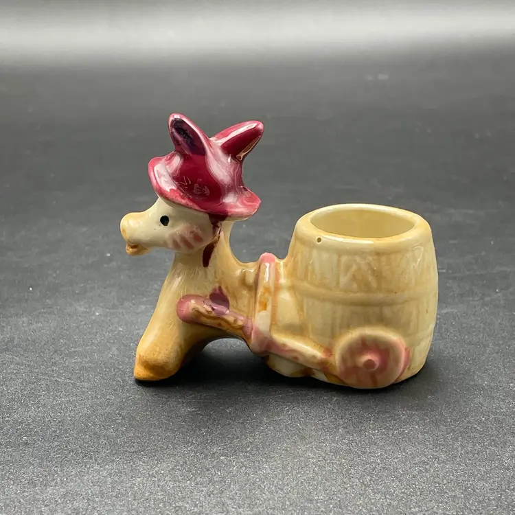This is a vintage miniature ceramic donkey and cart toothpick or match holder. Measures approximately 3" tall x 3.5" long. There is some wear due to age and use such as paint loss. See pictures for details. No chips or cracks.