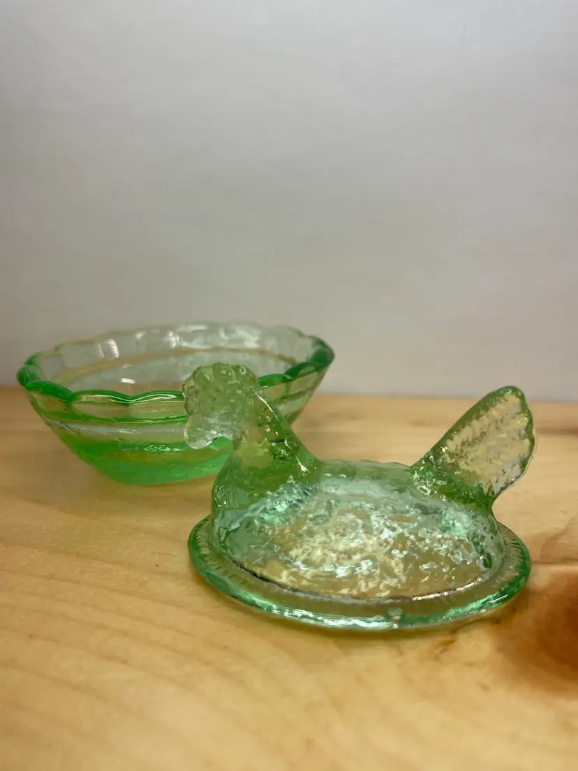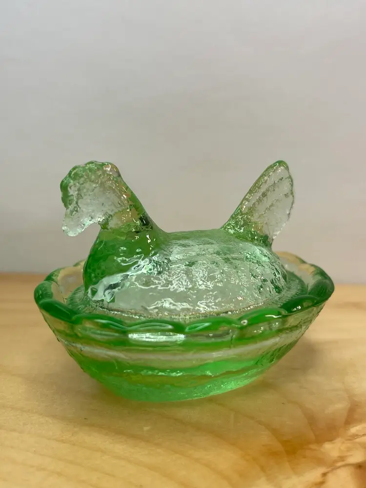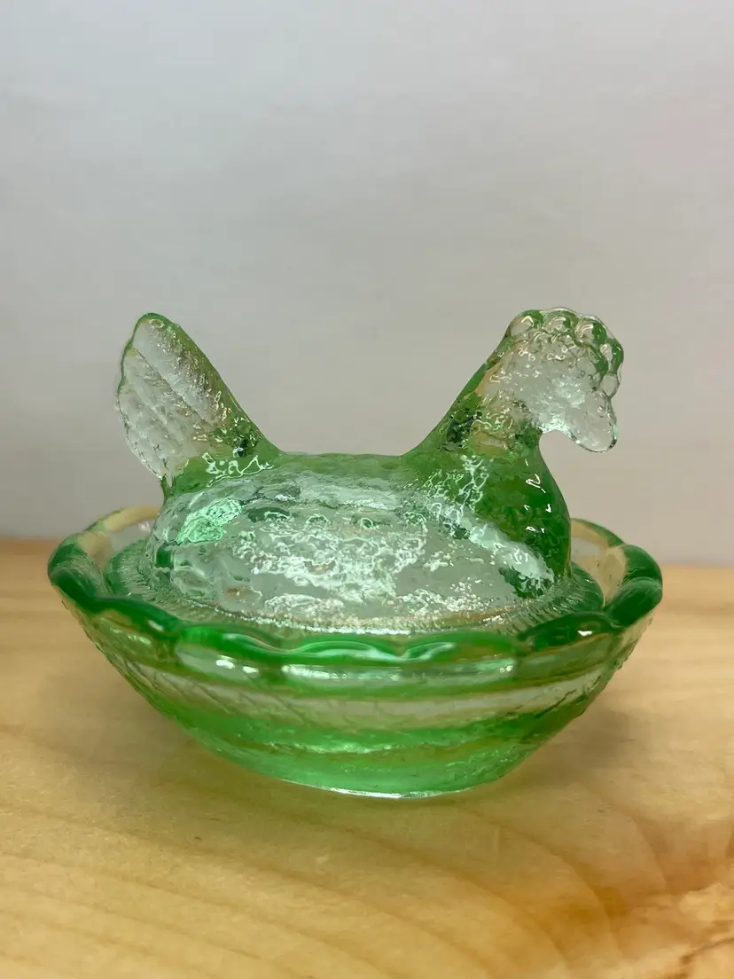 Miniature green hen on nest/salt cellar. Just as beautiful as it’s full sized counter part, this little guy stands 2 inches tall and approximately 2 and a half inches tall. There are no chips or cracks. Use it as a small trinket dish or a salt cellar for your table!