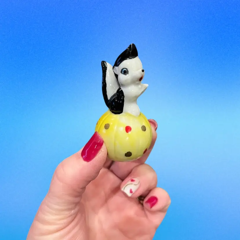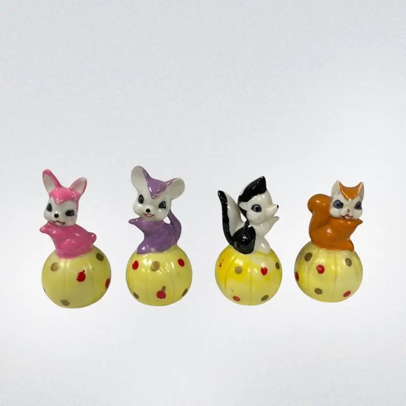 Ceramic Bunny, Mouse, Skunk and Squirrel! Marked Japan on bottom. No chips or cracks Approx: 2.5” h