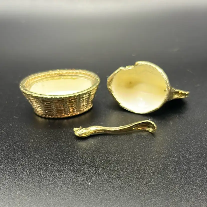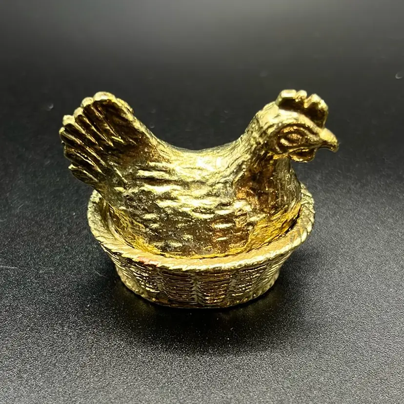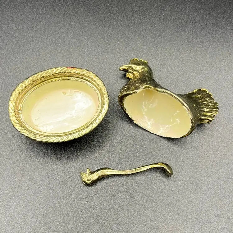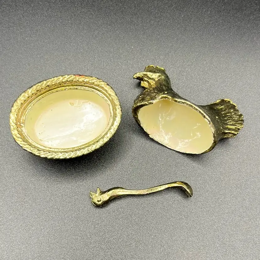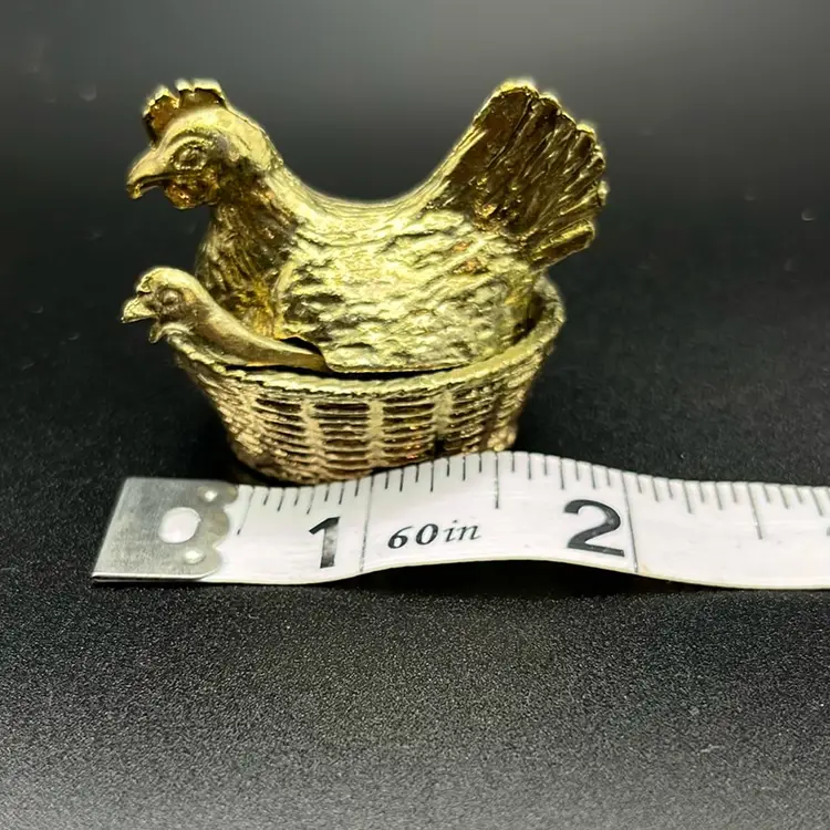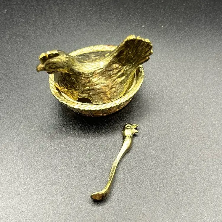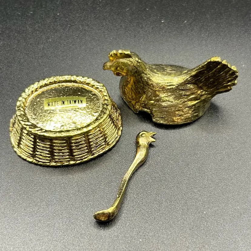 Made in Taiwan- metal hen on nest salt with chick spoon. Made in Taiwan sticker on bottom. Appx 2 in long and 1.5 in tall.