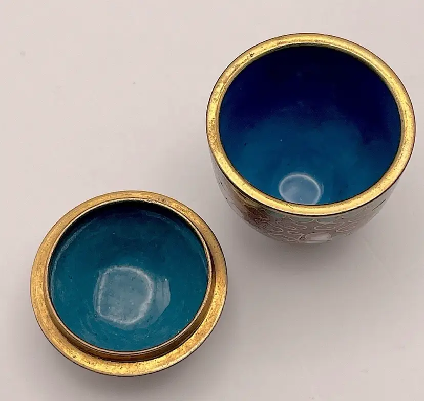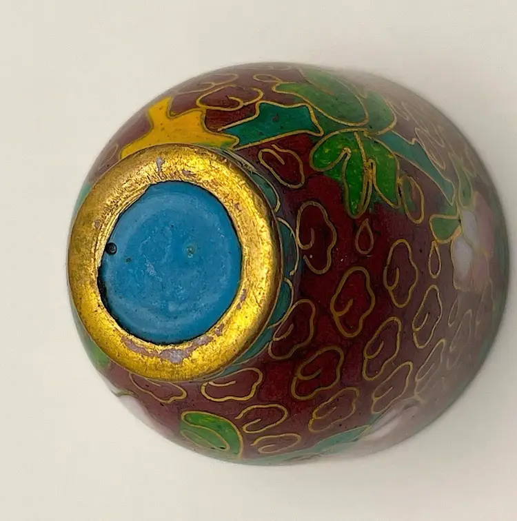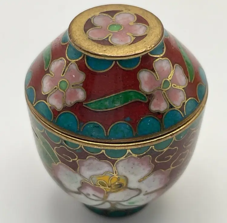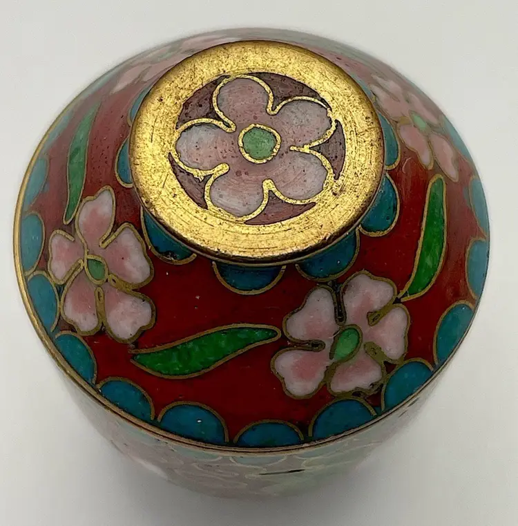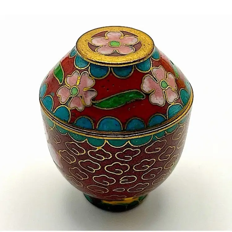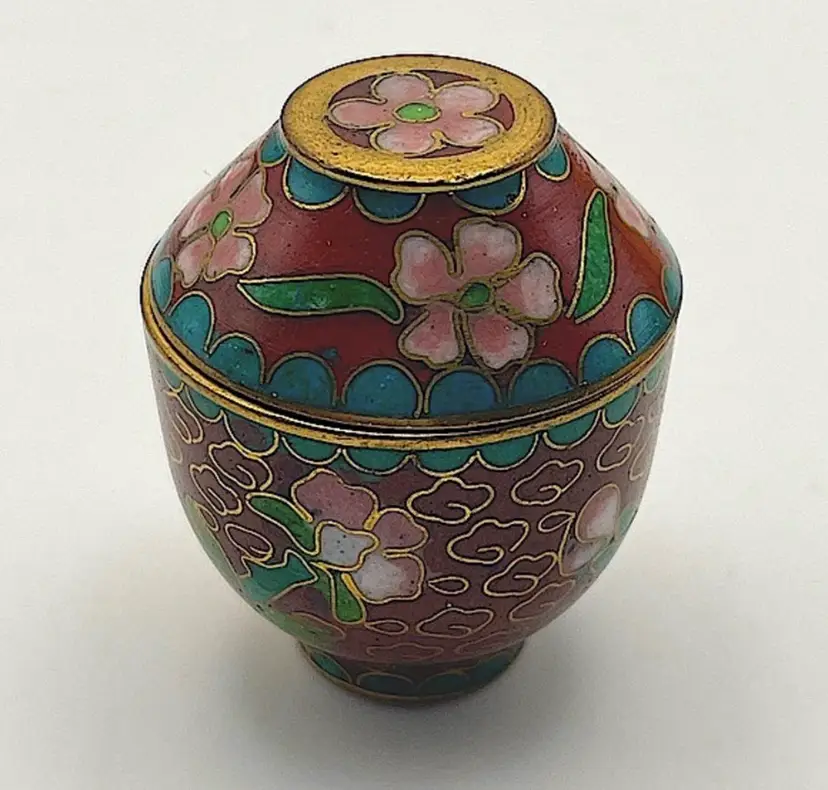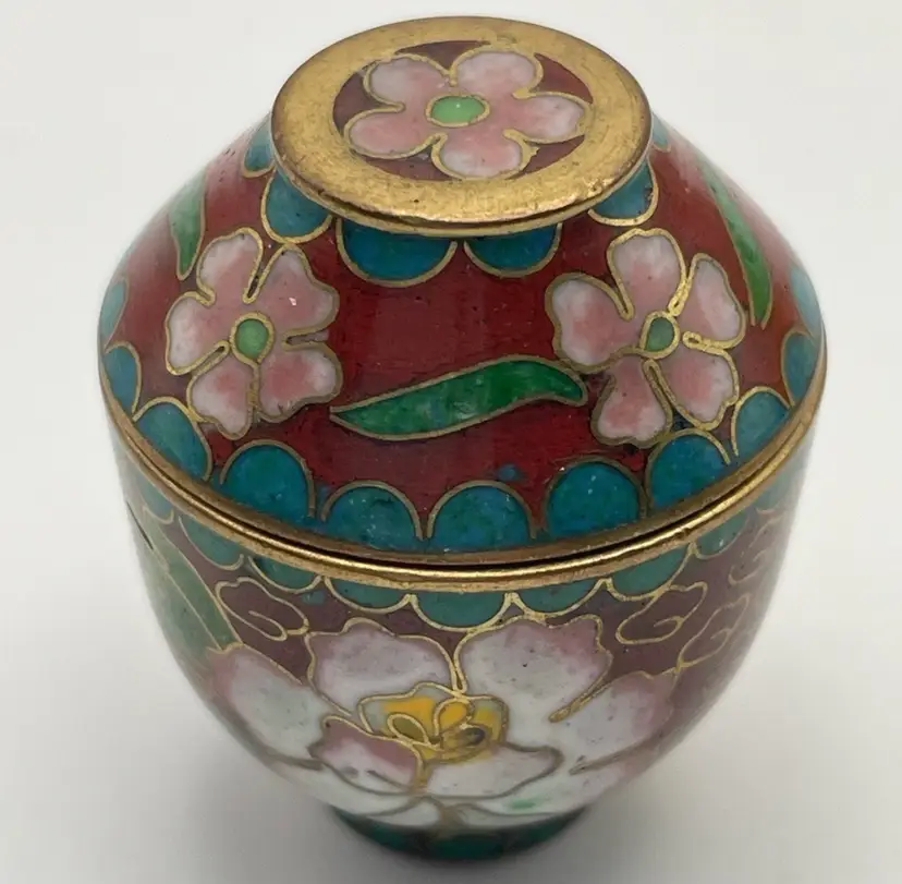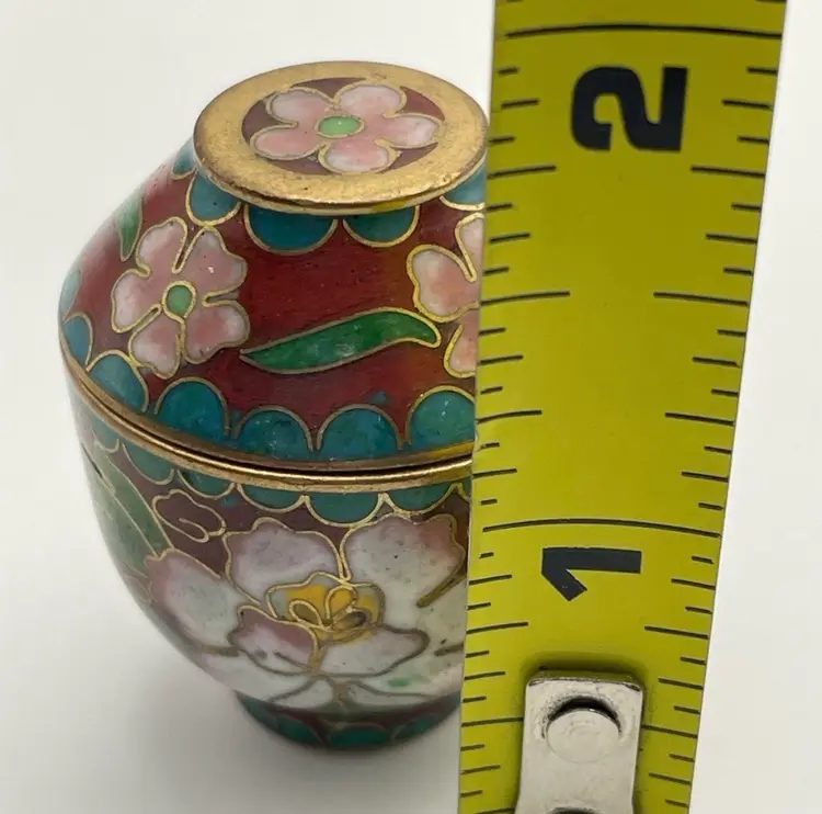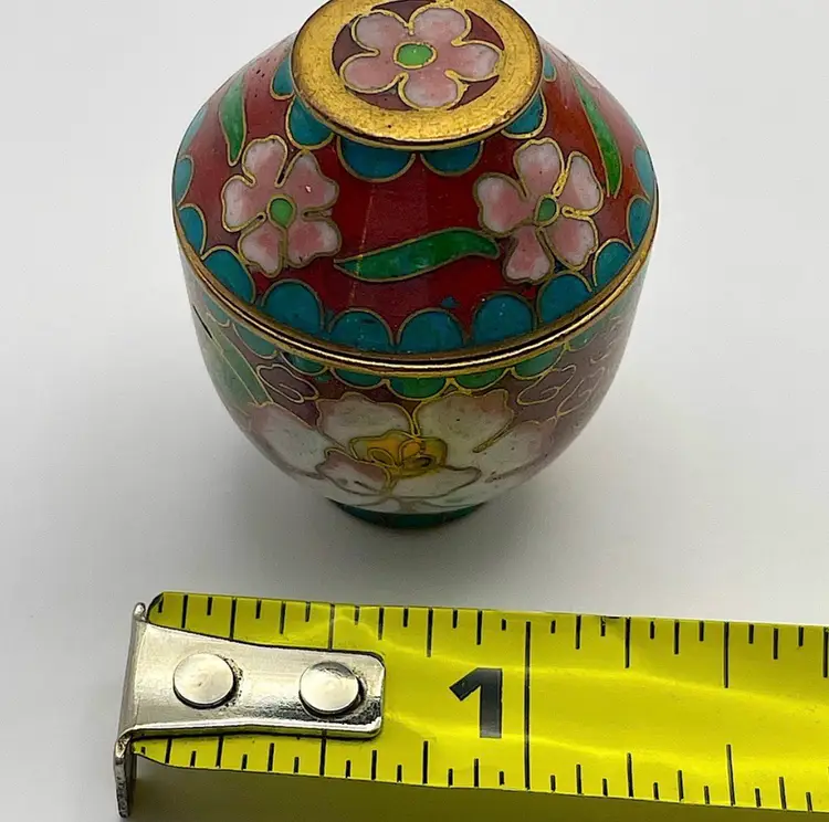 Miniature, Metal, Multicolored Cloisonné Vessel with Lid, Floral/Leaves, 1.5” tall. Beautiful Condition! Please see pictures for measurements.
