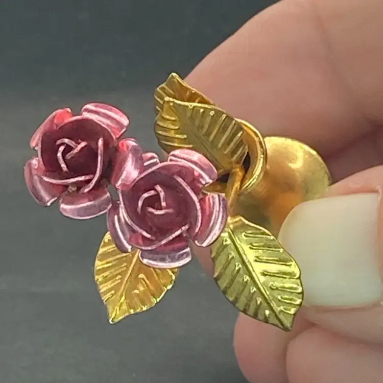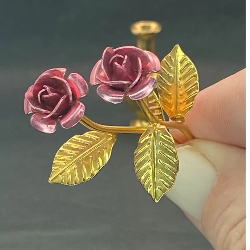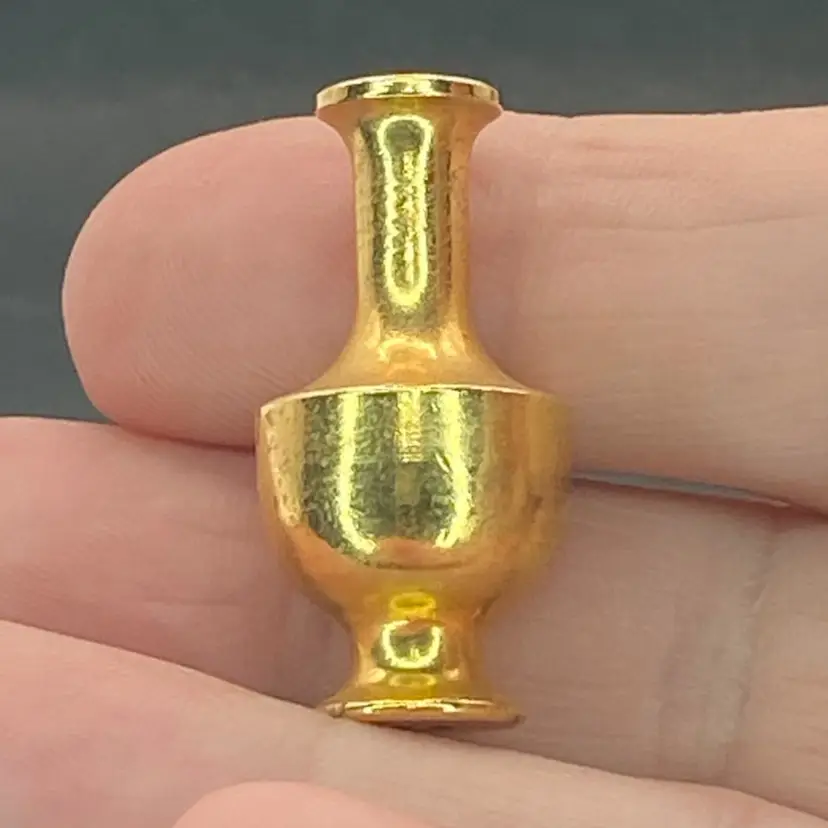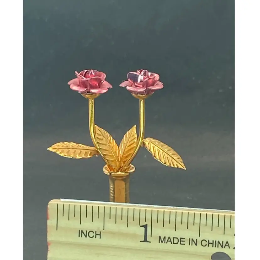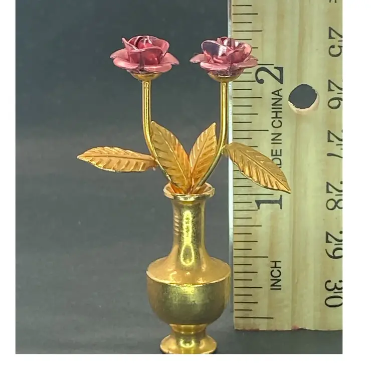 This is the sweetest arrangement ever. There are two metal roses with moldable petals, and a brass vase. This little vase has a wee bit of weight and good quality. Marketed as dollhouse decor, it makes a lovely mini addition to any collection.