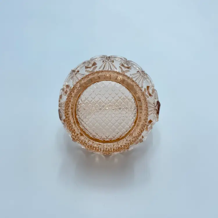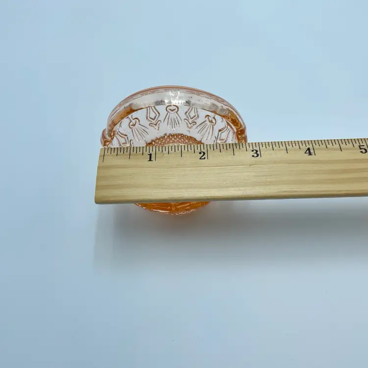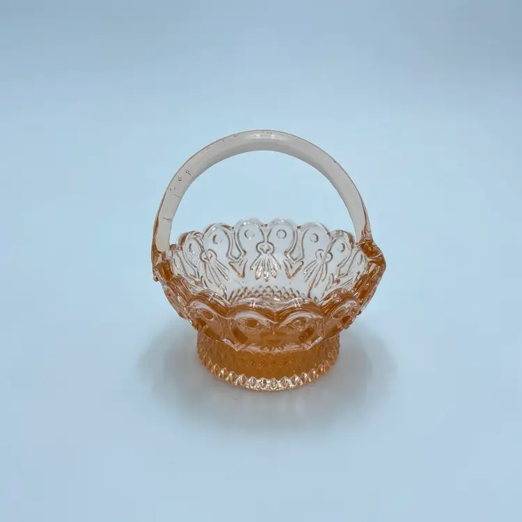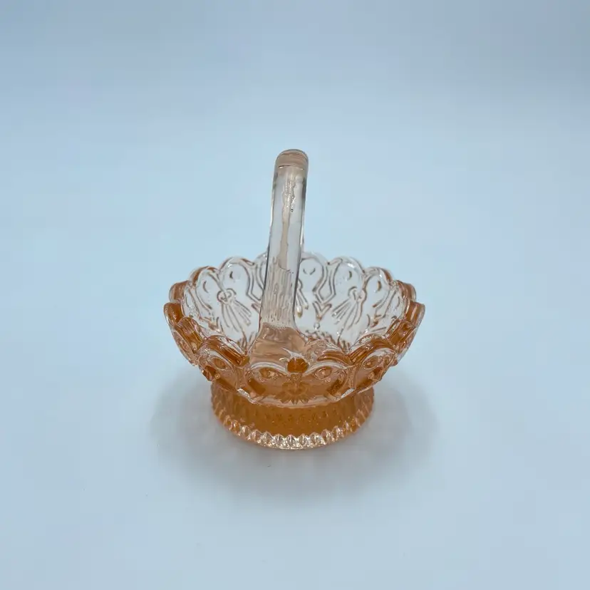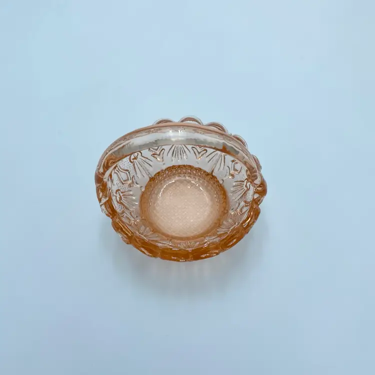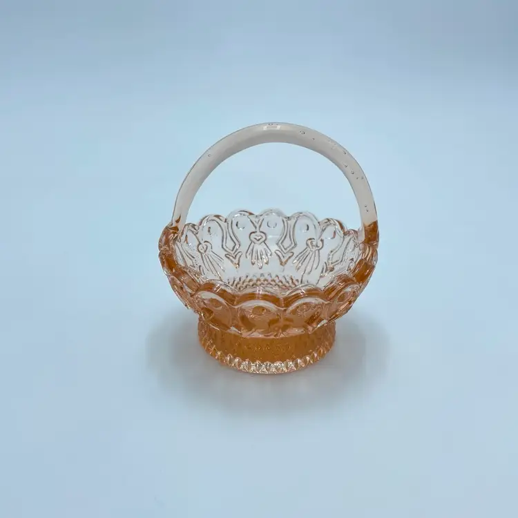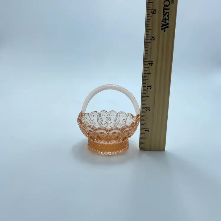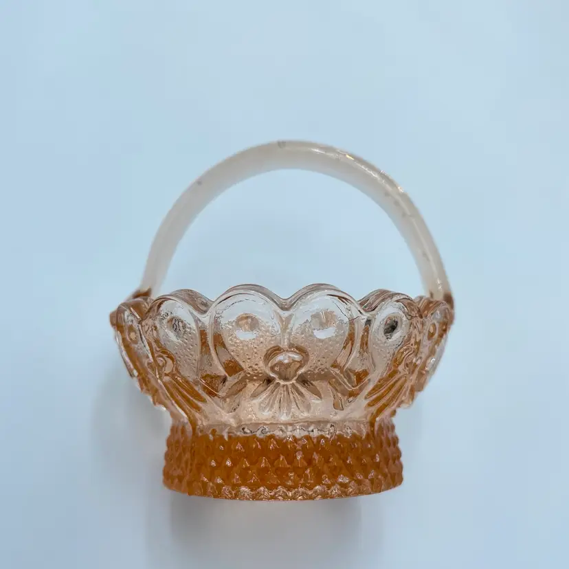 This is a vintage miniature pink depression glass basket of trinket dish. Measures approximately 3" tall. No chips or cracks but the handle seems lopsided.