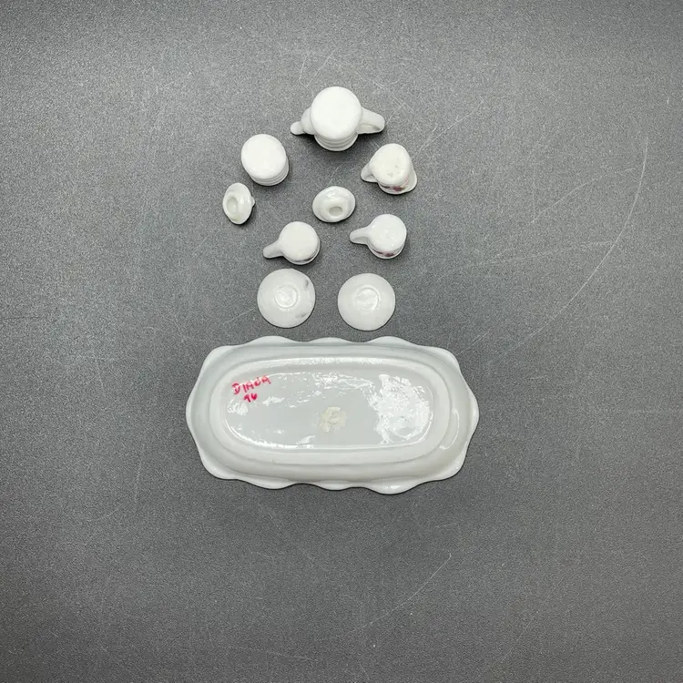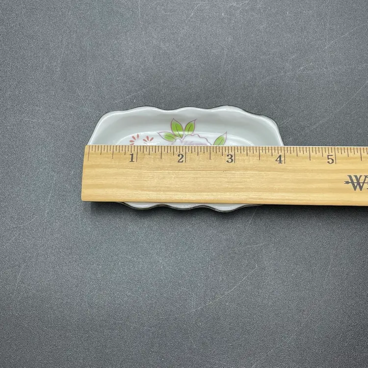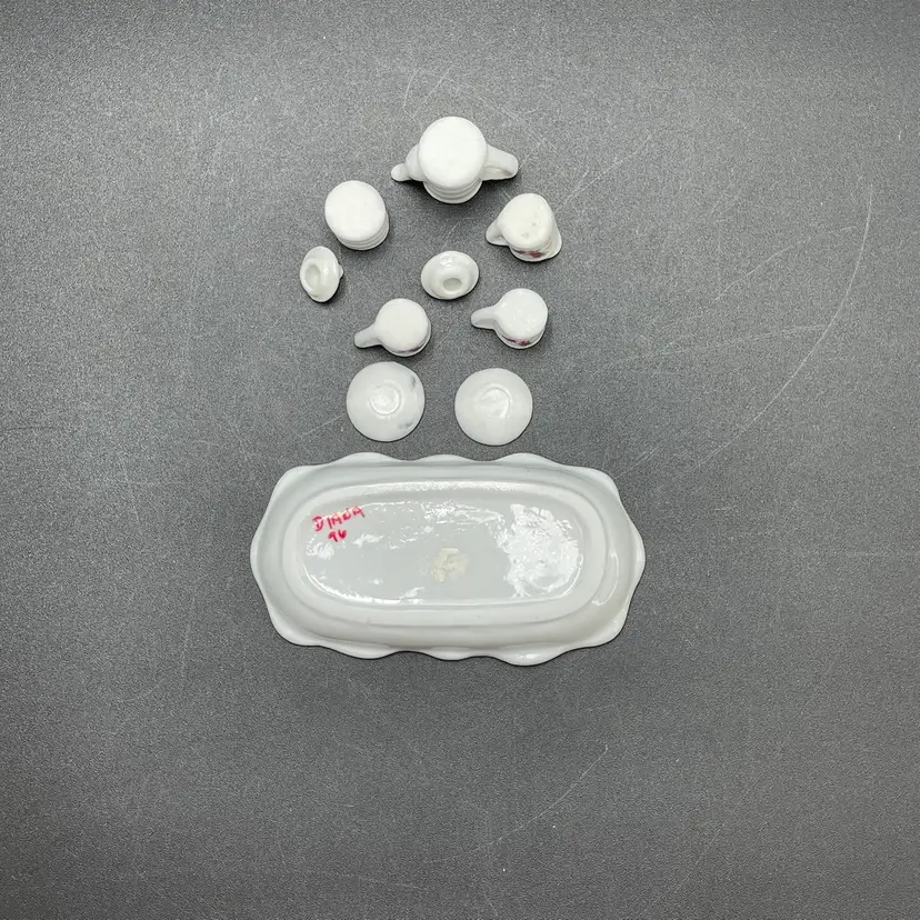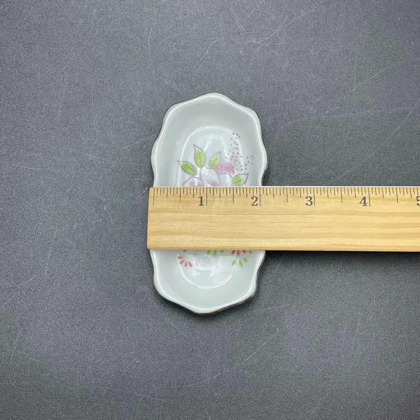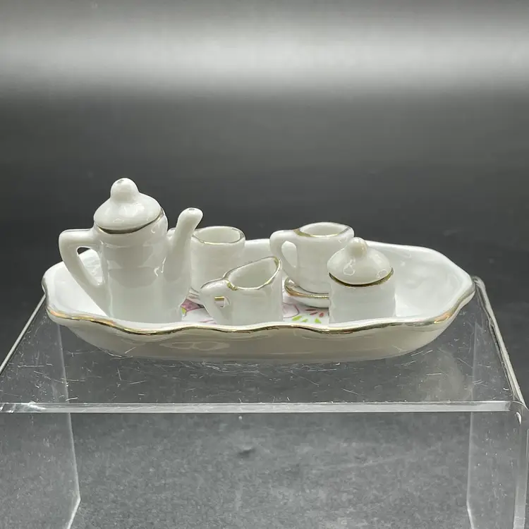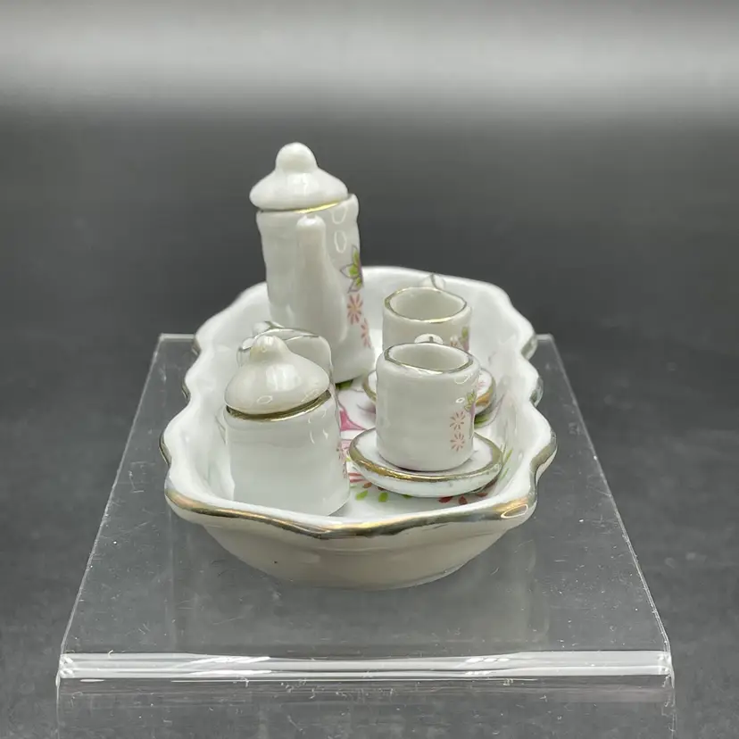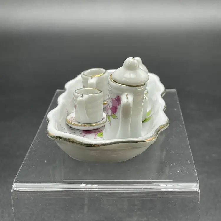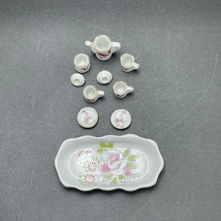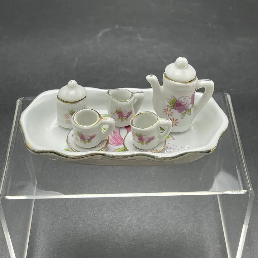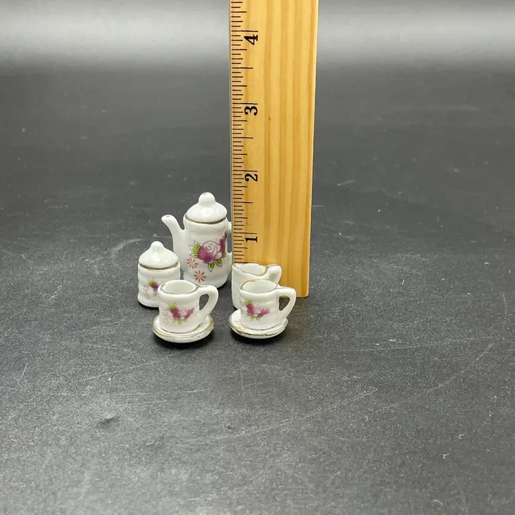 This is a vintage miniature porcelain tea set in a rose pattern. It includes a lidded teapot, a creamer, a lidded sugar, two teacups with saucers, and a serving tray. The set pieces measure between approximately .5" and 1.5" tall. The tray measures approximately 4" long x 2" wide. No chips or cracks.