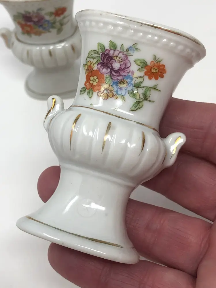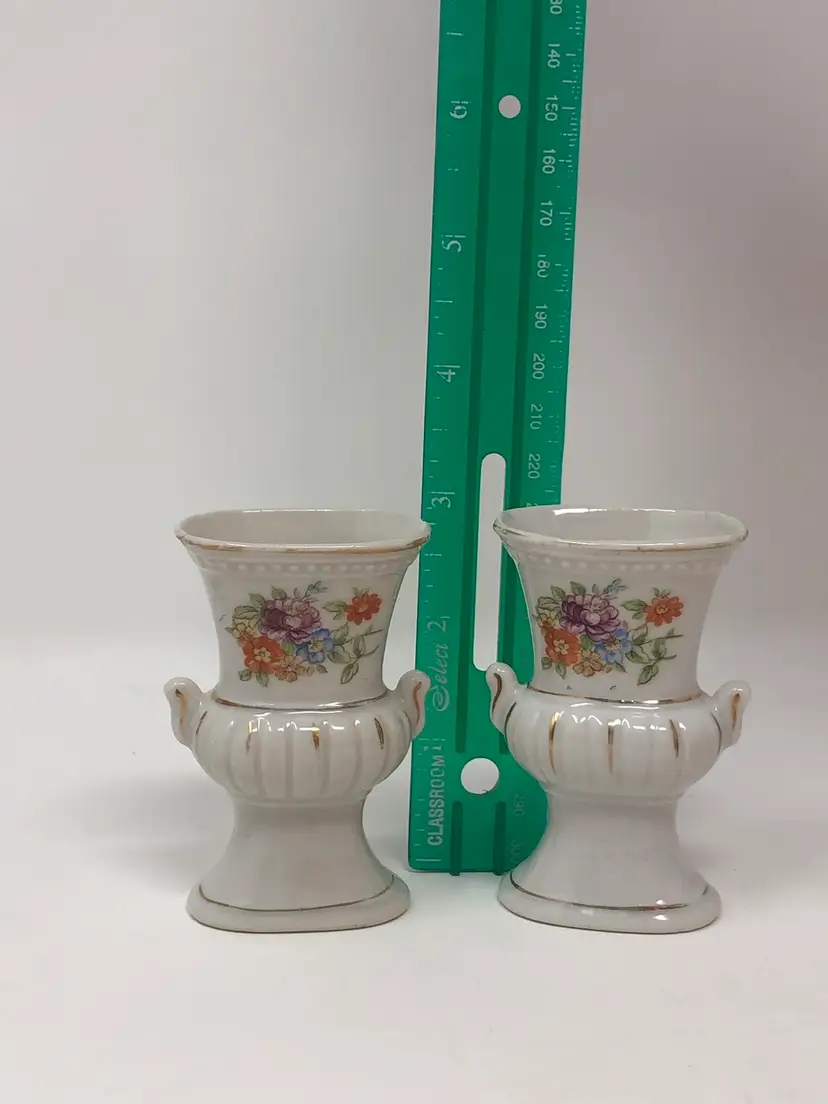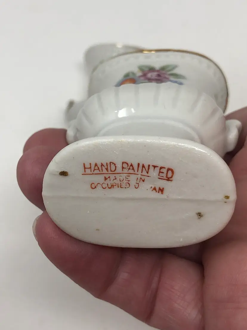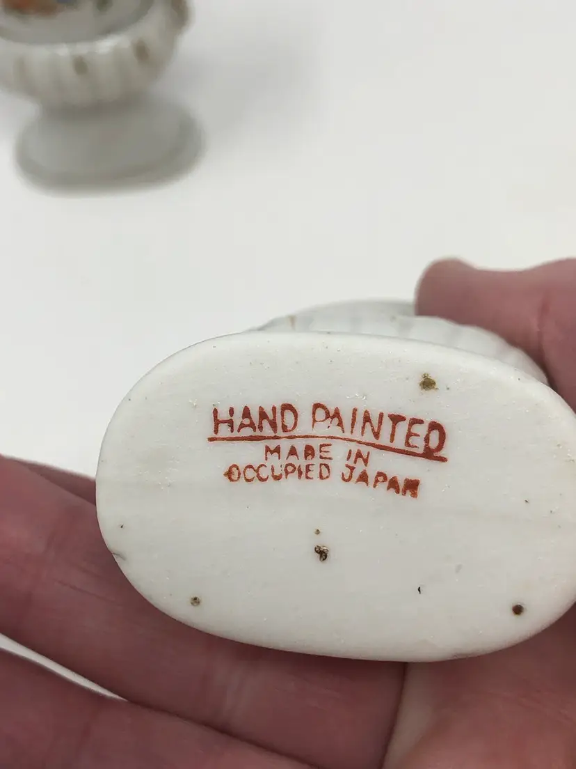 Matching 3" miniature urn style vase or container set of 2. One has a fine crack near the rim, otherwise good vintage condition. Red stamp on the bottom Hand Painted Made in Occupied Japan