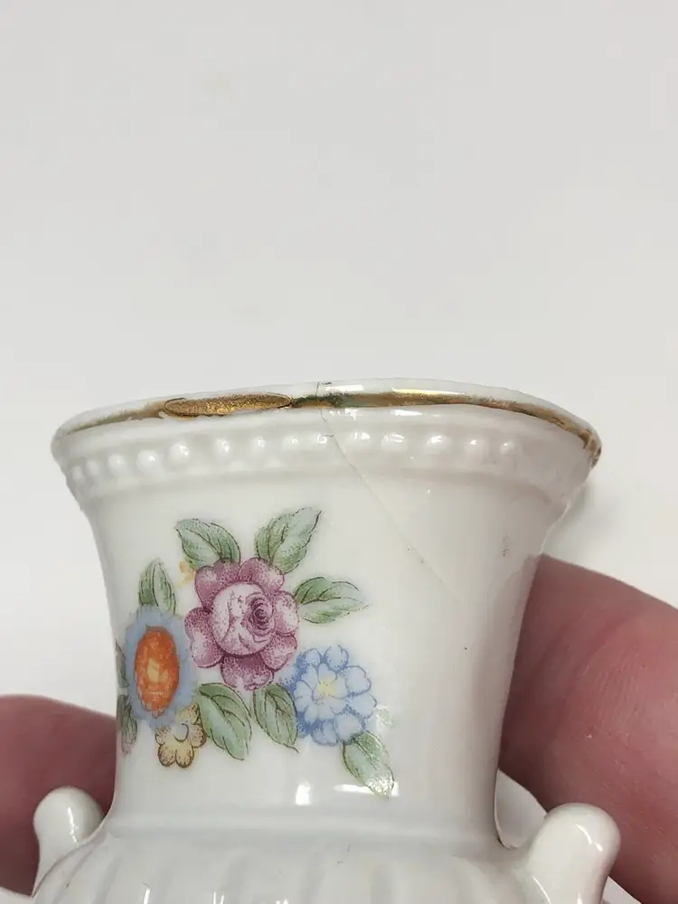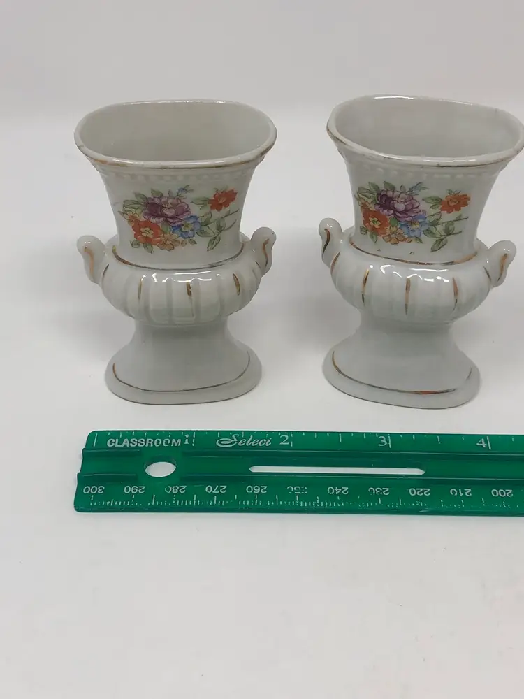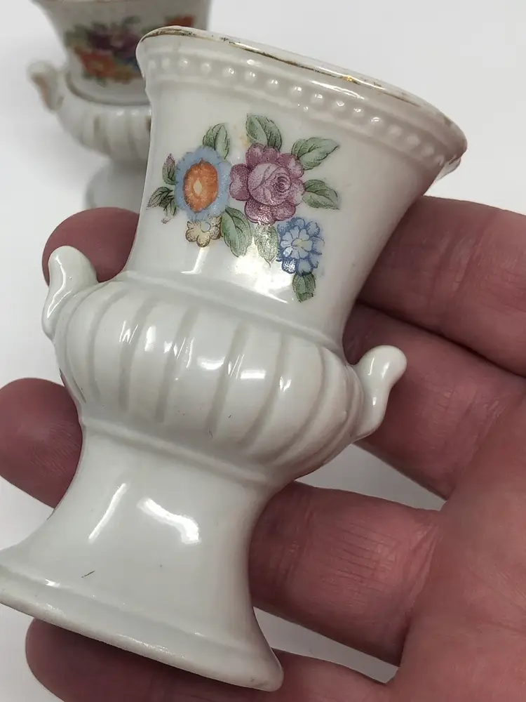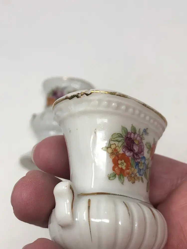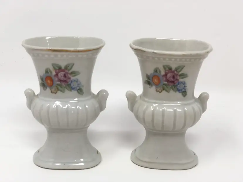 Matching 3" miniature urn style vase or container set of 2. One has a fine crack near the rim, otherwise good vintage condition. Red stamp on the bottom Hand Painted Made in Occupied Japan