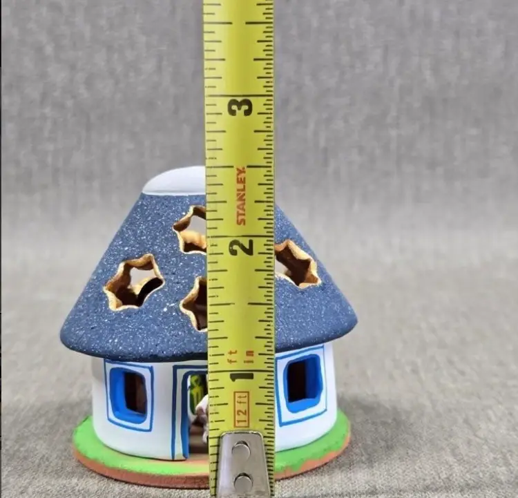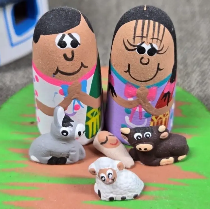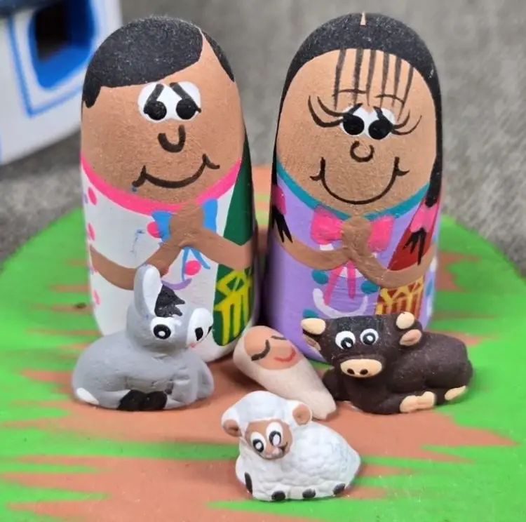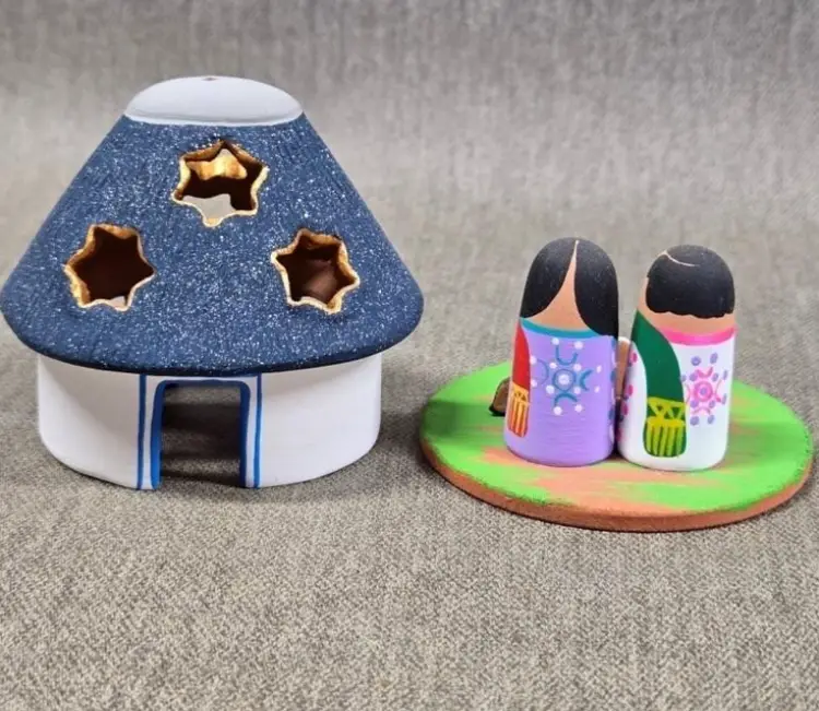 Tiny nativity scene made from pottery. A mushroom shaped cover hides the scene.
