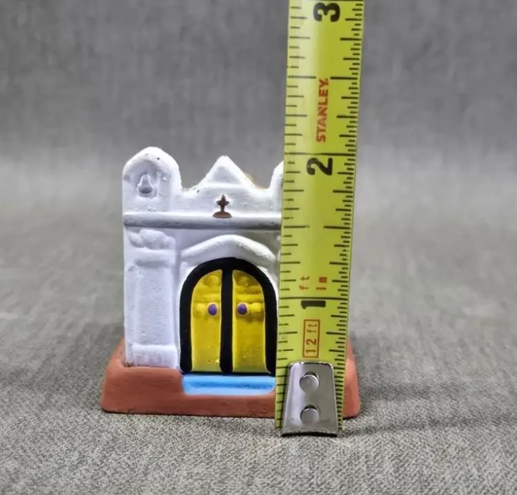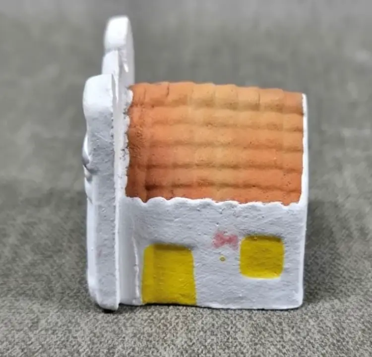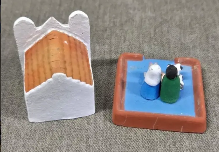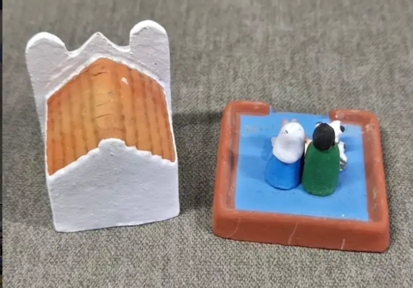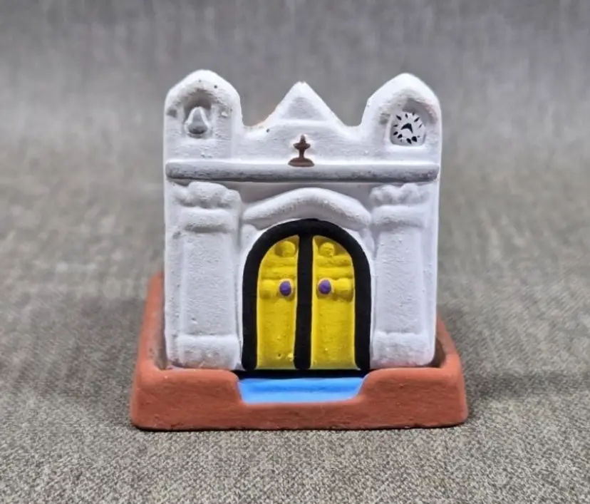 Tiny church covering a nativity scene. Made with pottery in Guatemala.