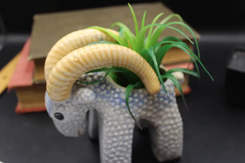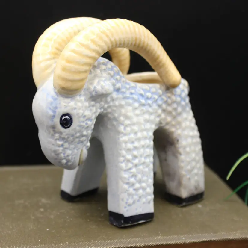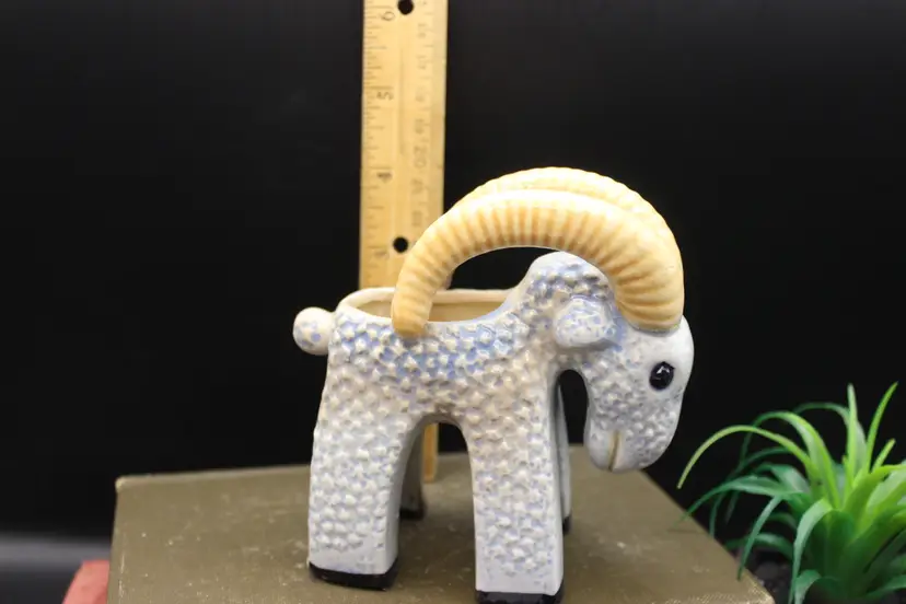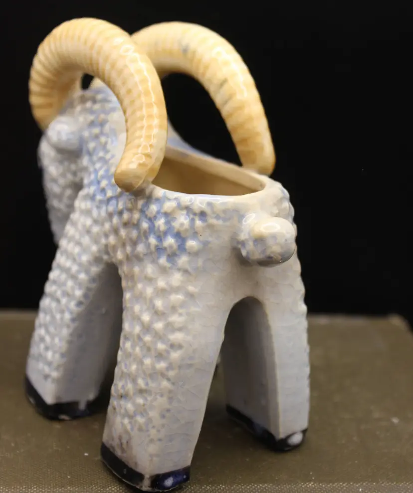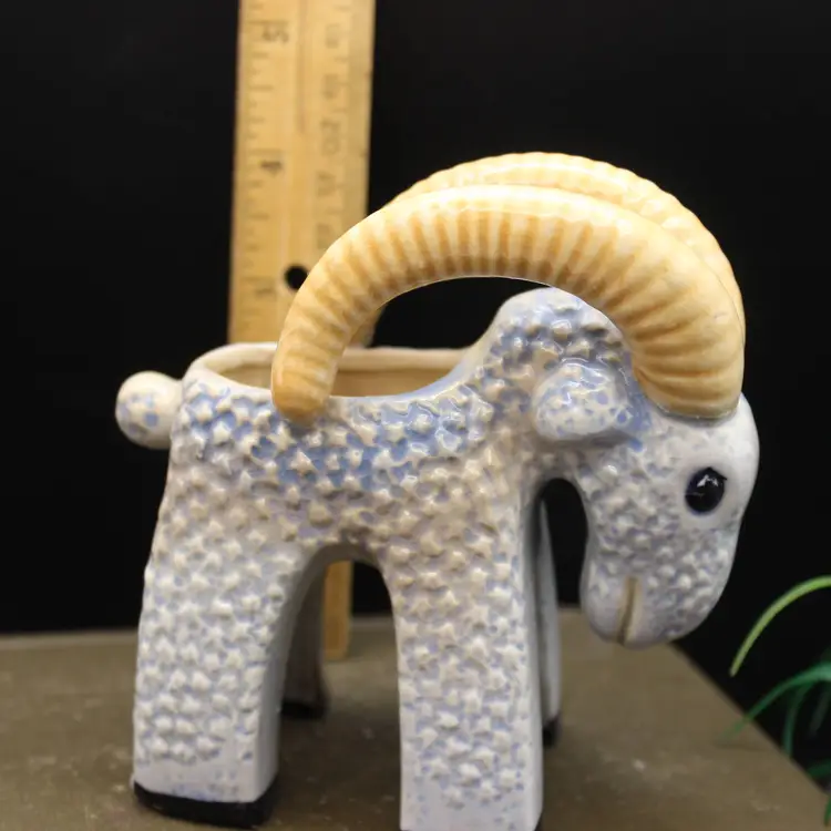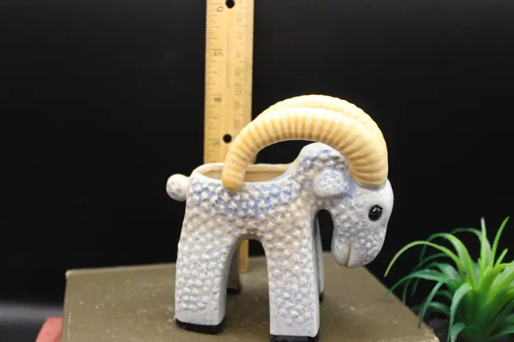 Small Ram Ceramic Planter with Curved Horns. Light bluish gray color with tan horns. Stands approximately 4" in height. No chips or dings. Just adorable. Marked on the bottom of hoof Made in Japan with a Horseshoe symbol. Faux plant not included, just for reference!