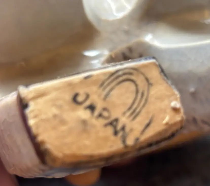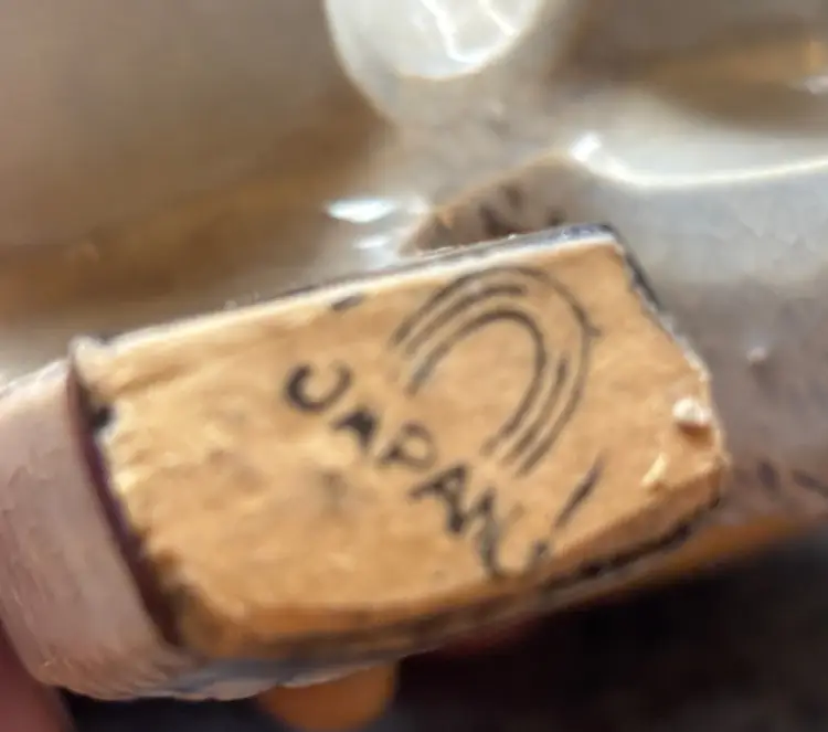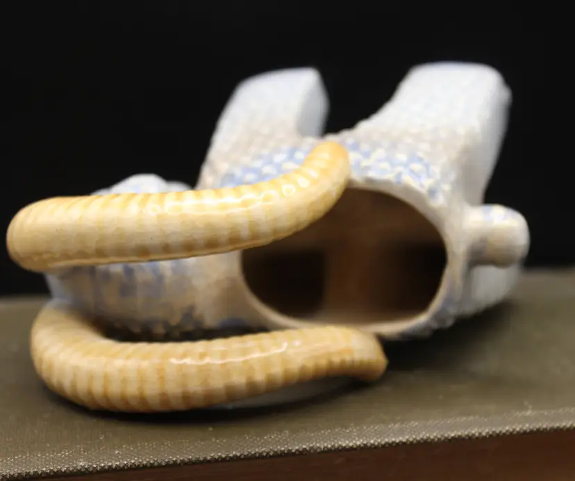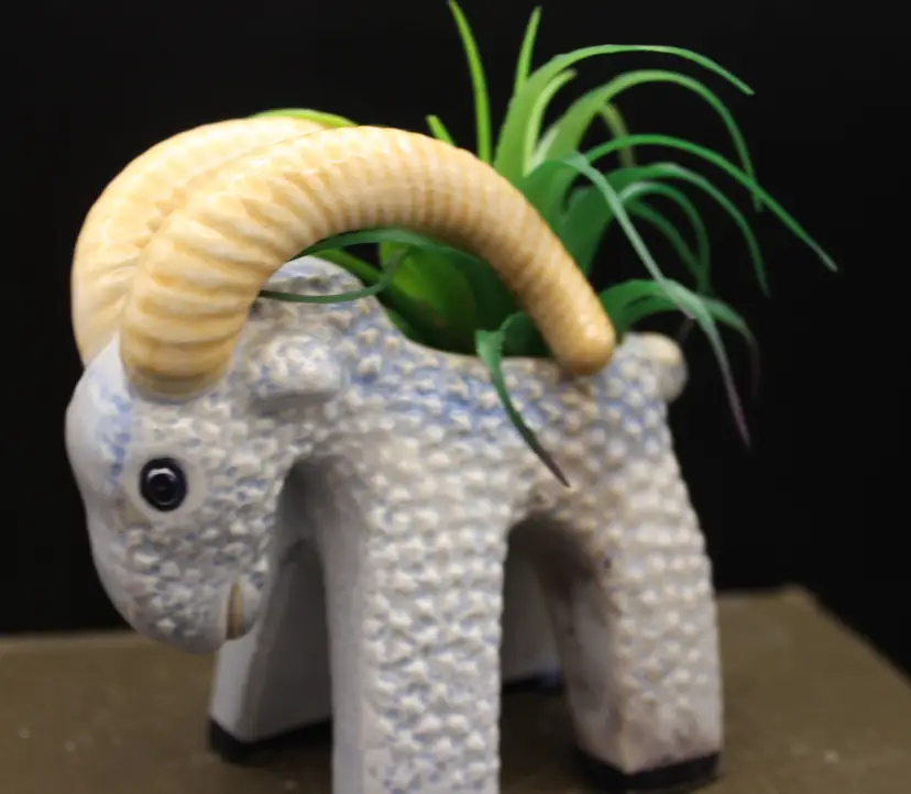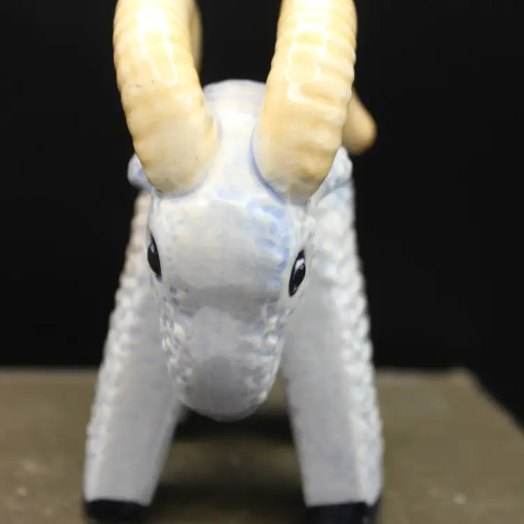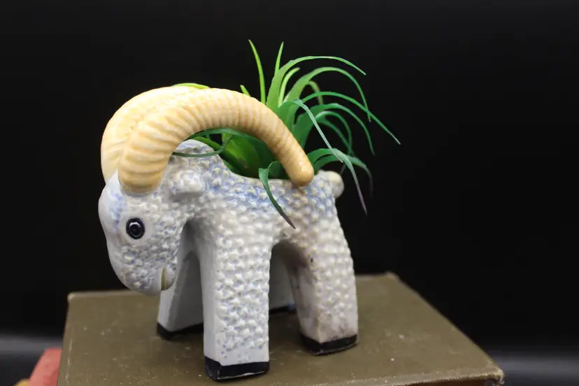Small Ram Ceramic Planter with Curved Horns. Light bluish gray color with tan horns. Stands approximately 4" in height. No chips or dings. Just adorable. Marked on the bottom of hoof Made in Japan with a Horseshoe symbol. Faux plant not included, just for reference!