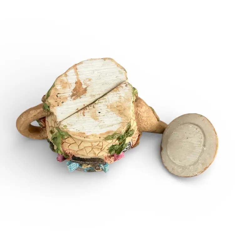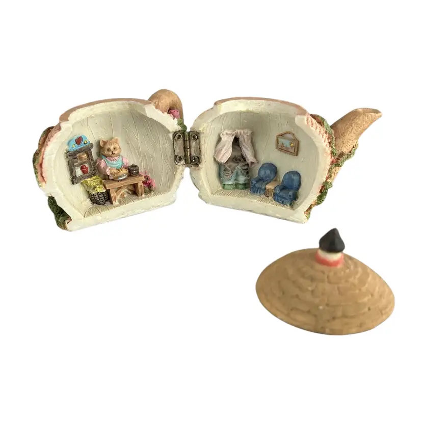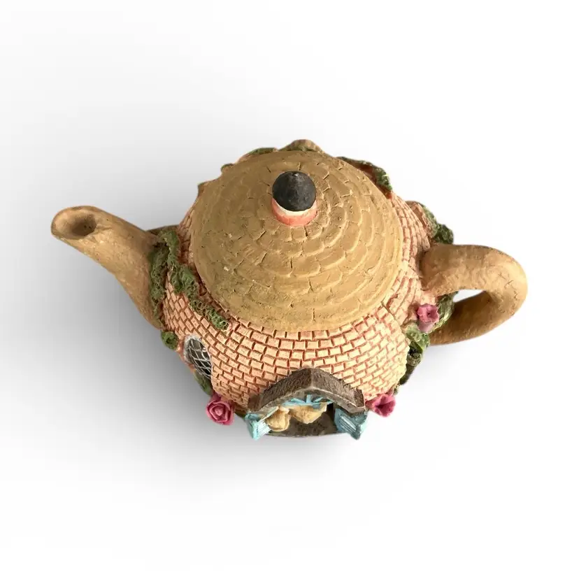 Add whimsy to your tea time with this cottage-shaped teapot featuring a playful cat peeking out the window. Perfect for collectors and tea lovers alike. Size: 3.5” x 4.5”