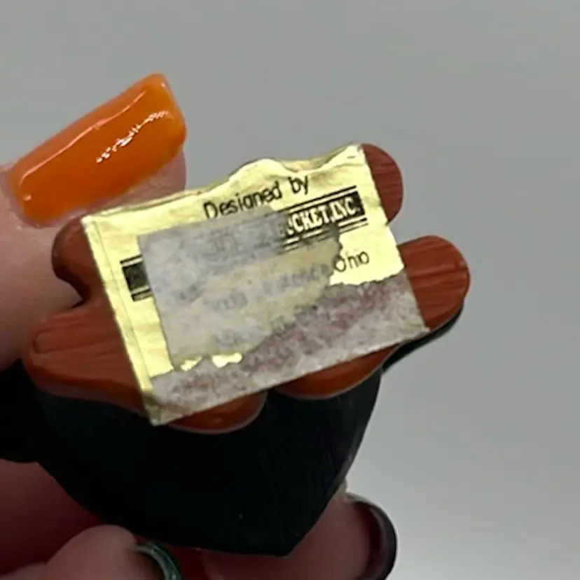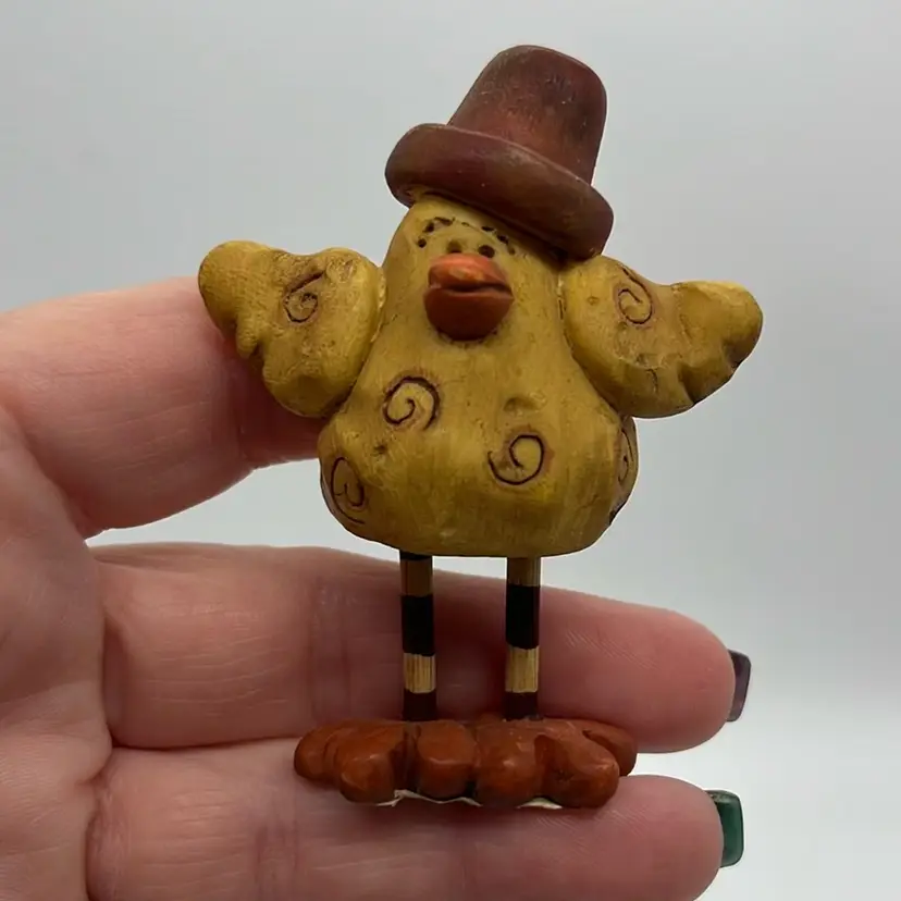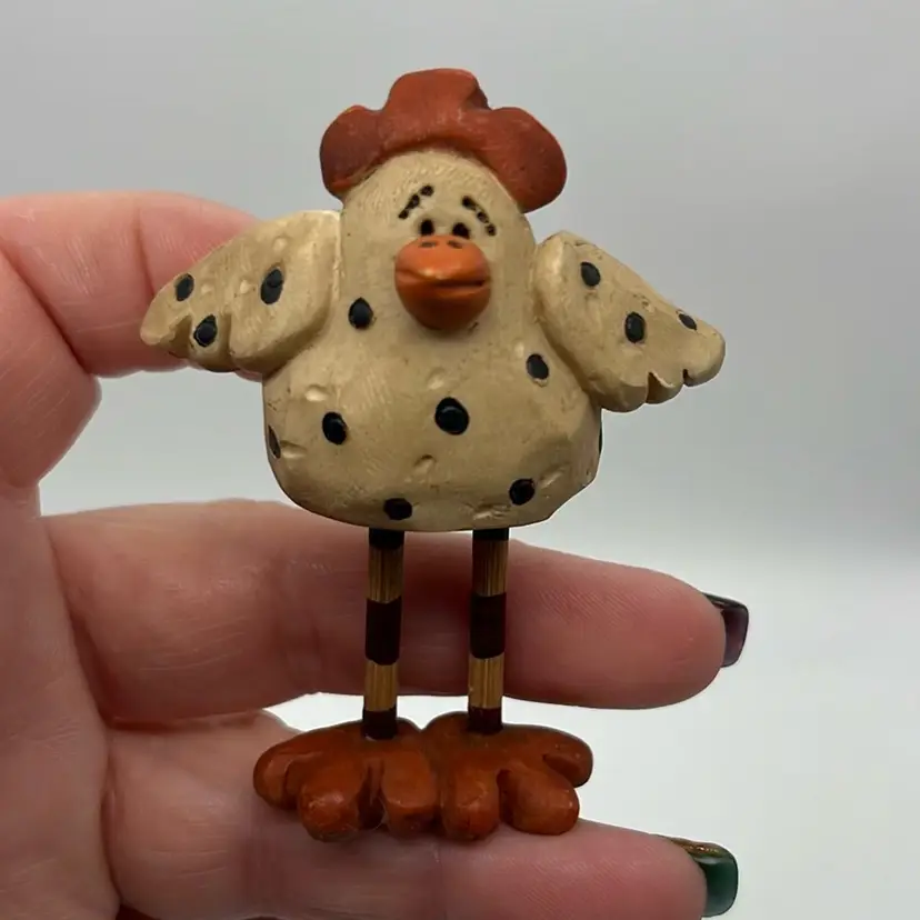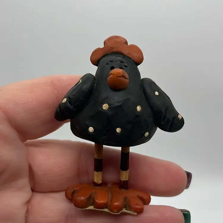 Set of 3 roosters. I think made of resin and wooden legs. Unable to read sticker on bottom. No issues. Approx: 2.5” h