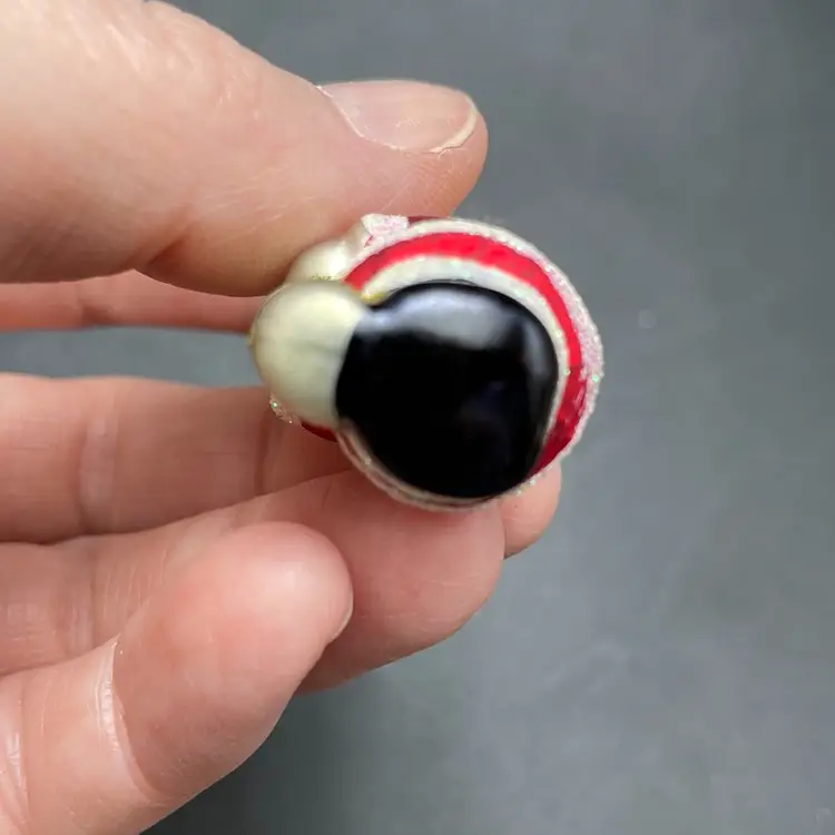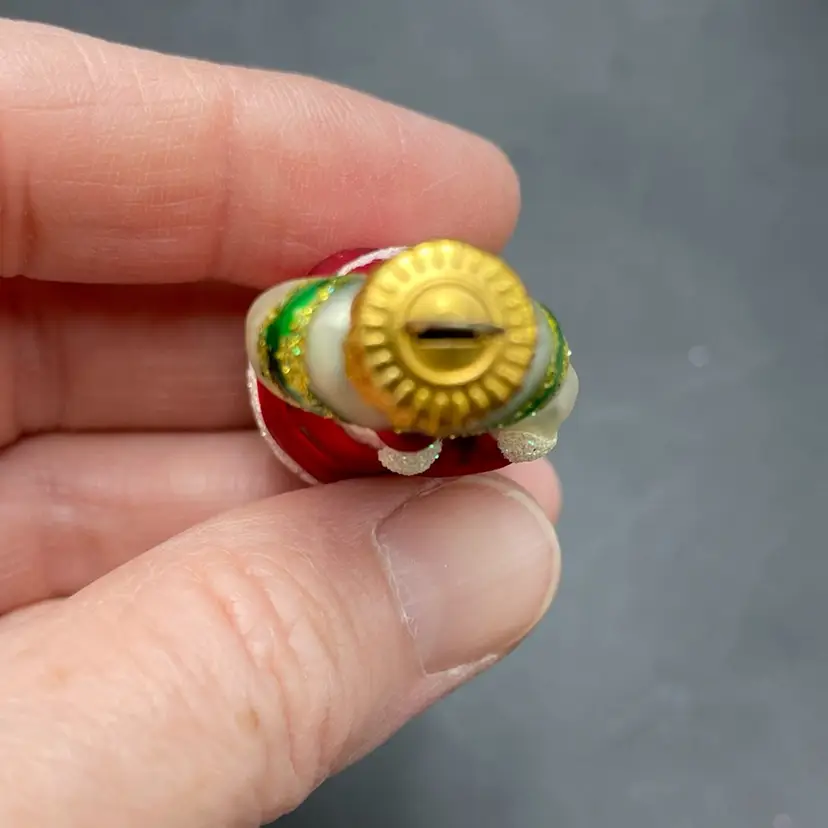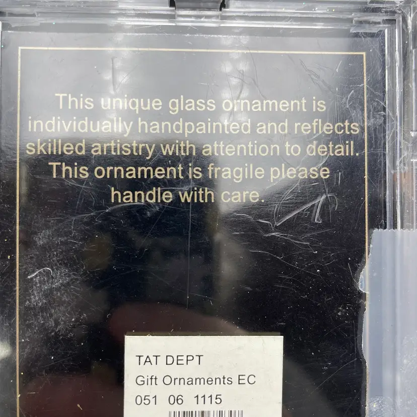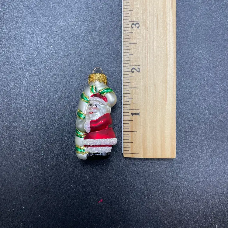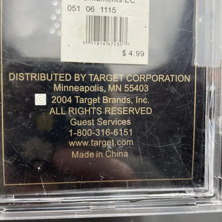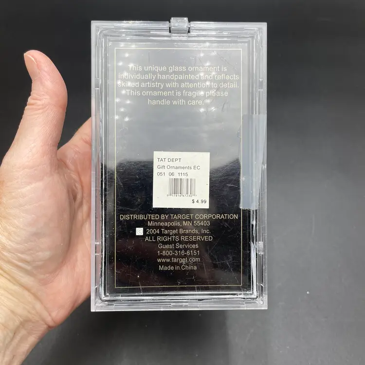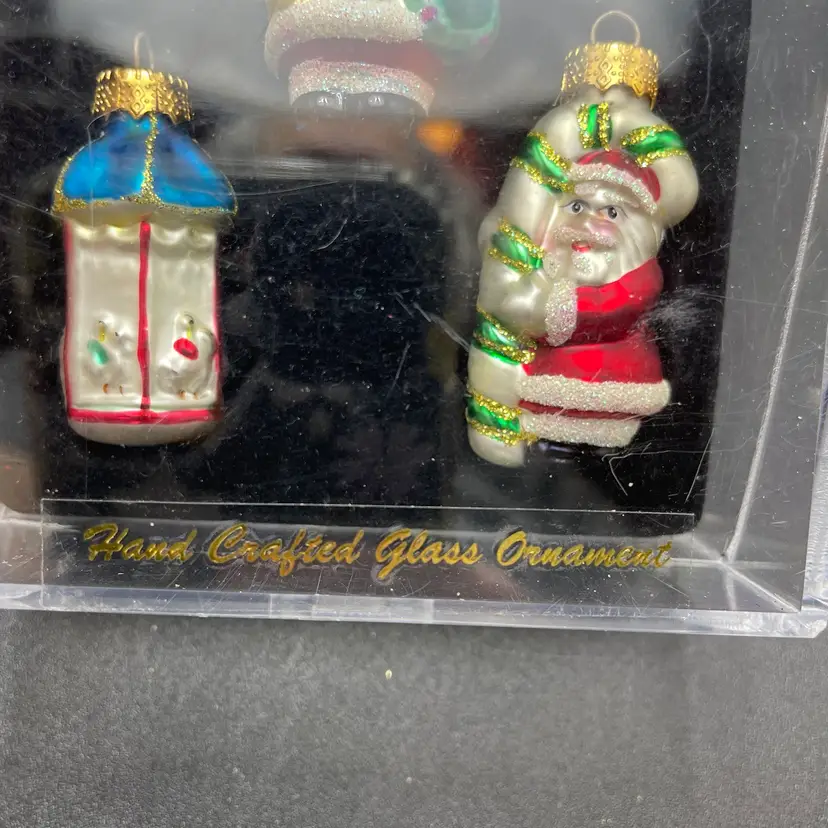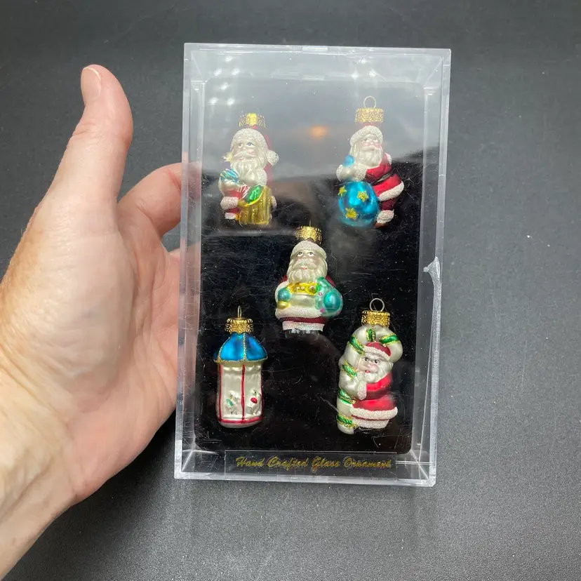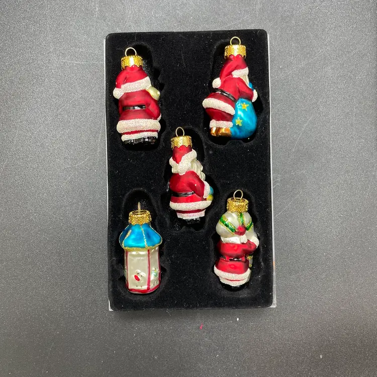 This is a set of 5 miniature hand painted glass hanging ornament in their original packaging. Each ornament measures approximately 2" tall. Made for Target. The plastic box has some wear. No major flaws to the ornaments.