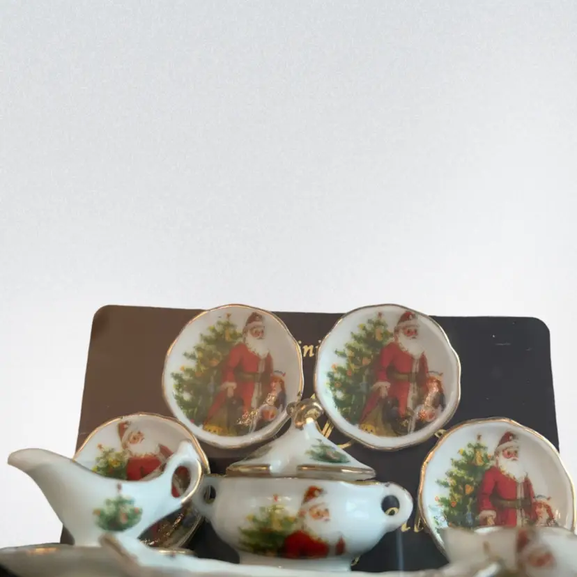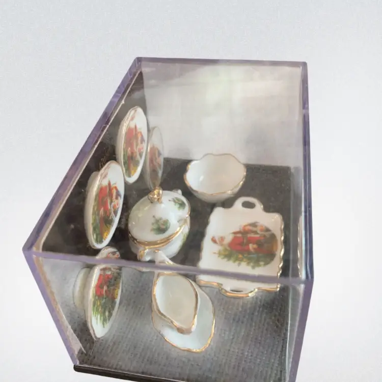 Tiny porcelain TeaSet with four plates, a teapot, cream and sugar and tray in enclosed plastic container. Made in Germany- Twitter Porzellan