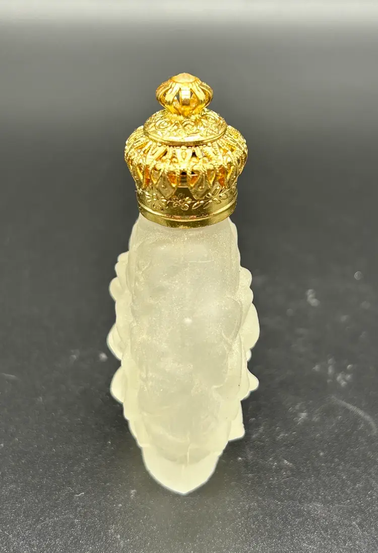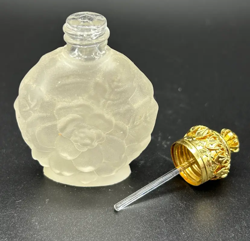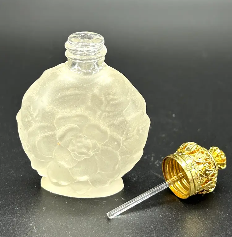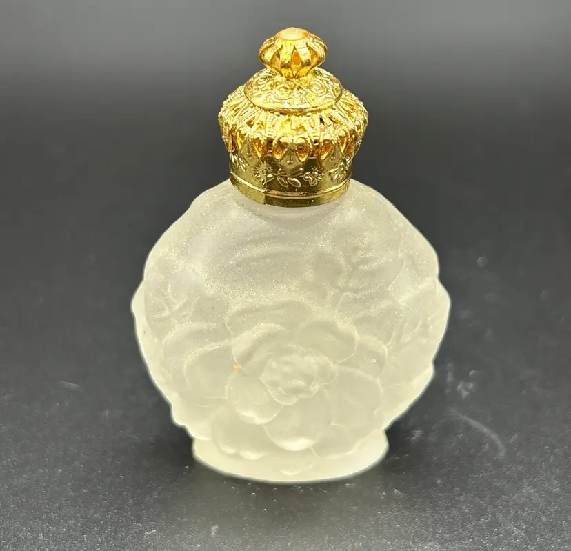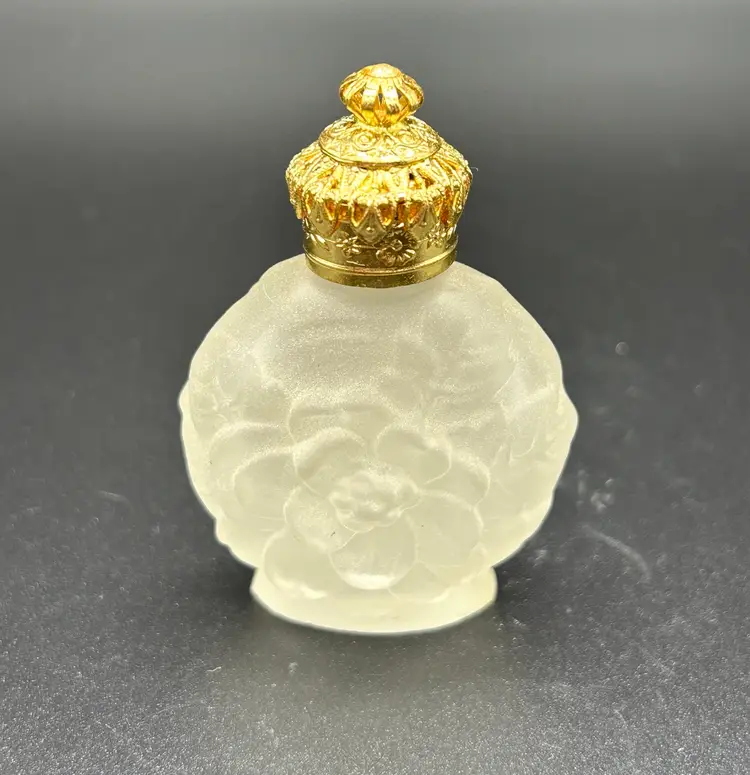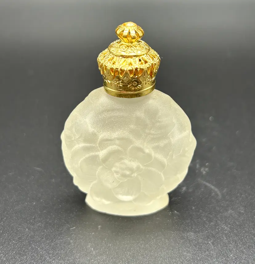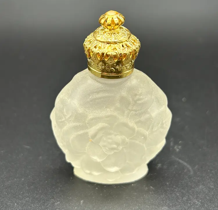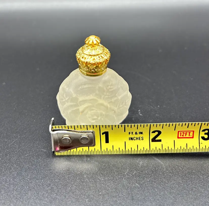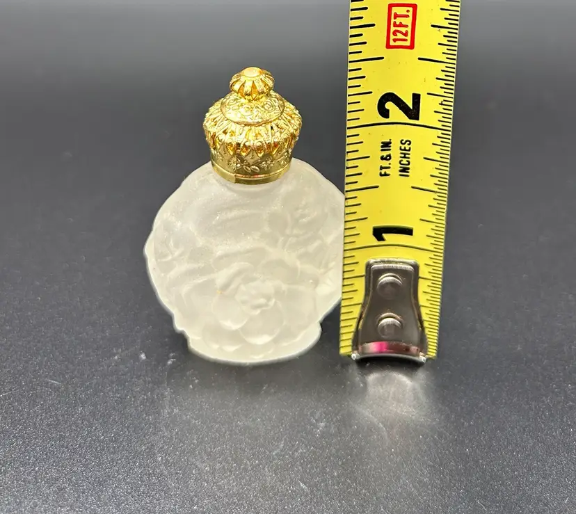 Darling miniature satin glass floral perfume Bottle Dinner is intact no chips no cracks Metal top Measures 1.75” tall and 1.75 wide