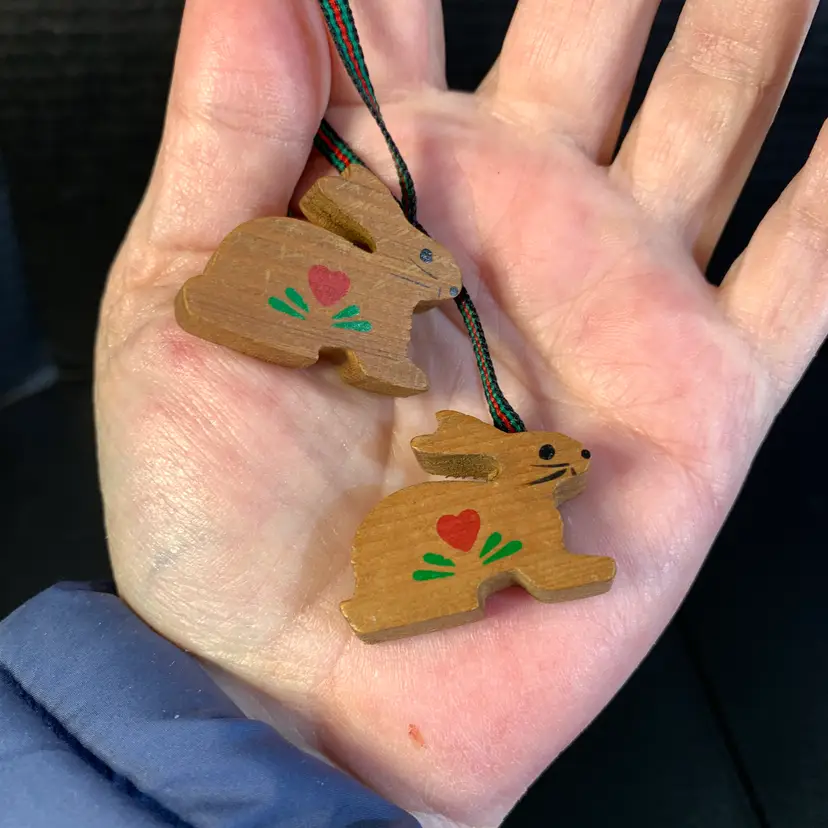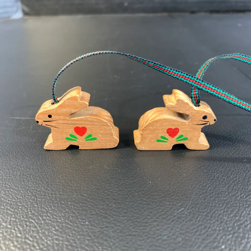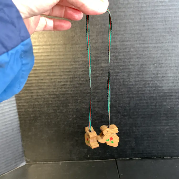 These would look cute dangling from a shelf! It is in great condition. The bunnies each measure 1 1/4 inches across, 3/8 inches wide and 1 inch tall. The entire length is 14 inches. Weighs 1 ounce. If the actual postage ends up being less than what you paid, you will be refunded for anything over one dollar.