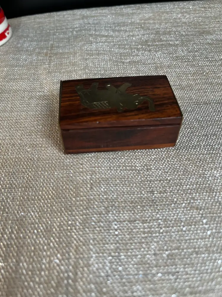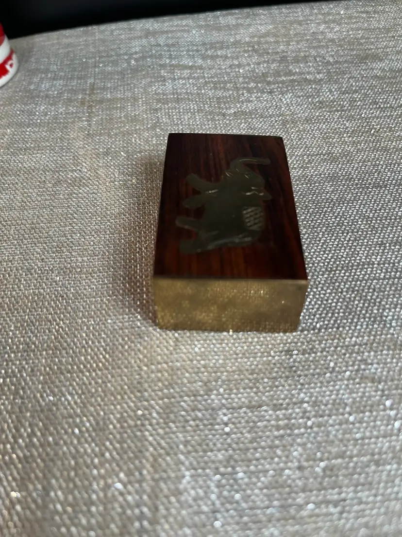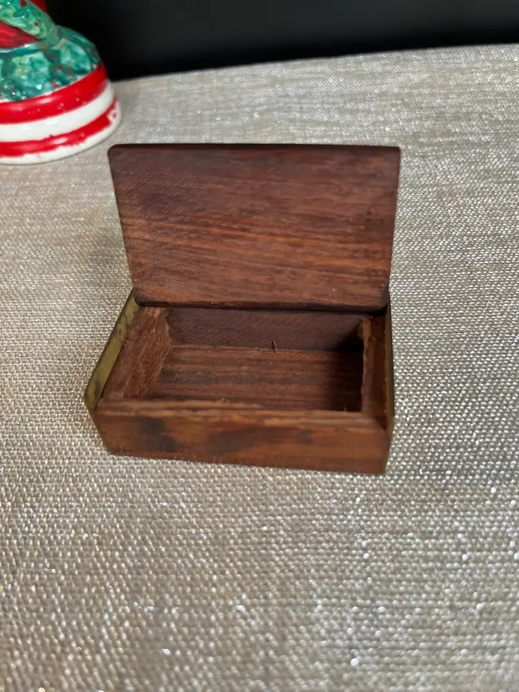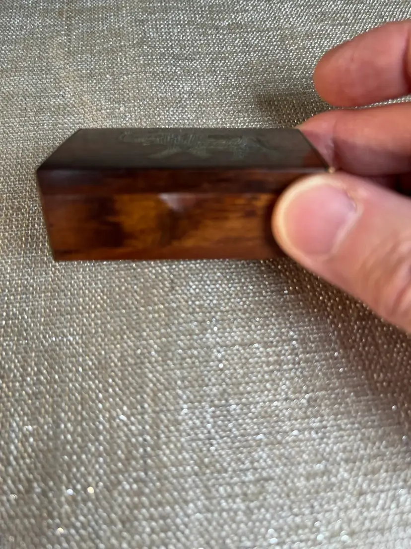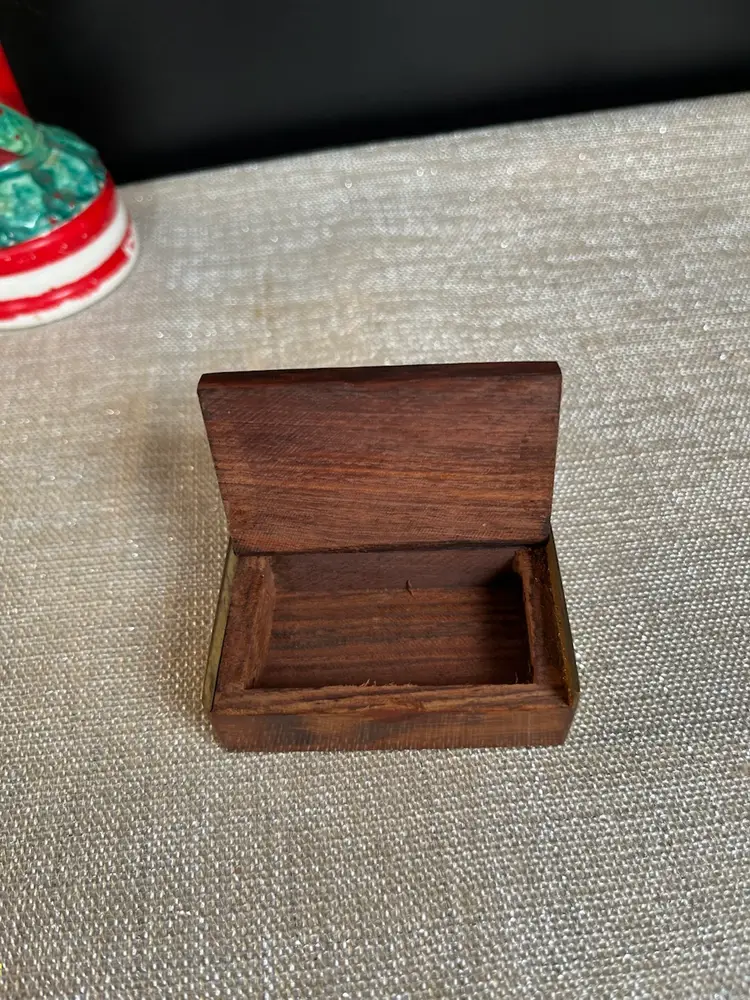 This is very well crafted. Beautiful wood grain. Brass has patina. Cute as can be. Measures approx .75"H, 2.25"W, 1.25" Deep, 1.3 Oz.