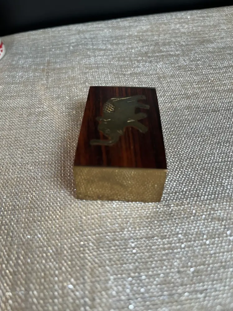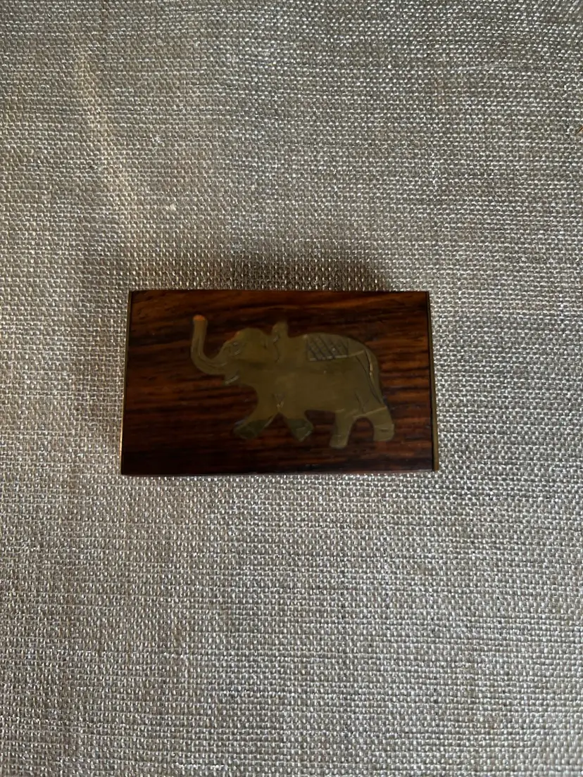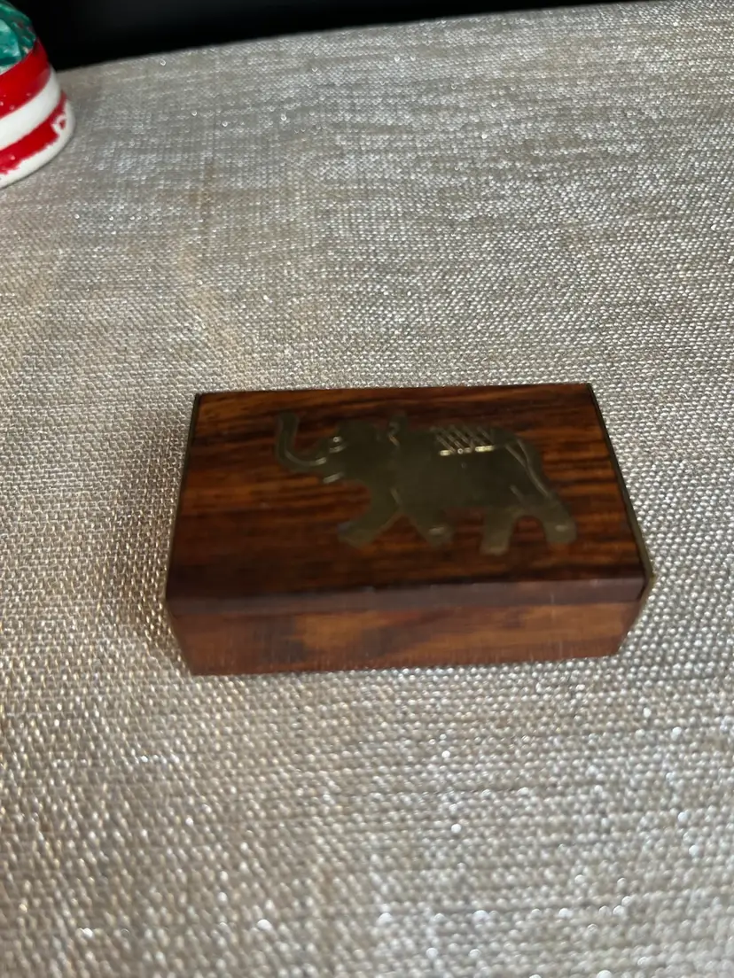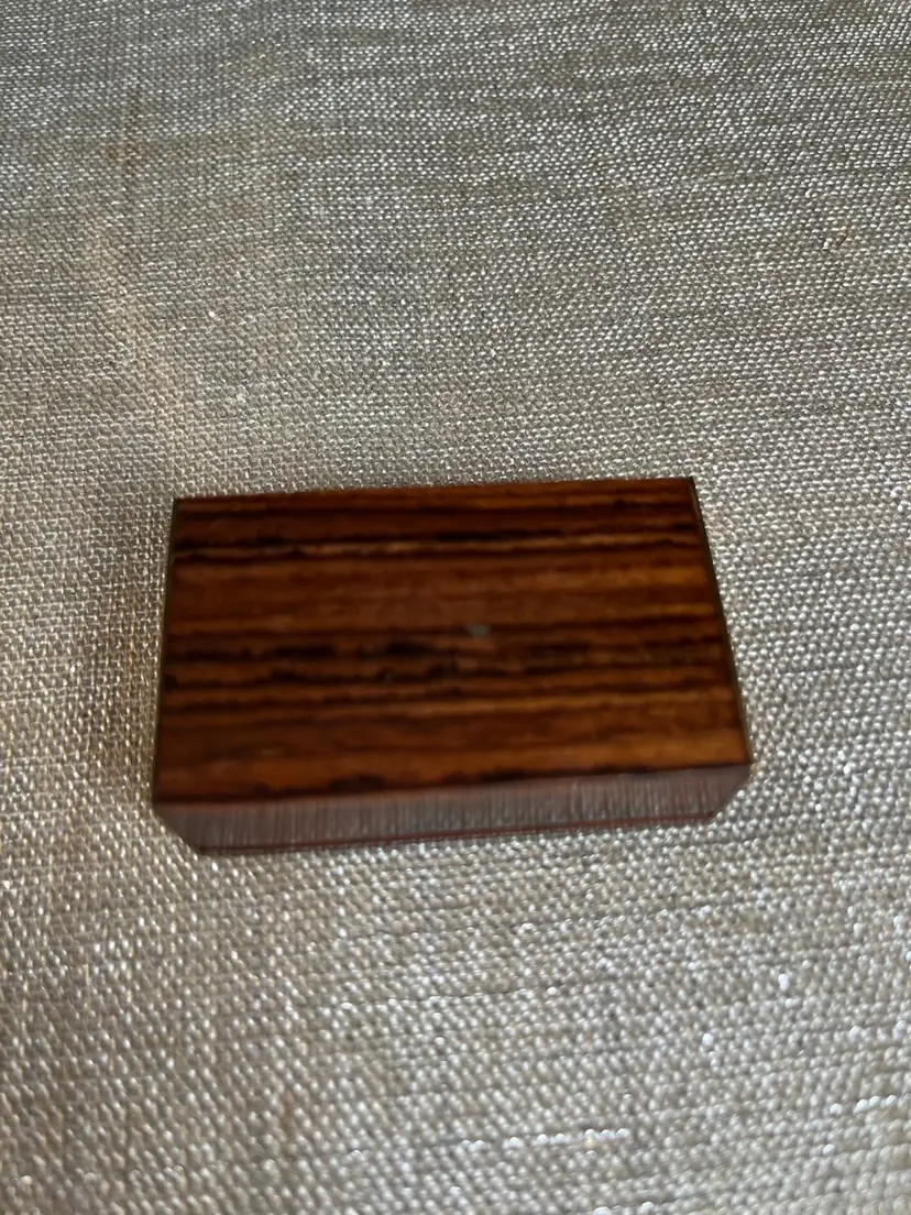 This is very well crafted. Beautiful wood grain. Brass has patina. Cute as can be. Measures approx .75"H, 2.25"W, 1.25" Deep, 1.3 Oz.