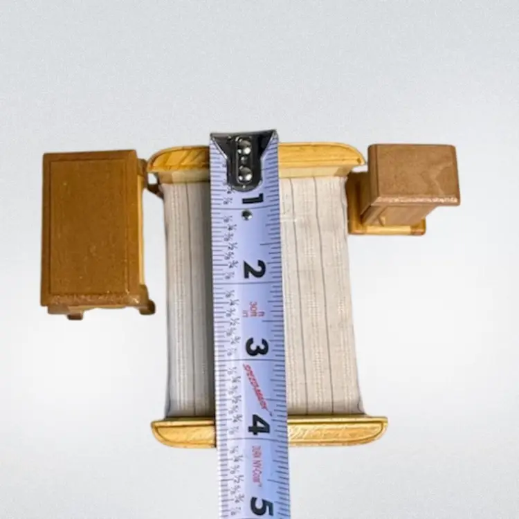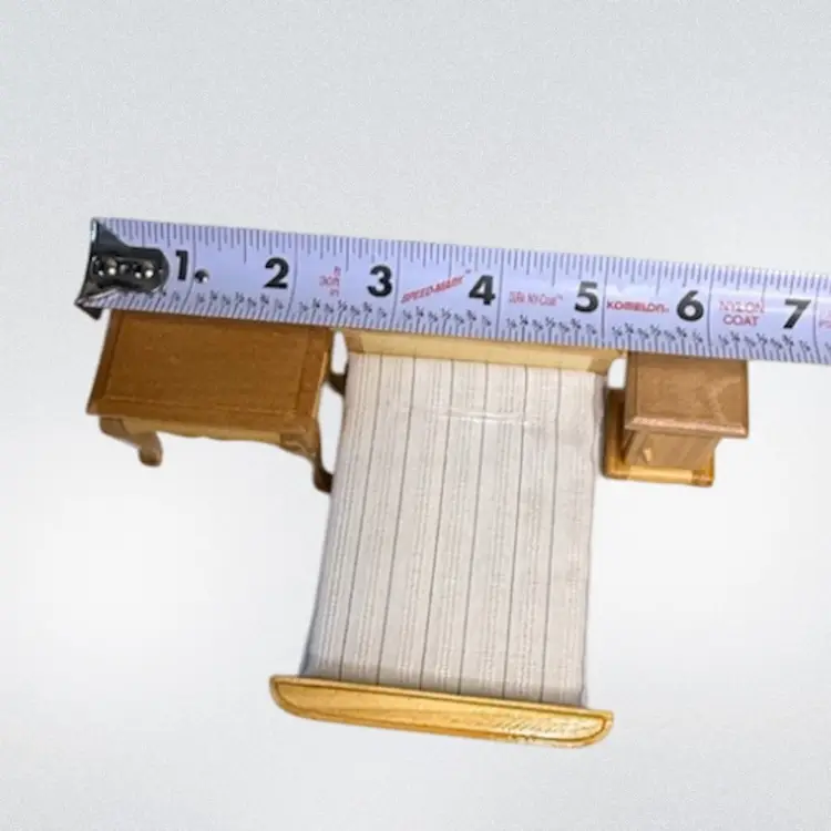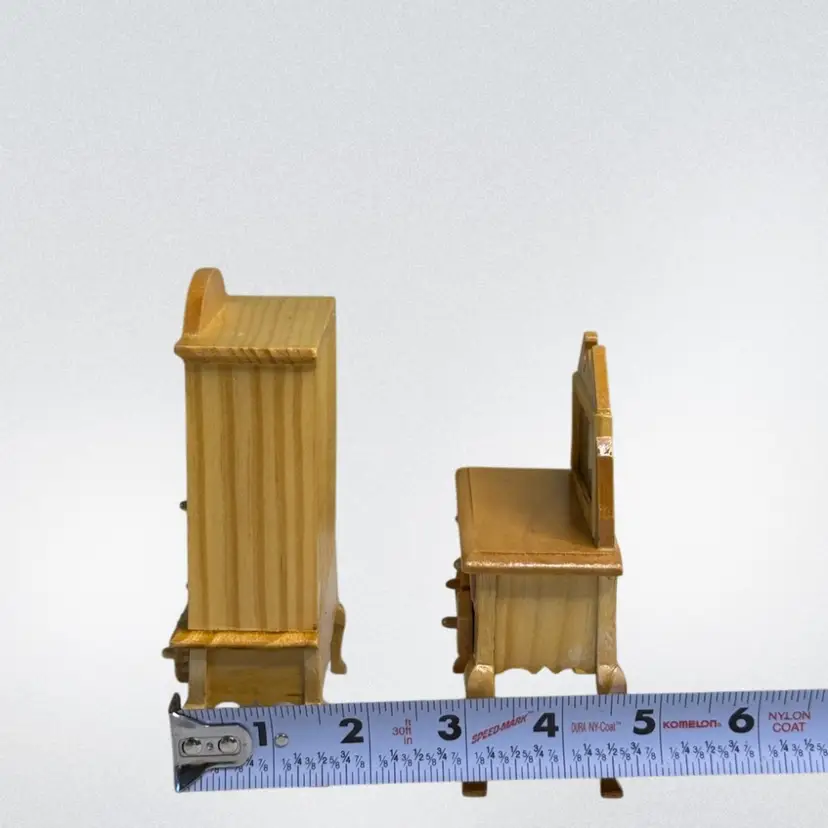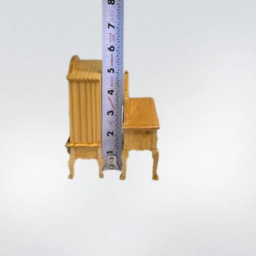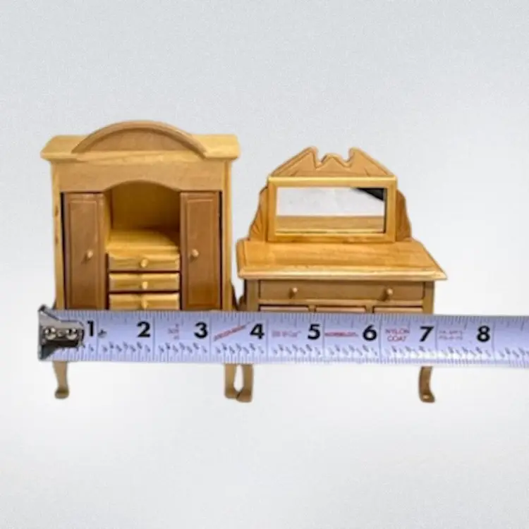 Set includes: Dresser with mirror: 4 1/2” T x 3 1/2” L x 1 5/8” W. Armoire/Hutch: 5 1/2” T 3 1/2” L x 1-1/2” W. Table: 1 3/4 T x 2 1/8” L x 1 3/4” W. Nightstand: 1 5/8” T x 1 1/4” L x 1” W. Measurements are approximate, please see pictures for condition and measurements as they are part of the description.