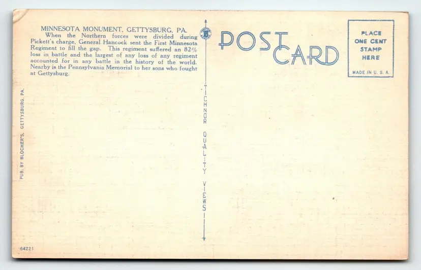 Number of Items in Set: 1 Unit of Sale: Single Unit Artist: Unknown Occasion: Sayings & Quotes Size: Standard (5.5 x 3.5 in) Signed: No Custom Bundle: No Year Manufactured: 1940 Material: Paper City: Gettysburg Original/Licensed Reprint: Original Franchise: Does Not Apply Brand/Publisher: Tichnor Brothers Subject: Monuments Continent: North America Type: Linen Postcard Era: Linen (1930-1945) Region: Pennsylvania Country: USA Theme: Architecture, Art, Cities & Towns, Community Life, Greetings, Roadside America, Social History, buildings, Monument Features: Divided Back Time Period Manufactured: 1950-1959 Country/Region of Manufacture: United States Postage Condition: Unposted