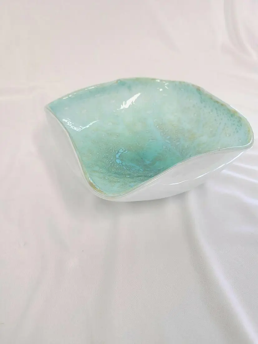 Mint Green glass bowl beautiful mint green and gold color design about 7" wide and 2.75" tall great condition, no chips or cracks
