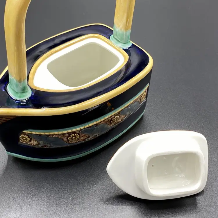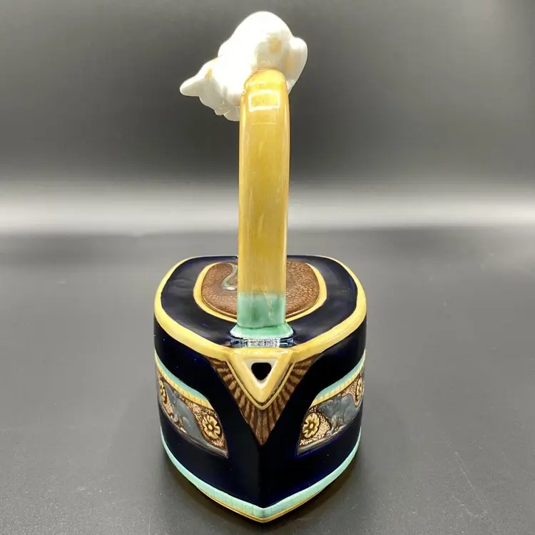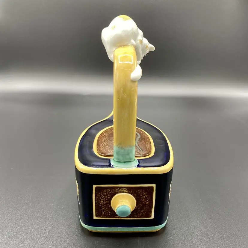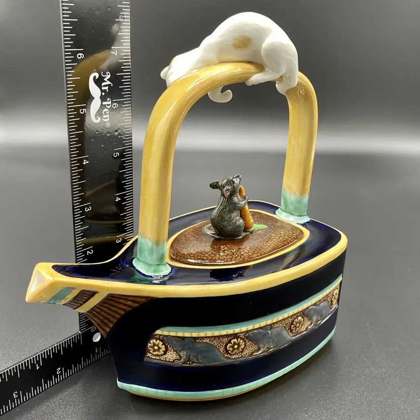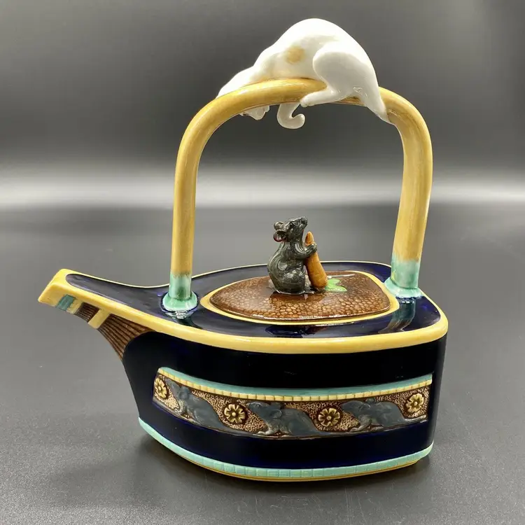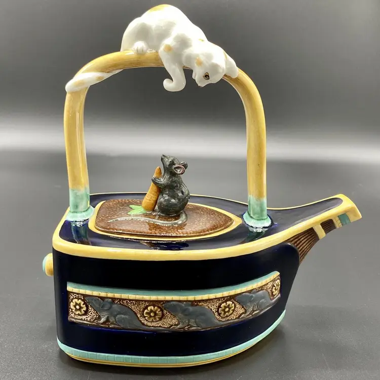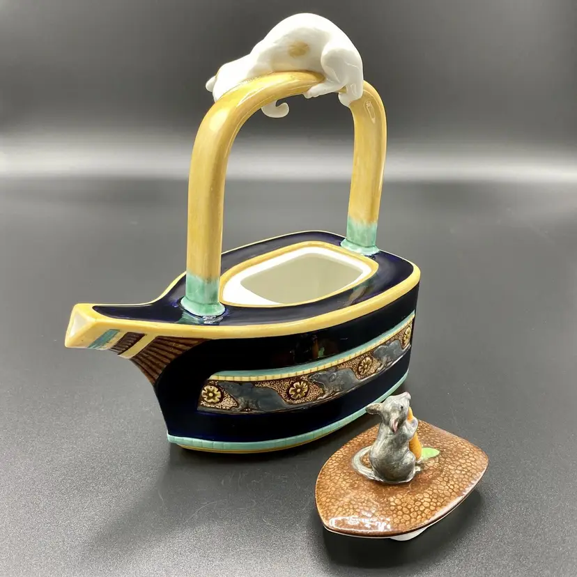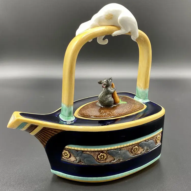 "Cat & Mouse" Majolica teapot, blue Drakkar-shaped. The bow of the boat forming the spout, the boat is decorated on sides with a mice frieze. On the yellow handle, a red and white cat is staring a mouse holding a carrot that decorates the removable lid.