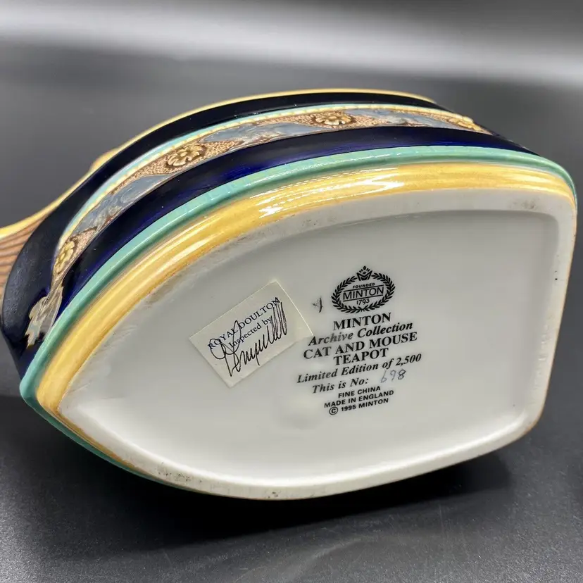 Minton supplied many famous institutions during the 19th century for both art porcelain pieces and also encaustics tiles. Minton exhibited pieces at the Great Exhibition of 1851, received a gold medal in 1855 for the Exposition Universelle in Paris, and had prestigious clients like Queen Victoria. The manufactory was internationally renowned and was knew for several specialties, China bone, Majolica, Parian ware, and Japonism ware and Secessionist ware, circa 1970 the company merged with others like Royal Doulton then eventually disappeared in 2005.
