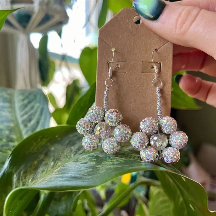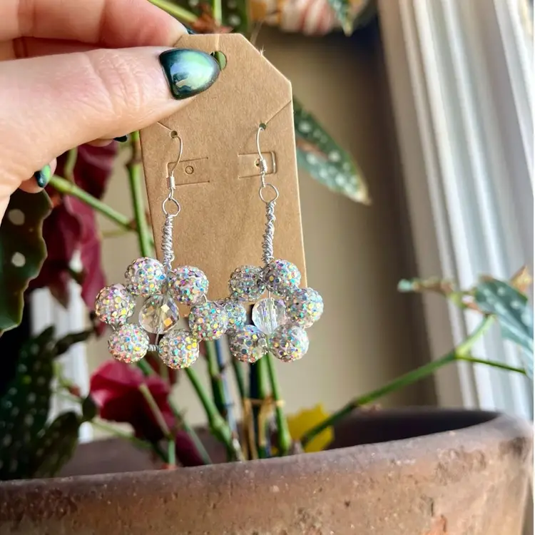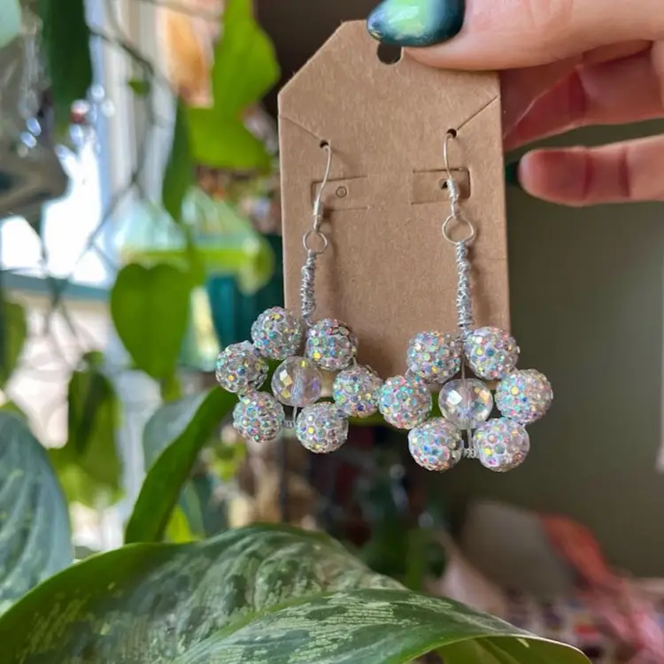 These Mirrorball earrings were handmade by me! They are made of two high quality crystal glass beads, Mirrorball beads, and lots of love 🫶🏼