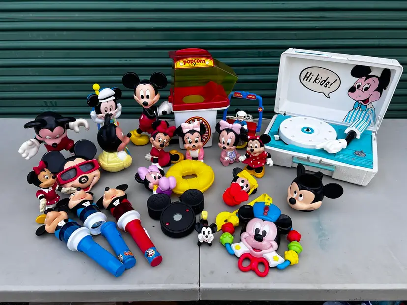 Mixed lot of miscellaneous rubber toys, banks, baby electronic toys all Mickey & Minnie Mouse themed.