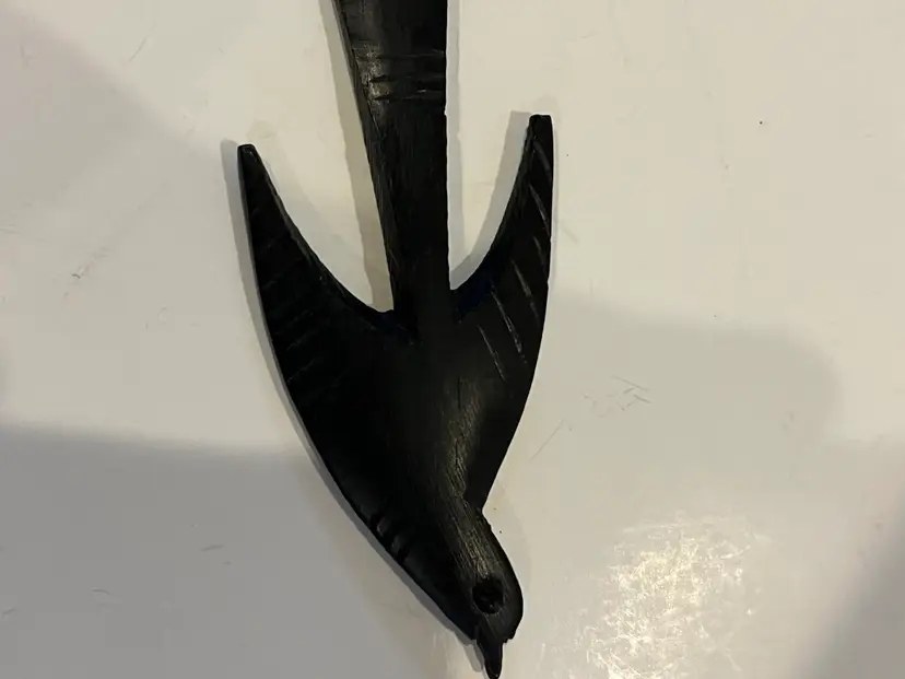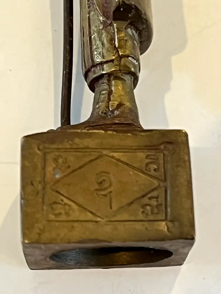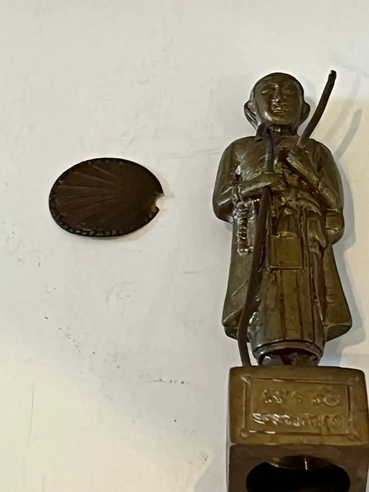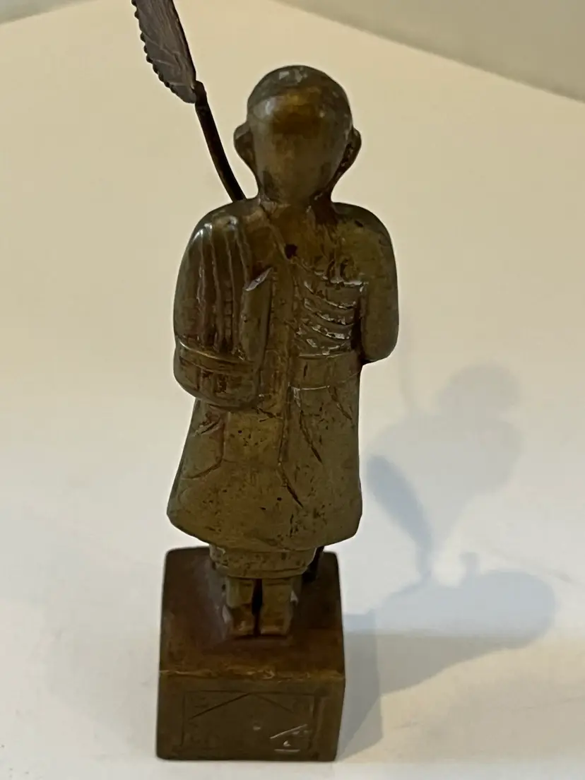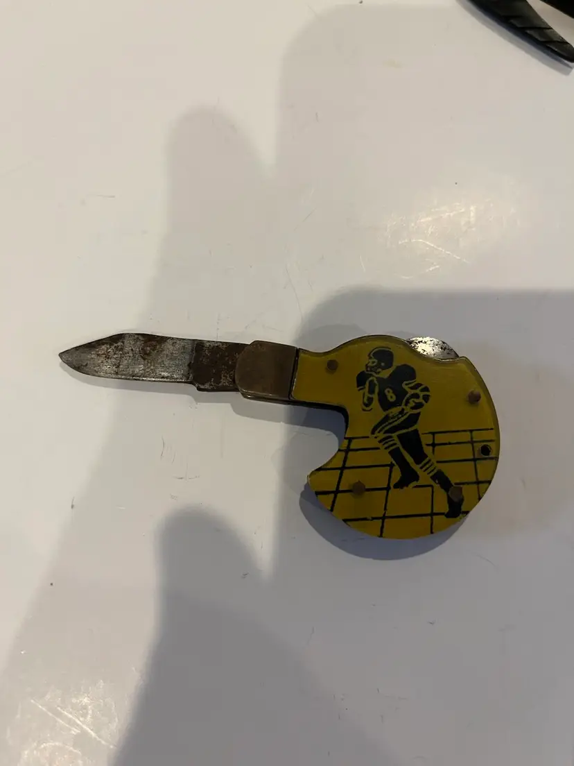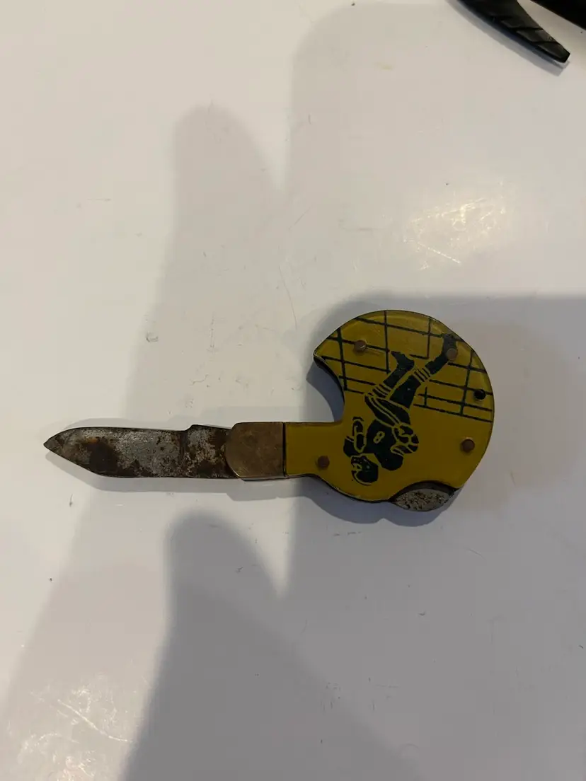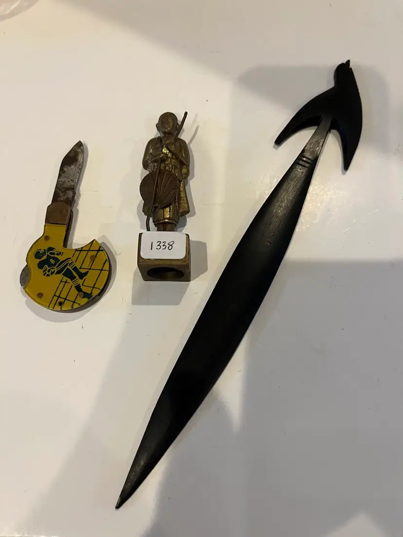 See photos, knife is rusting not able to read maker’s mark, wooden letter opener with bird approximately 10 inches, brass figure is 3.5 inches fan broke off