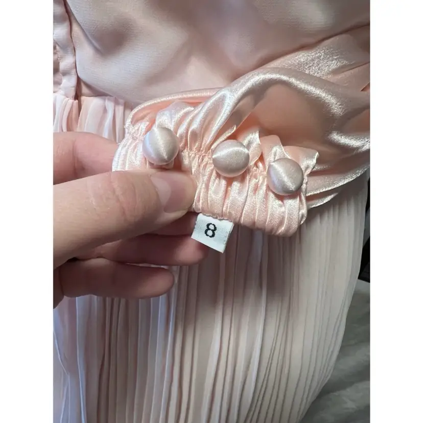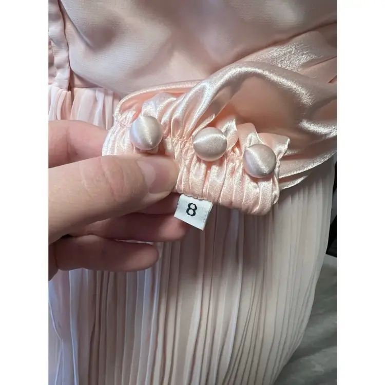 Missing size tag but belt says size 8. Measurements taken laying flat and are approximate. Bust 18” Waist 12-14” at stretch Hips 21” Length 46”